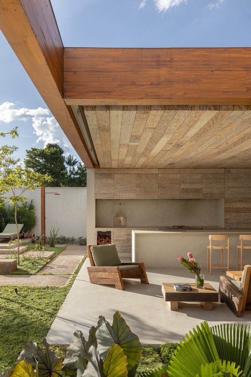 O resultado é uma casa horizontal, ampla e fluida, onde o jardim se torna o protagonista. Os ambientes se conectam visual e fisicamente por meio de grandes vãos e portas de correr que se abrem por inteiro, permitindo a integração total entre sala de jantar, sala de TV e varanda gourmet.