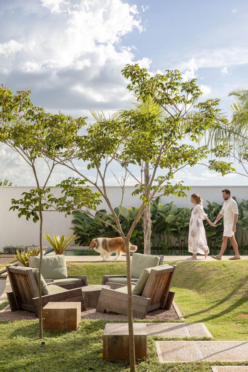Os moradores pediram uma brinquedoteca para as filhas, que no futuro poderá se transformar em um quarto, além de um espaço de meditação e uma área externa com muito verde. O paisagismo integra-se à arquitetura por meio de um jardim com lago, árvores e áreas de estar, que se estende até a piscina revestida em vidrotil verde com uma delicada cascata. A água vem do próprio lago, passando por baixo da piscina e criando uma conexão visual encantadora, especialmente para quem a observa da suíte do casal.