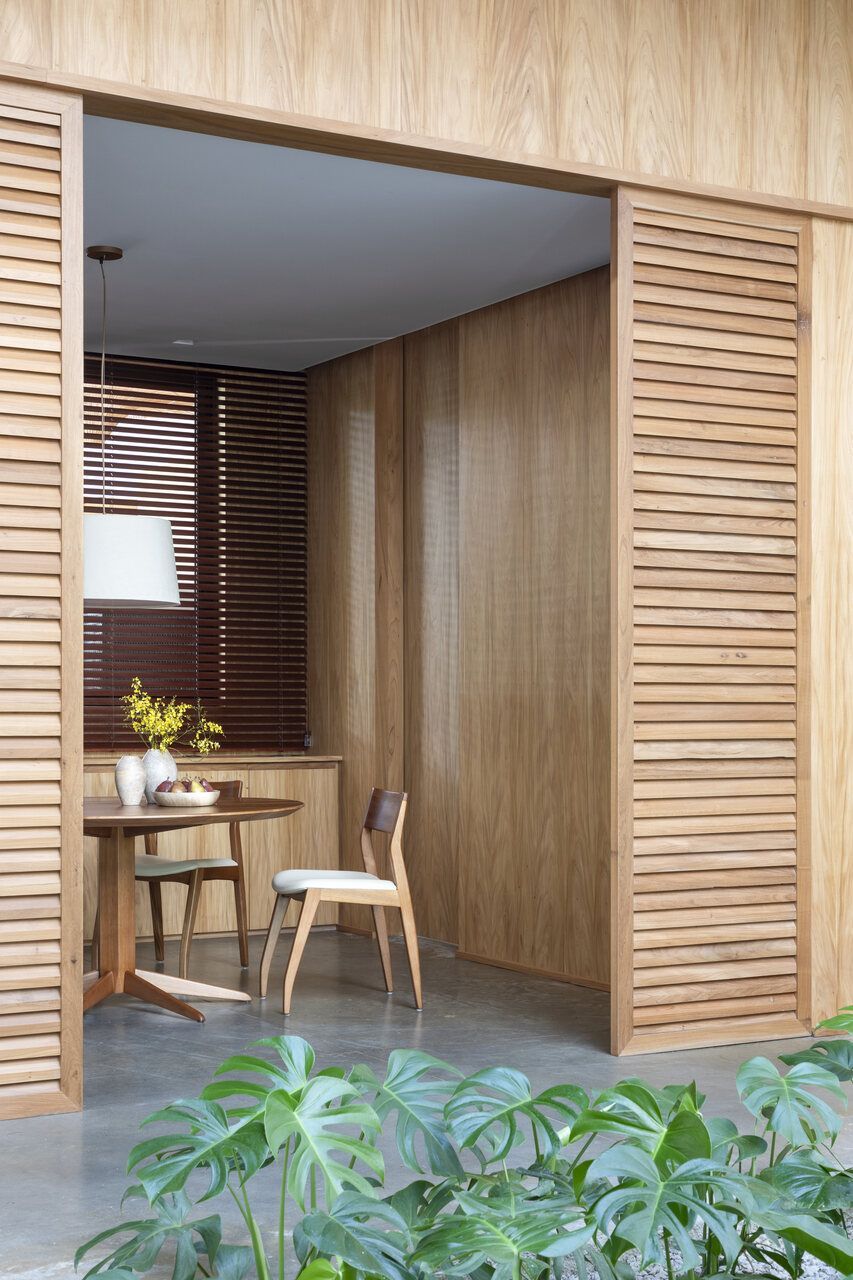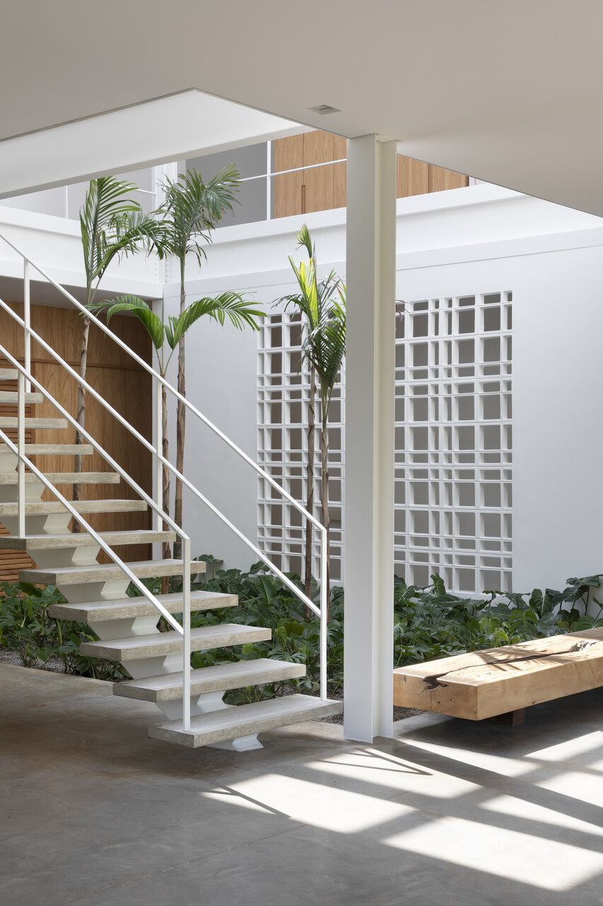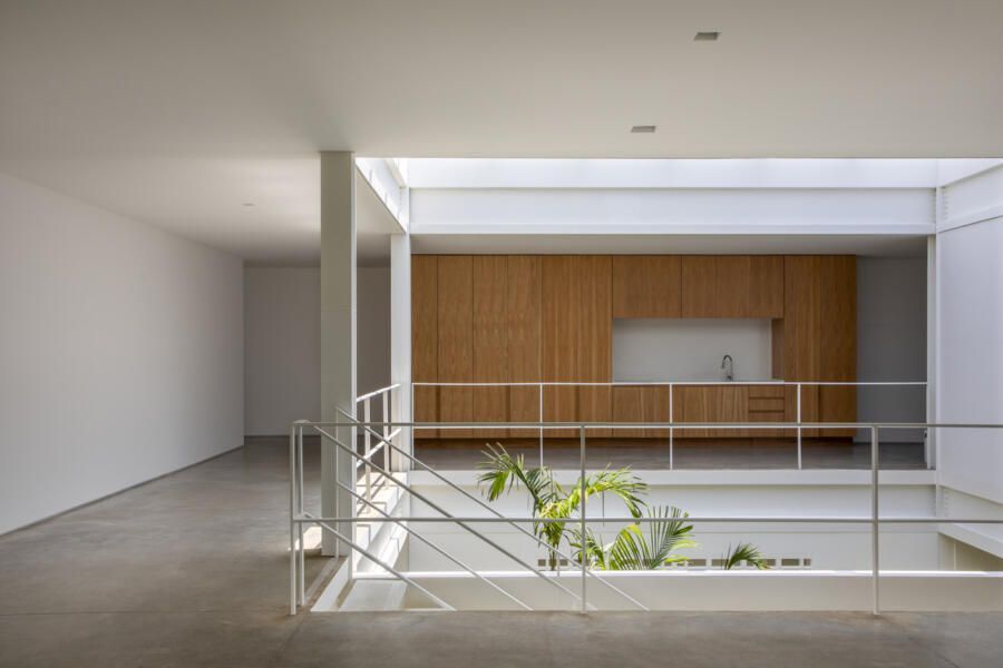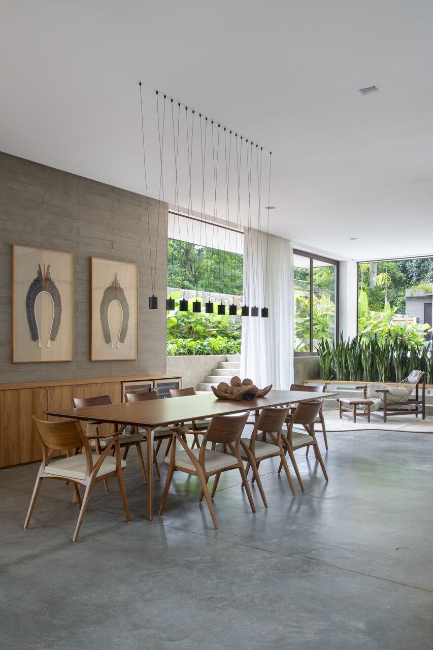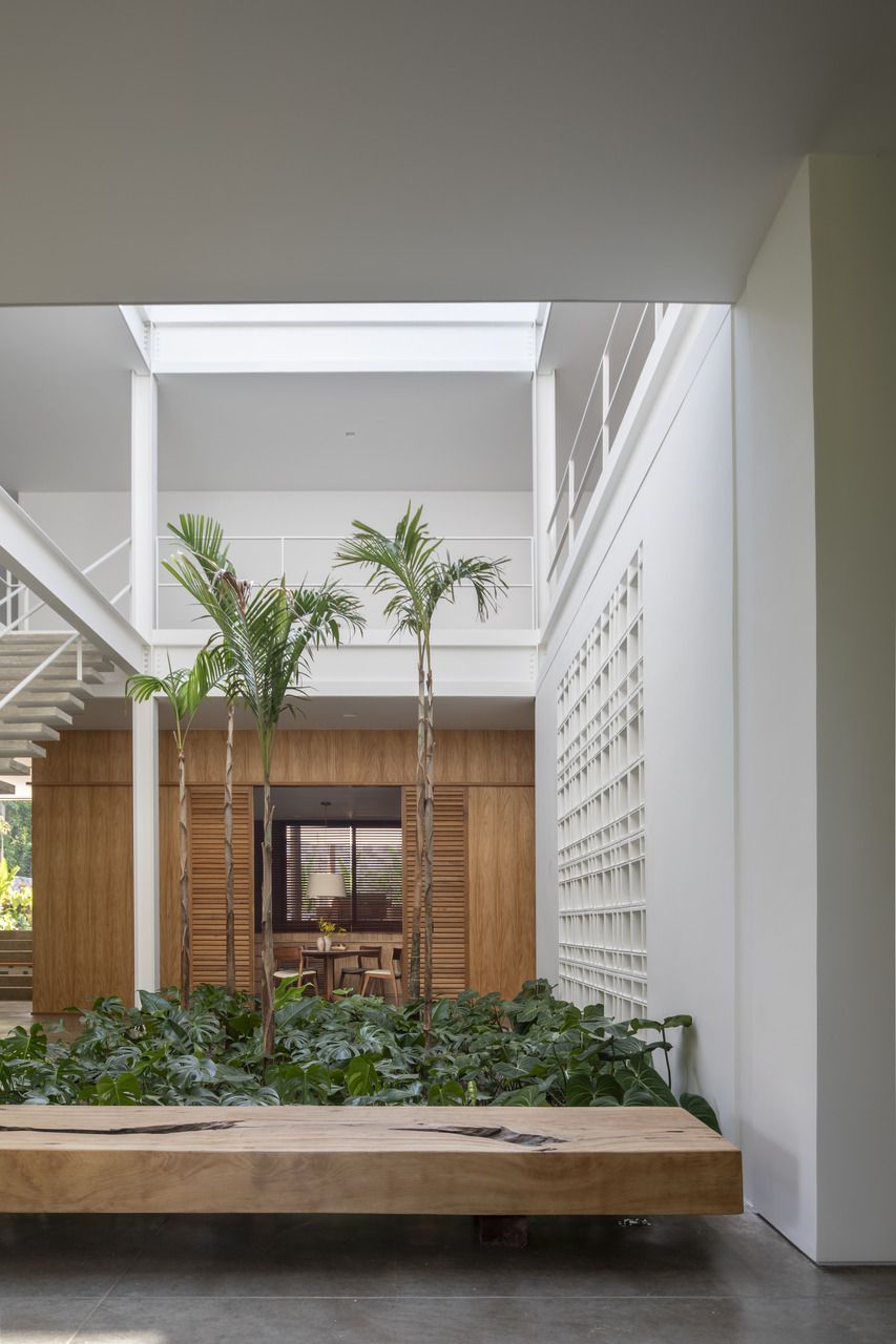A proposta principal do projeto foi dissolver os limites entre interior e exterior. Grandes aberturas, jardins integrados e generosas entradas de luz natural reforçam essa conexão. No centro da casa, um jardim de inverno com pé-direito duplo e claraboia organiza a área social, composta por sala de estar, sala de jantar e cozinha, todos com vista para a mata.