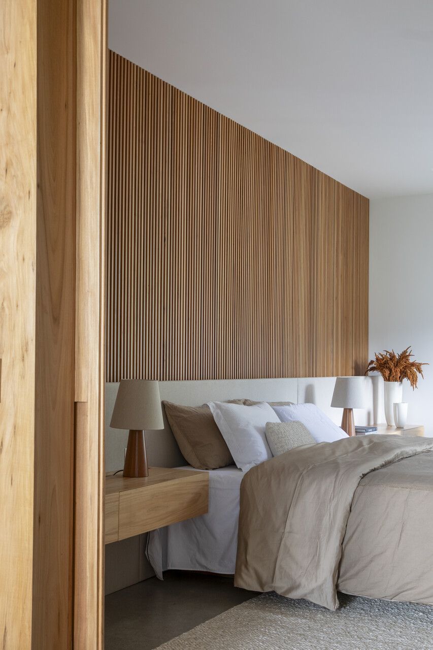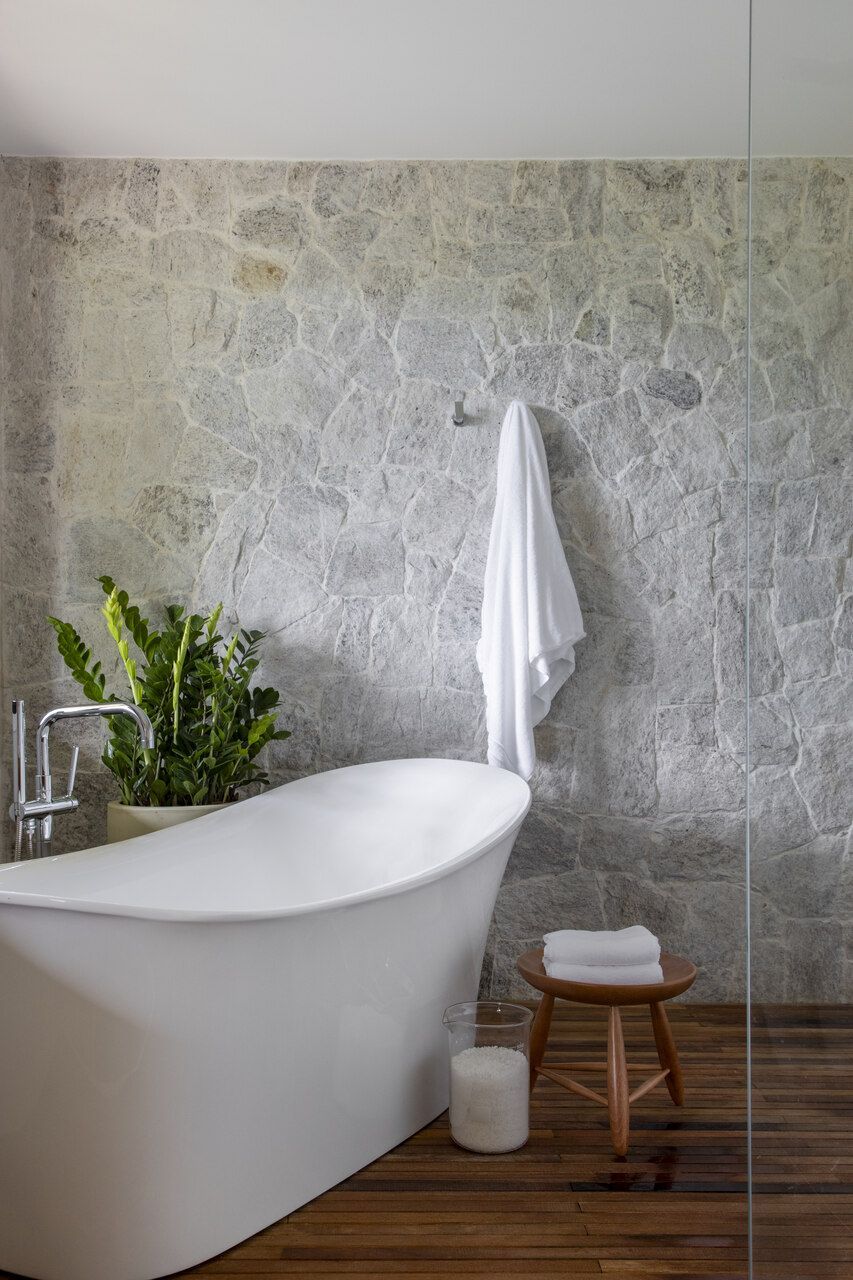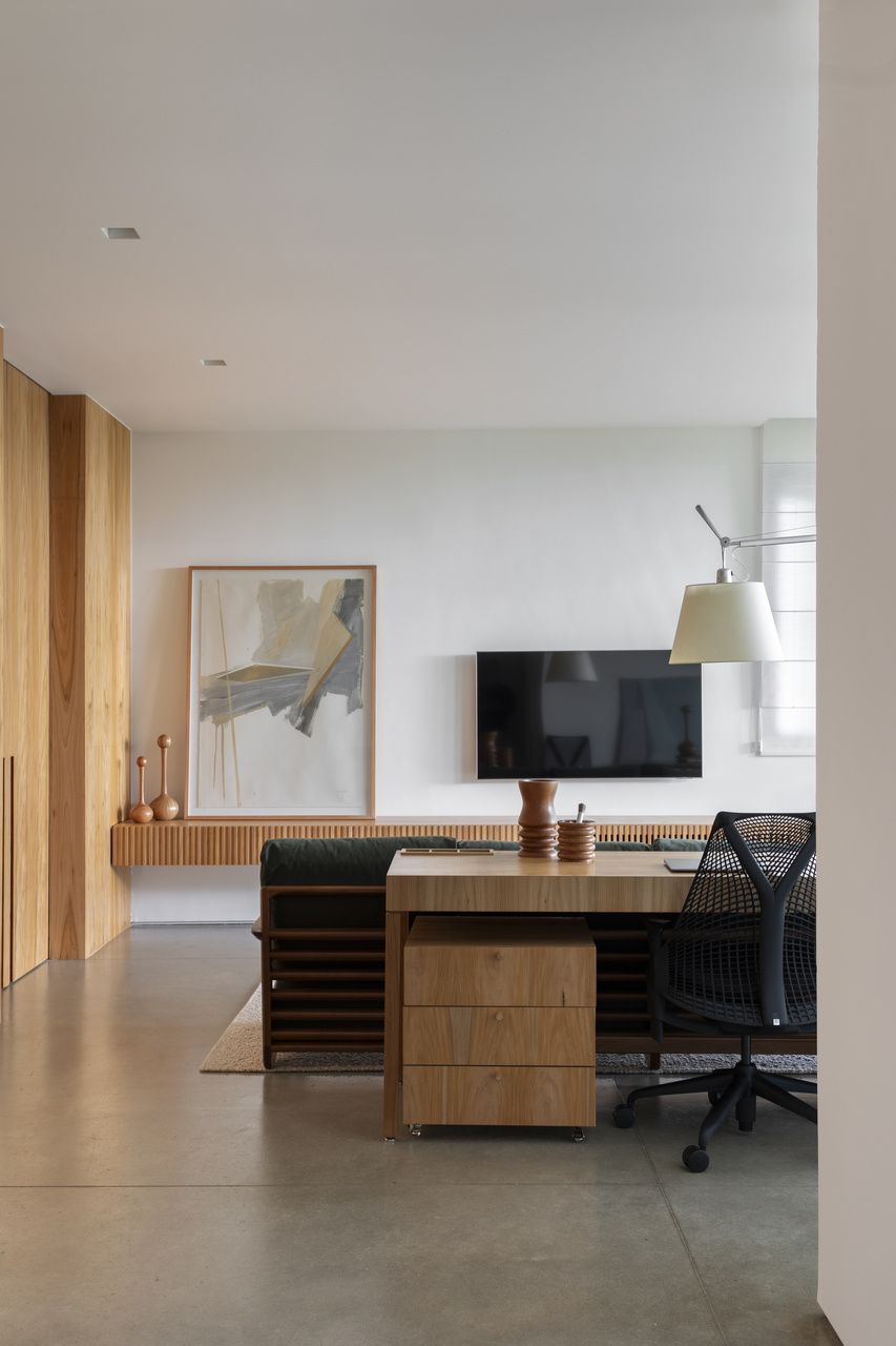 A suíte principal, com 110m², é um núcleo independente com quarto, sala íntima, escritório, varanda, closet e banheiro. Os acabamentos naturais – madeira, pedra bruta e juta – associados às aberturas generosas criam uma atmosfera de refúgio e bem-estar.