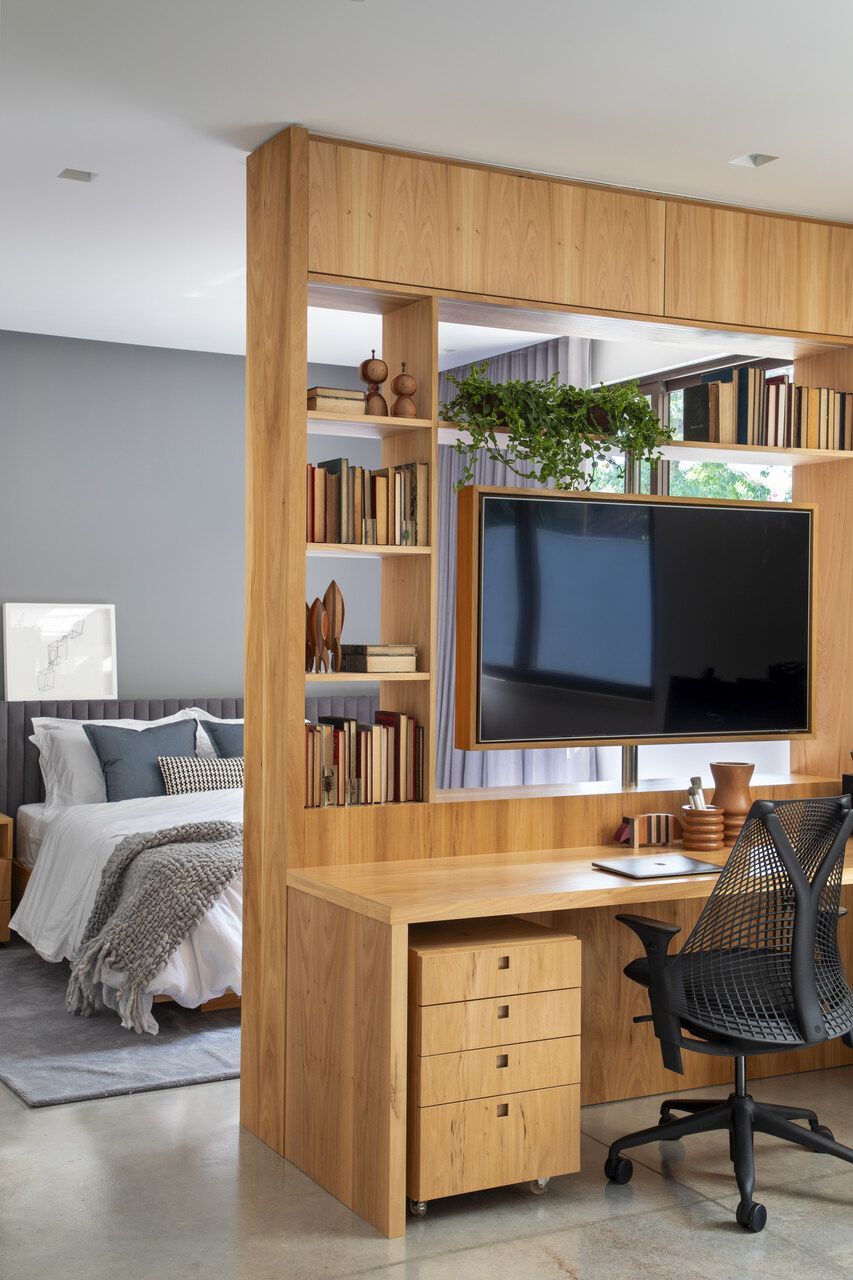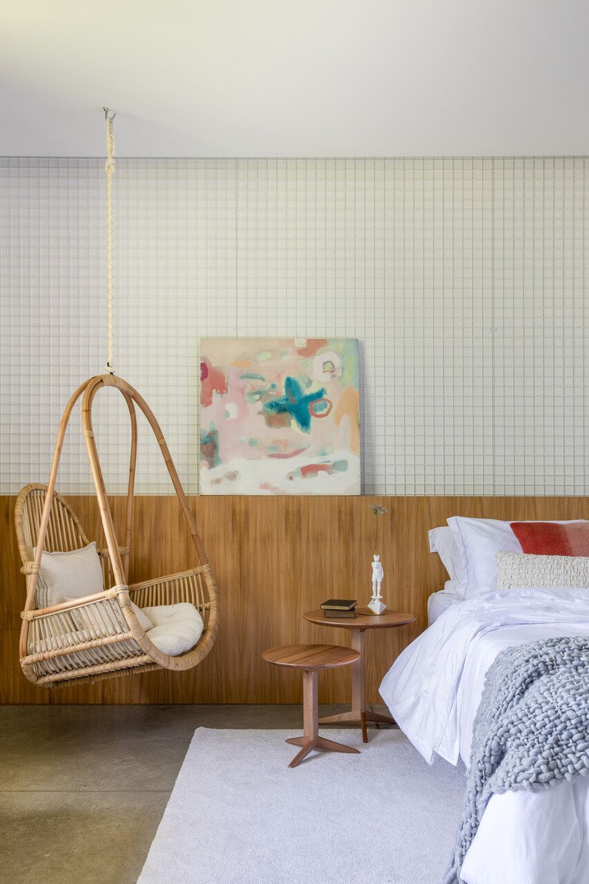 Nos quartos dos filhos, soluções personalizadas refletem a individualidade de cada um. Um deles conta com estante central que separa as áreas de dormir e lazer; outro possui balanço e marcenaria sob medida, reforçando a ideia de conforto sob medida.