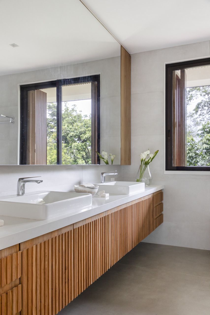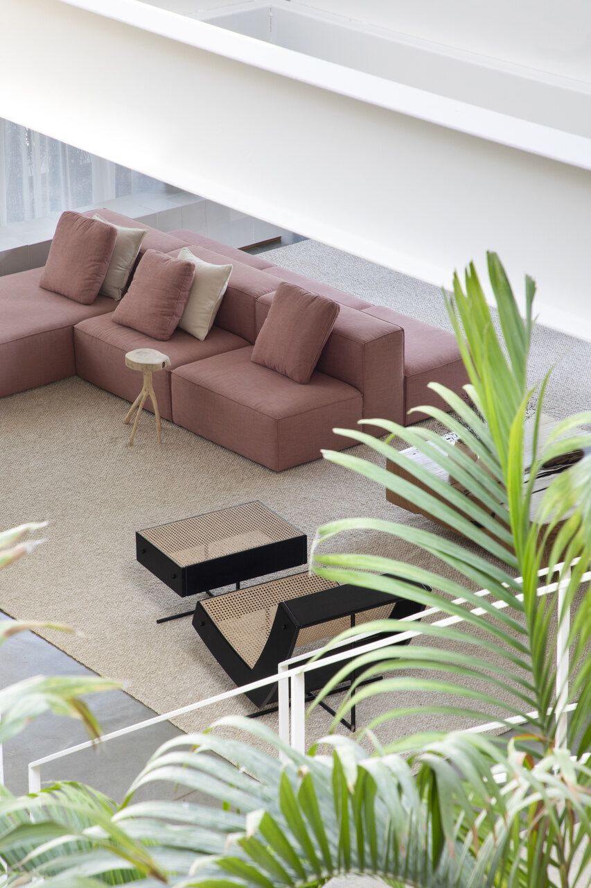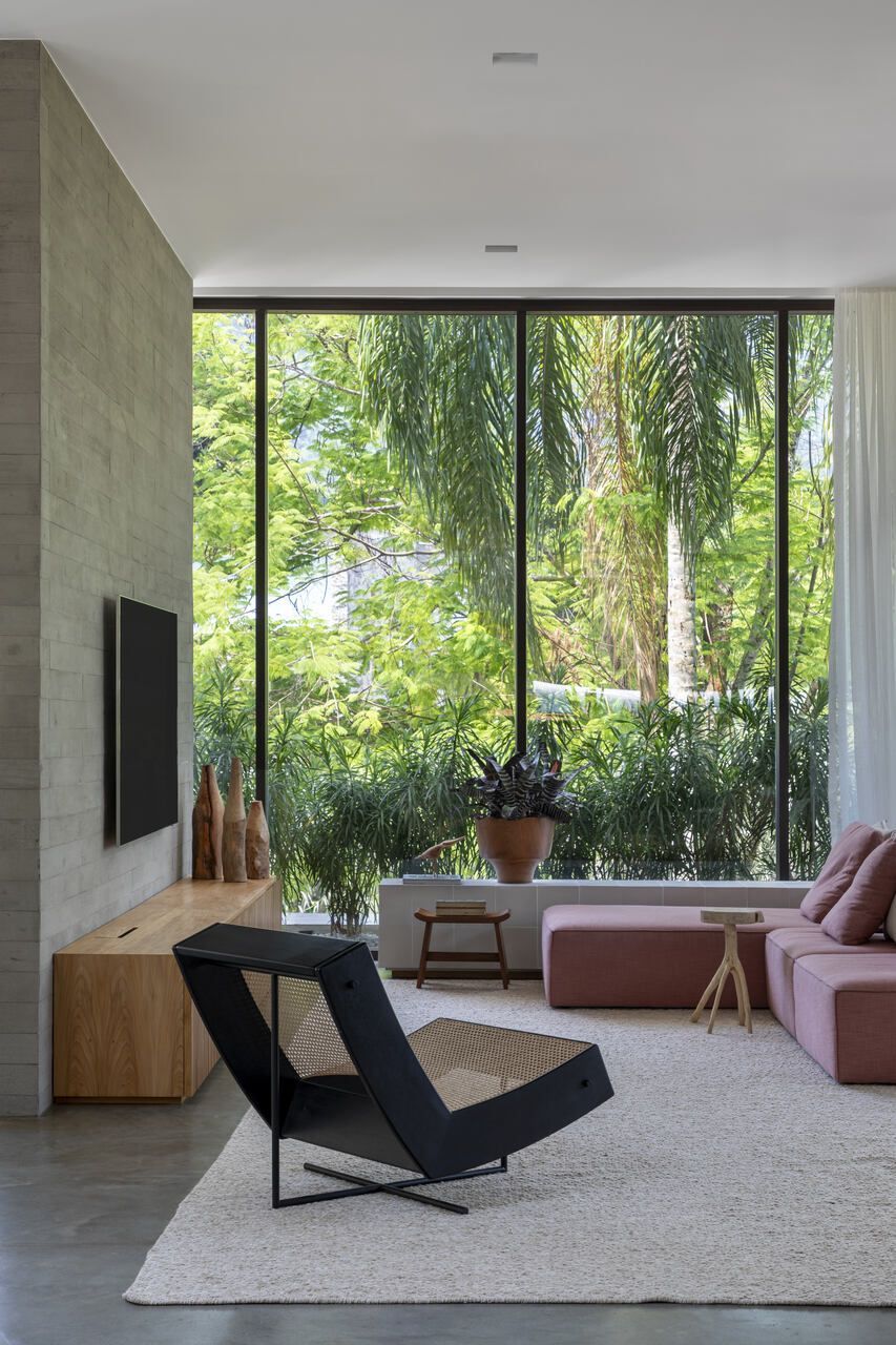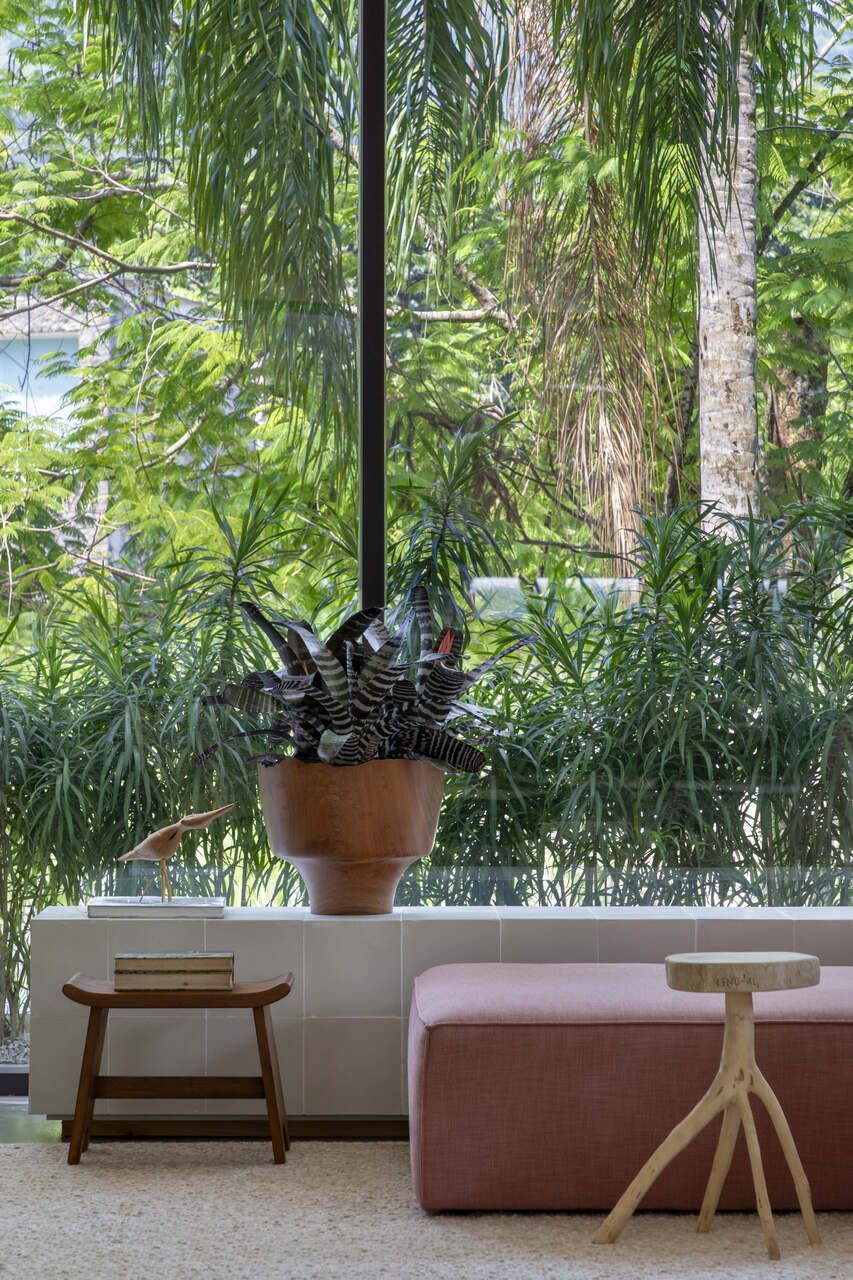 No interior, a base neutra – cimento queimado no piso e paredes brancas – valoriza a presença da vegetação. Cores surgem pontualmente em móveis e objetos, como o sofá rosa da sala e os móveis verdes da varanda da suíte. A curadoria mescla peças de diferentes designers brasileiros, promovendo um diálogo entre gerações.