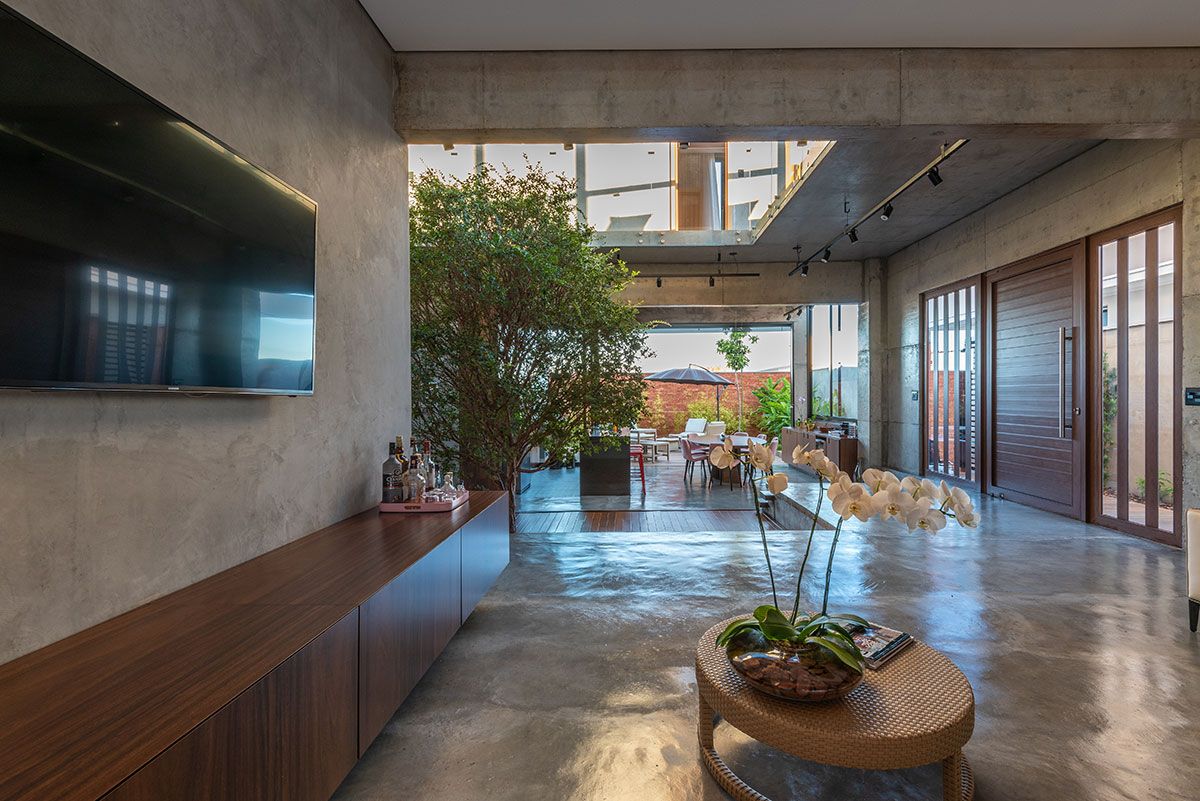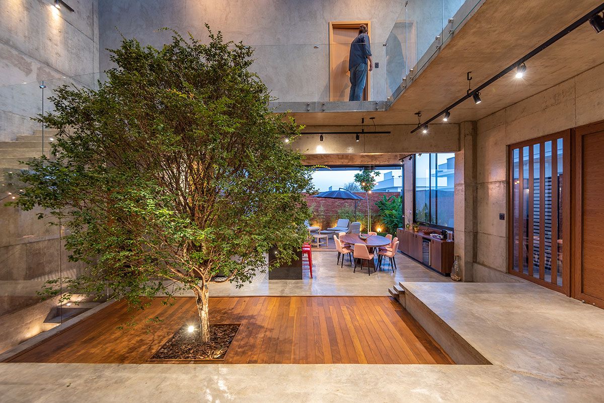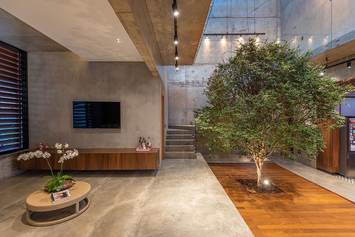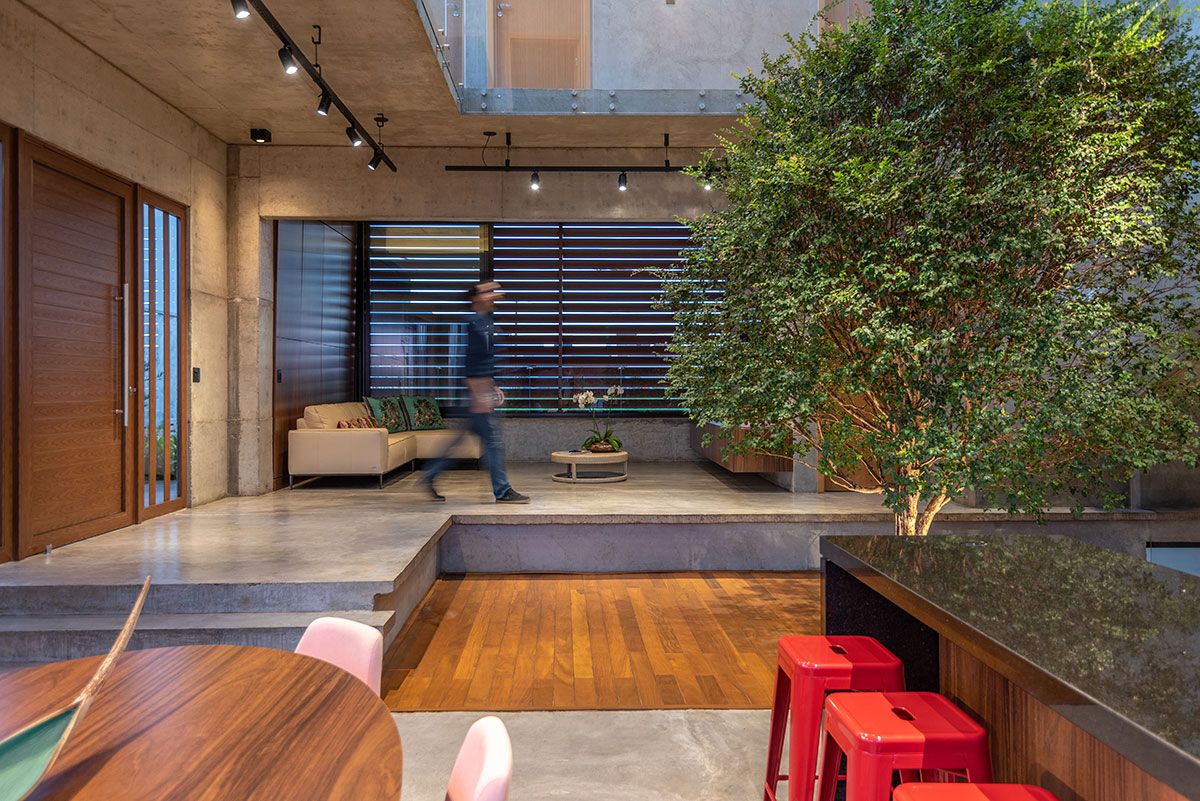 O projeto fortaleceu o jogo do contraste entre o concreto e elementos em madeira cumaru. A junção de ambos materiais proporciona efeito sensorial de conforto e favorece à ergonomia dos moradores. Outro ponto alto é o elemento paisagístico interno/externo que estampa a vontade da residência de ser e estar viva. Para isto, foi inserida no centro do cubo uma Jabuticabeira de cultivo adaptado para ambientes internos.