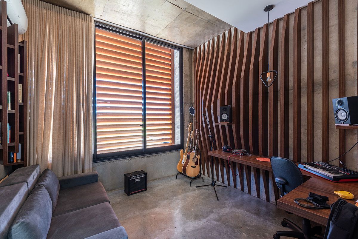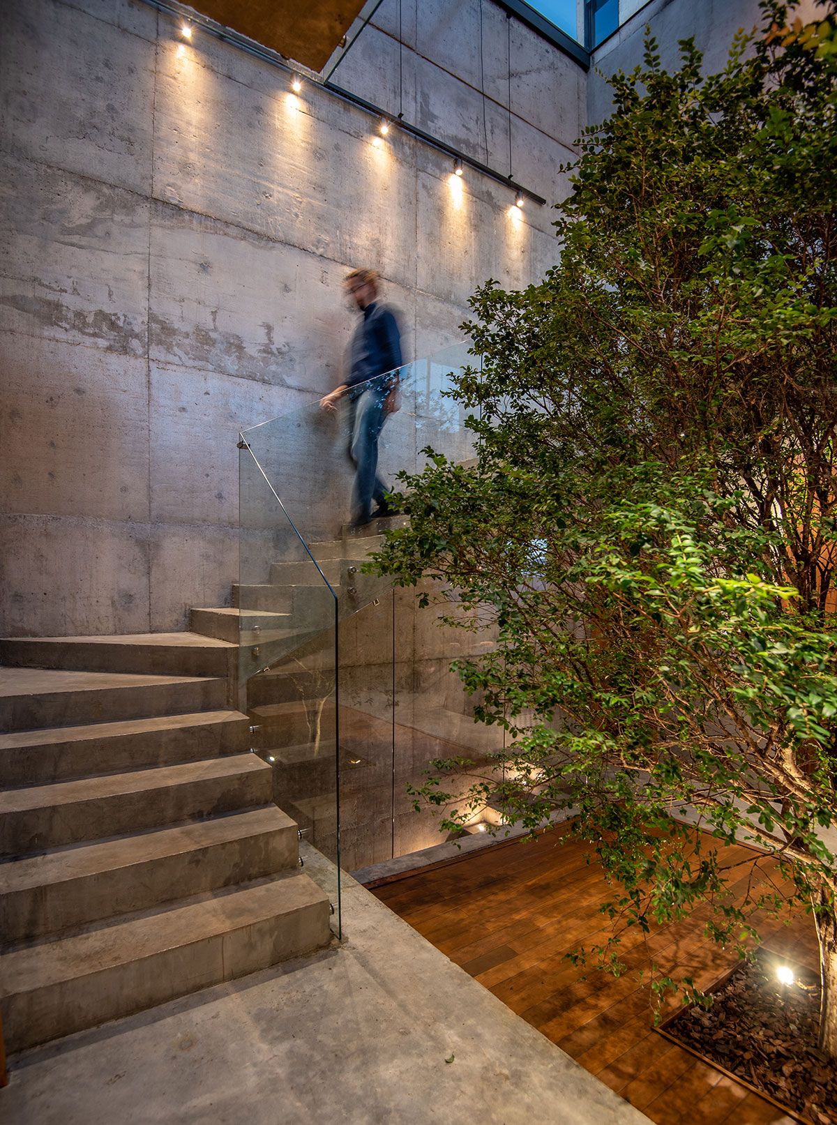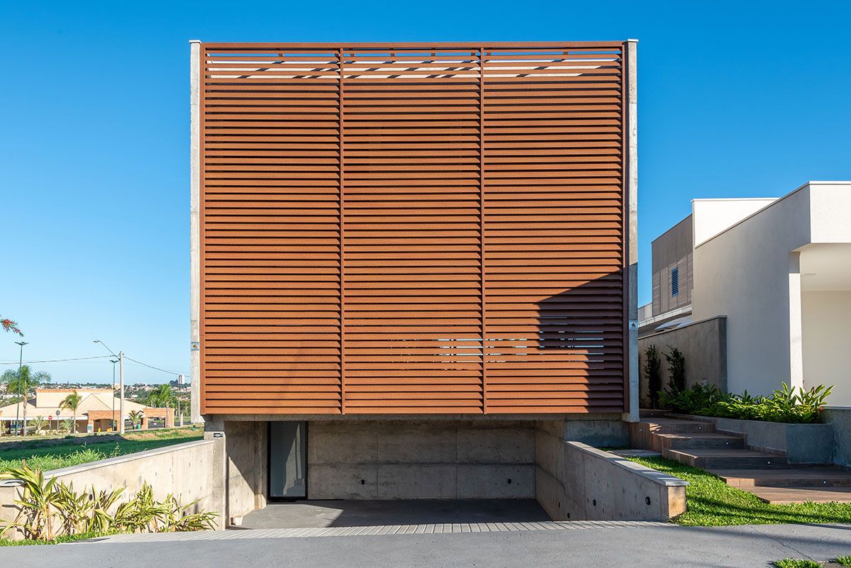 O projeto fortaleceu o jogo do contraste entre o concreto e elementos em madeira cumaru. A junção de ambos materiais proporciona efeito sensorial de conforto e favorece à ergonomia dos moradores. Outro ponto alto é o elemento paisagístico interno/externo que estampa a vontade da residência de ser e estar viva. Para isto, foi inserida no centro do cubo uma Jabuticabeira de cultivo adaptado para ambientes internos.