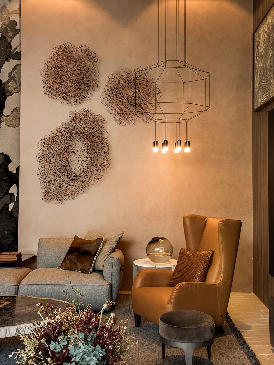 O conforto acústico foi outra grande preocupação do Espaço dos Convidados. Em função do pé-direito alto de 4,30 m, Denise Barretto usou, entre outros recursos, um tapete exclusivo, da coleção Design (Kian), que está suspenso entre as paredes como tapeçaria e elemento de absorção de som, causando impacto e podendo ser visualizado da área externa. Para arrematar o projeto, a iluminação (Sergon Prime) reúne balizadores externos e pontos embutidos com efeito de luz e contraste marcantes, que reforçam a sensação de aconchego do refúgio idealizado por Denise Barretto. No living e na cozinha, quem rouba a cena é a luminária icônica Wireflow, criação do designer Arik Levy para a Víbia, fornecida pela E:light.