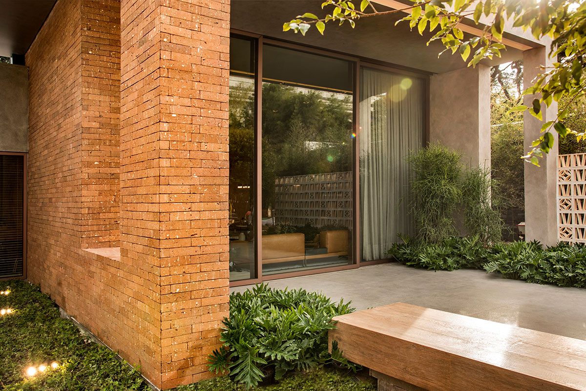 Usamos caixilhos de alumínio com acabamento no tom cobre, lançamento da Tecnofeal, que compõem as três portas de correr com o maior vidro jumbo brasileiro. Cada um mede 4,30 m de altura e pesa cerca de 350 kg