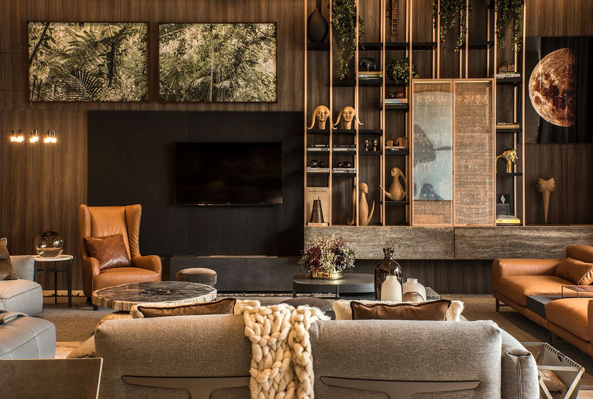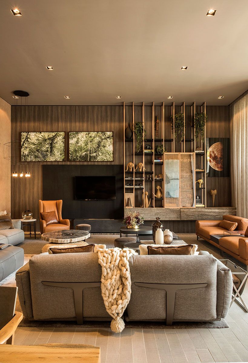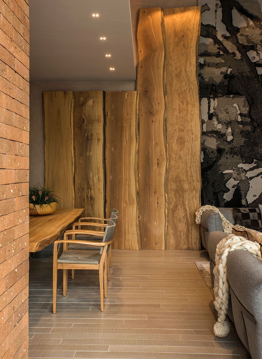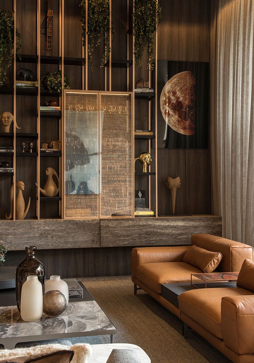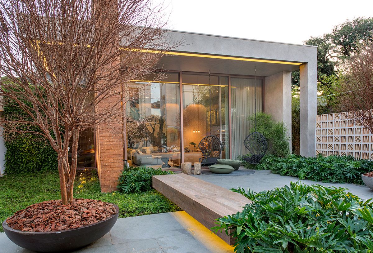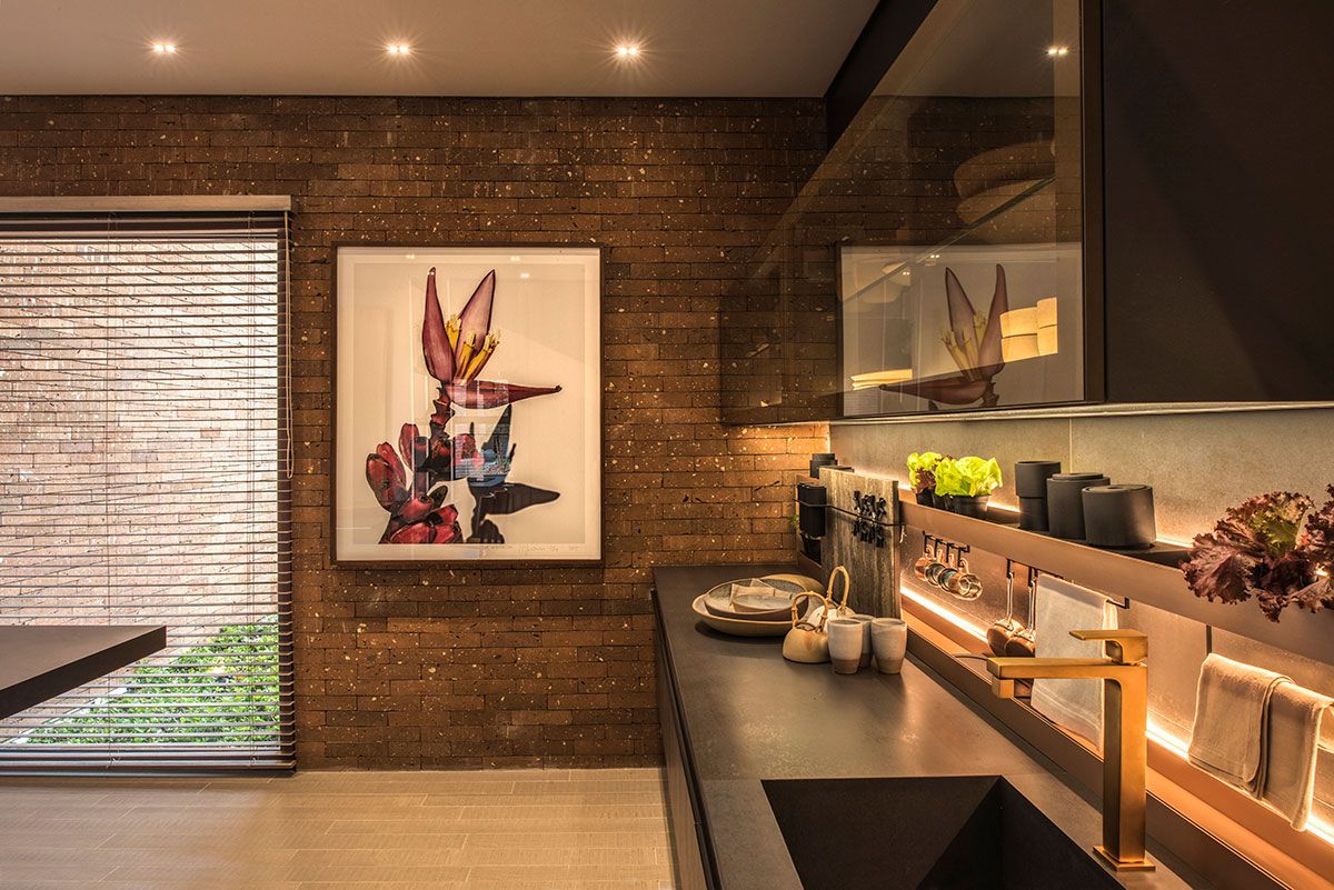No projeto, foram utilizados elementos da natureza para trazer bem estar. Sinônimo absoluto do aconchego, a madeira se multiplica tanto nos painéis da parede do living quanto nos pranchões maciços de pequiá bruto (Tora Brasil) na área gourmet. Seu visual também é fielmente reproduzido pelos porcelanatos do piso, dispostos em réguas e compondo uma bela paginação. Outros materiais naturais, como a pedra e o tijolo, trazem o equilíbrio harmônico de nuances e texturas presentes em superfícies e mobiliário. O resultado é uma mistura de caramelos, telhas, areias, cinzas, pretos e do verde da vegetação. Essa paleta foi intencionalmente selecionada a fim de valorizar ao máximo as diversas obras de arte. Na parte externa, a dupla de balanços de corda suspensos (Tidelli) e as jabuticabeiras em vaso complementam a atmosfera relaxante.