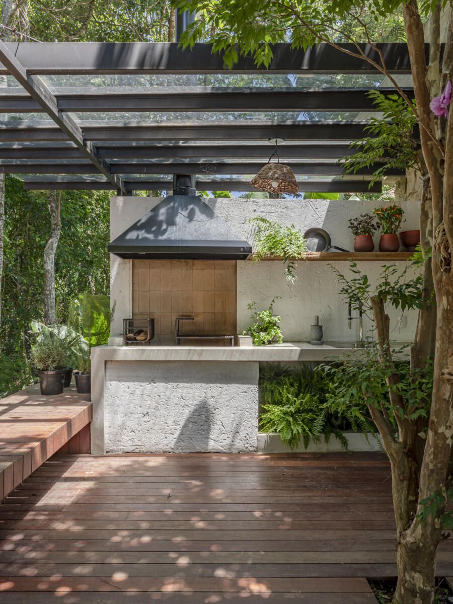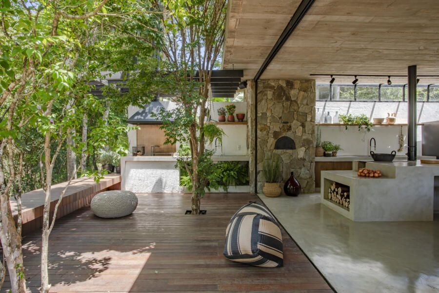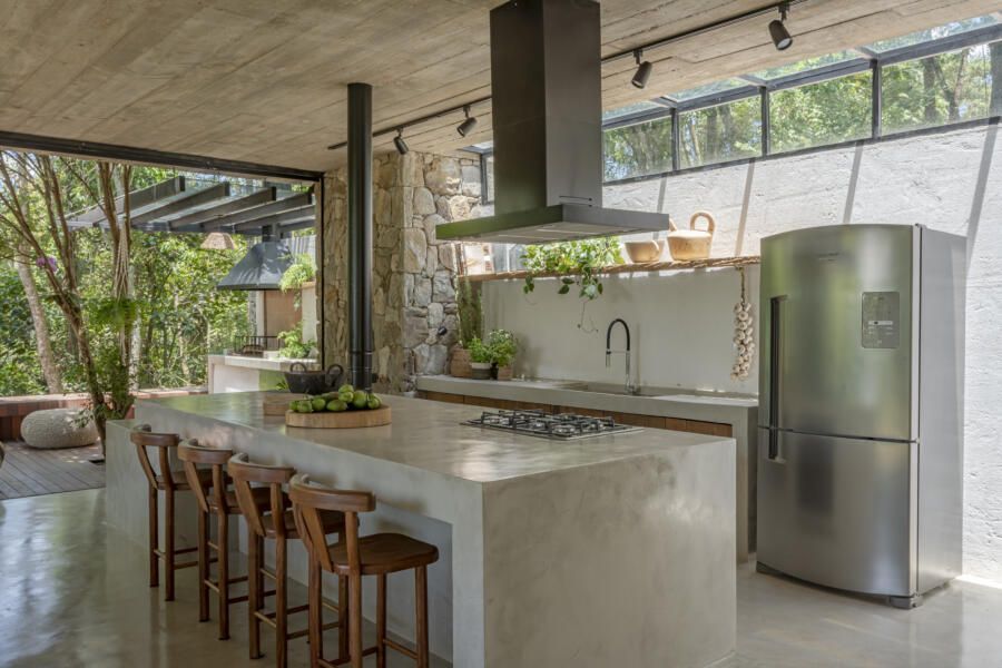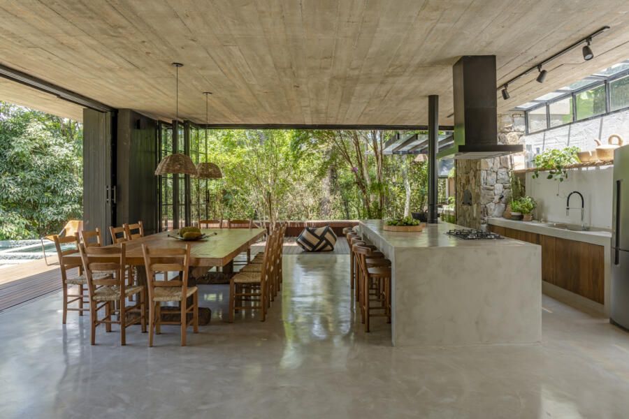 “Criamos um local que pode receber os amigos e familiares em volta de ambientes acolhedores, aconchegantes, sem divisões por paredes, e que permite ainda grande conexão visual com a natureza.”