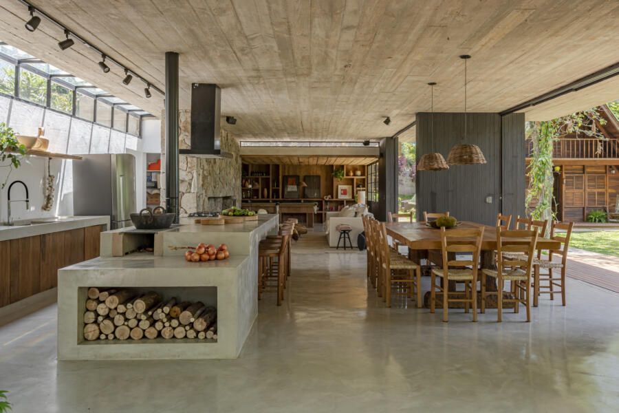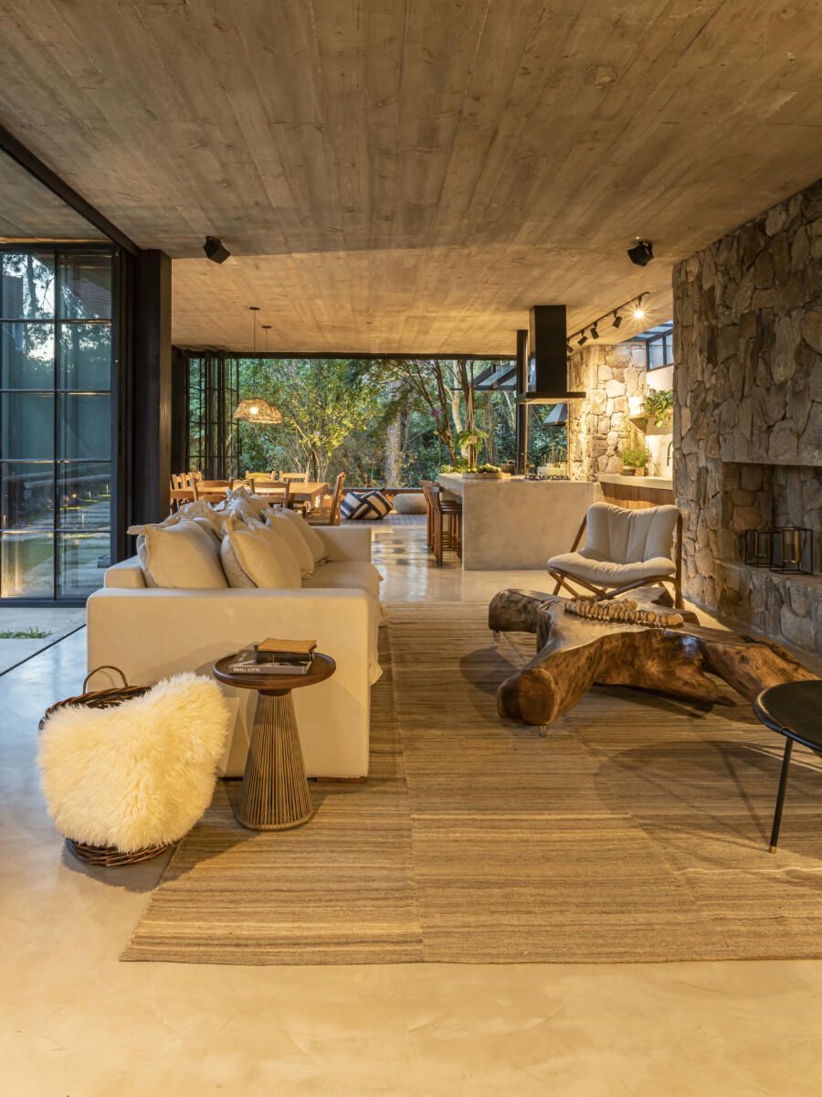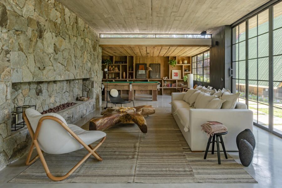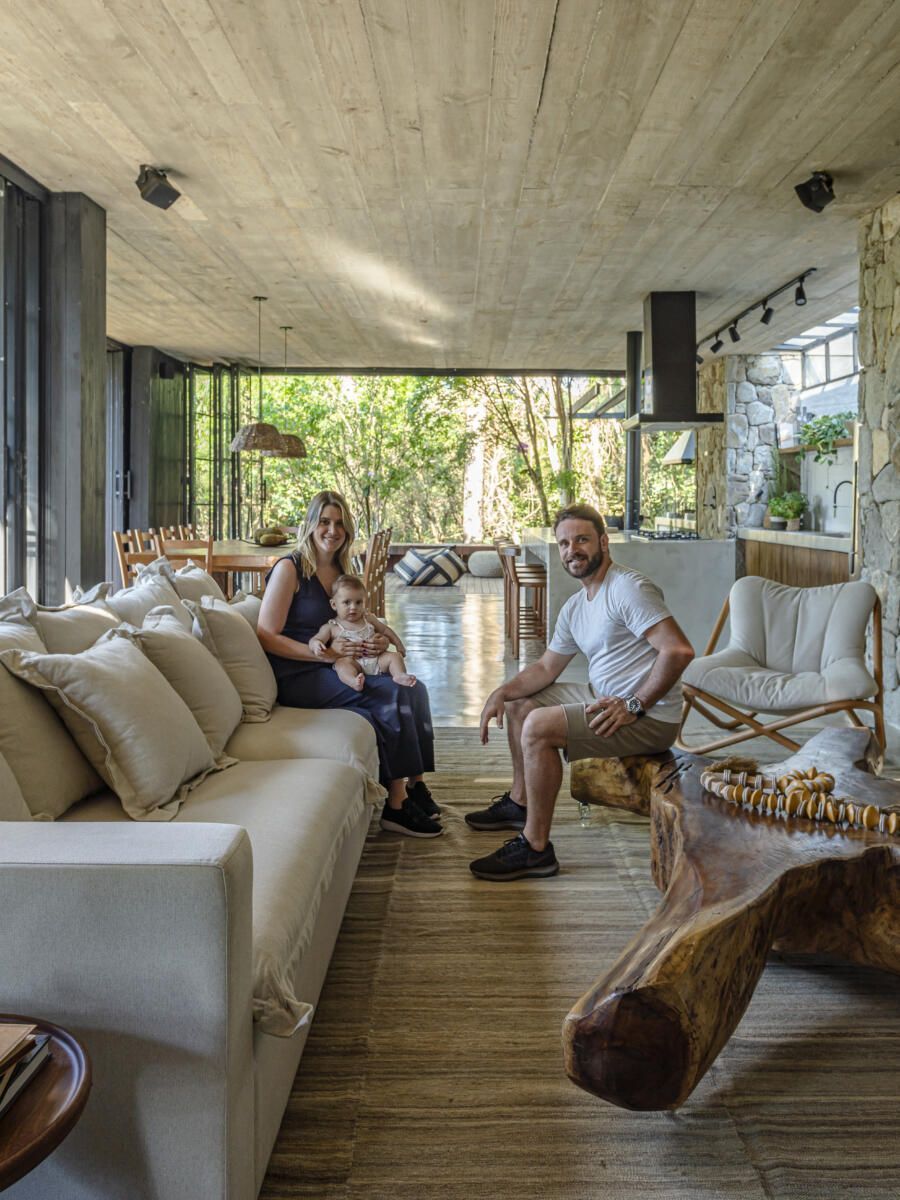 “A criação do projeto foi lado a lado com os clientes. Eles desejavam que apostássemos em materiais naturais, como pedra, concreto e madeira, usando como referência as casas de campo do Uruguai. Algo sem luxo, mas com um visual muito aconchegante voltado para a natureza. Misturando as nossas ideias com as deles, conseguimos chegar no projeto ideal que tanto sonhavam.”