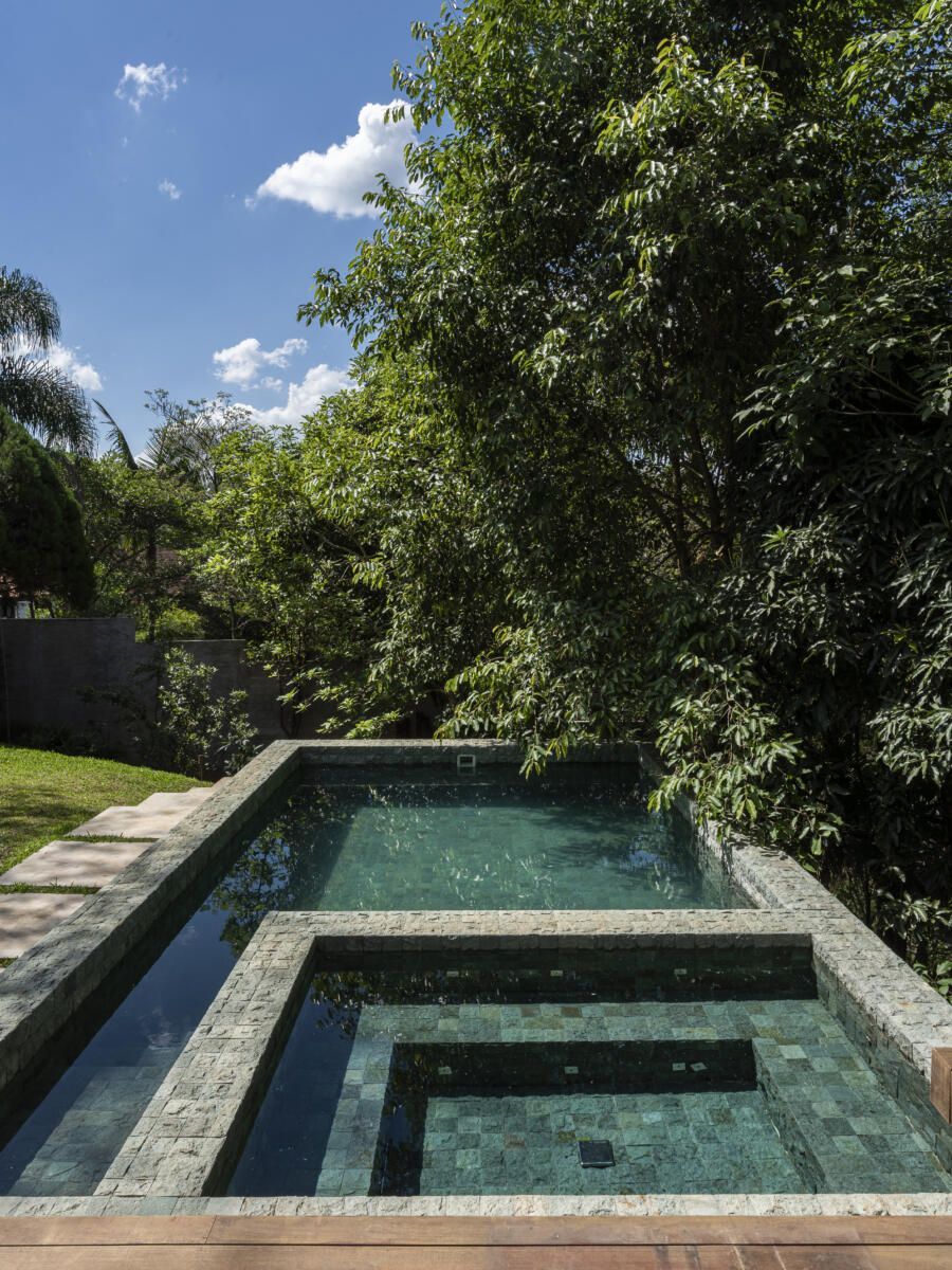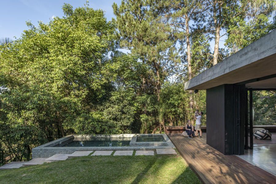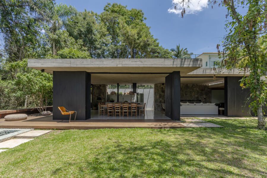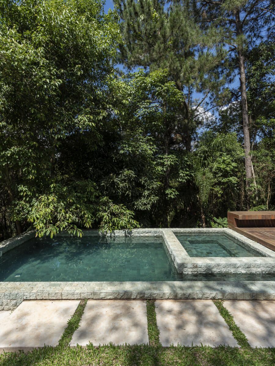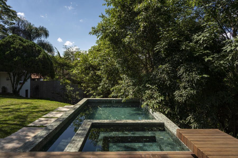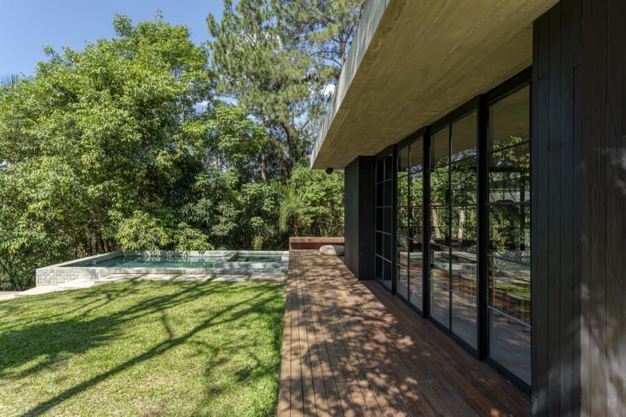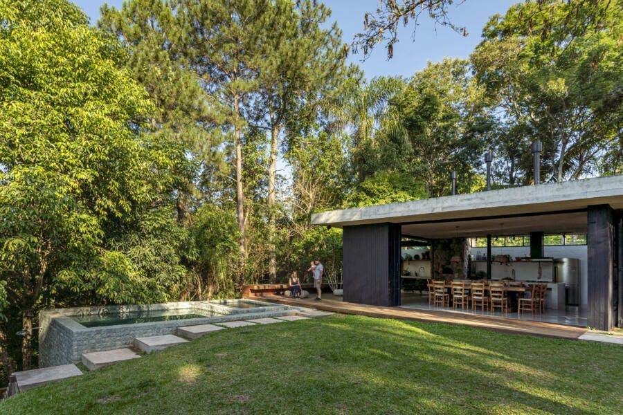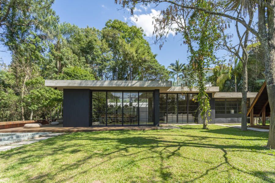 “O principal desafio foi inserir o que havíamos pensado no terreno sem ter que mexer em nenhuma árvore. Fizemos diversos testes para que fosse possível preservar os ipês, a jabuticabeira e a pitangueira mantendo o máximo de transparência e trazendo o verde da natureza para dentro do espaço.”