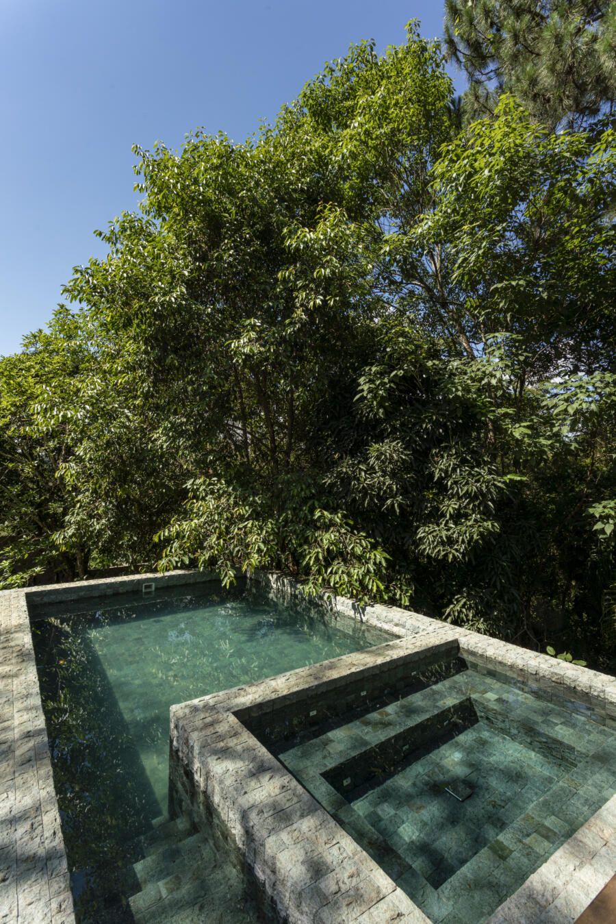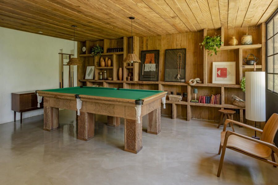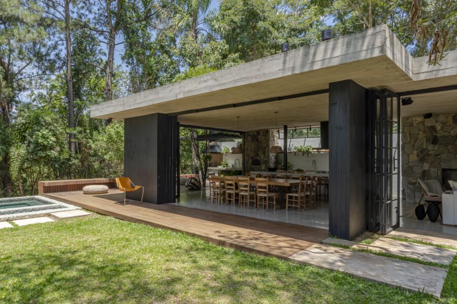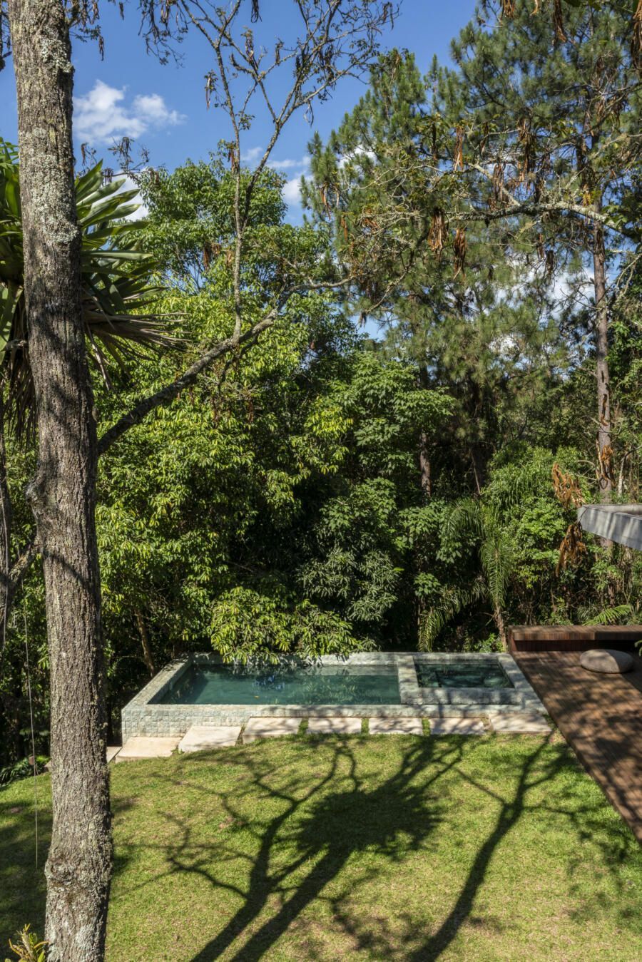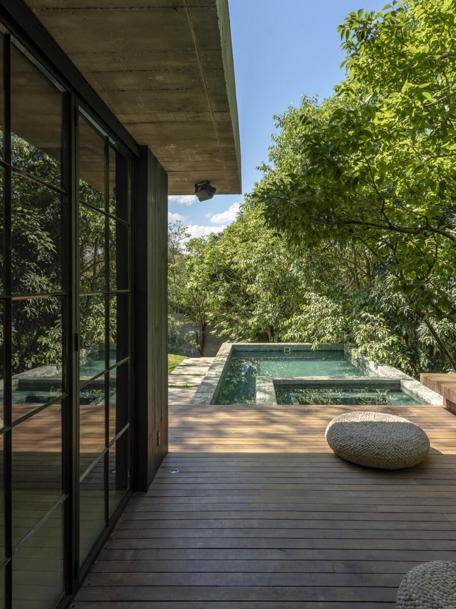 “O principal desafio foi inserir o que havíamos pensado no terreno sem ter que mexer em nenhuma árvore. Fizemos diversos testes para que fosse possível preservar os ipês, a jabuticabeira e a pitangueira mantendo o máximo de transparência e trazendo o verde da natureza para dentro do espaço.”