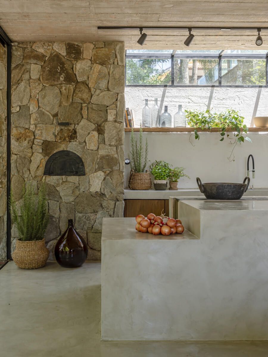 “Como o vizinho fica muito próximo na divisa do fundo, usamos uma janela no teto da cozinha para trazer iluminação natural ao espaço sem que se perdesse a privacidade. A despensa e banheiro ficaram atrás da lareira, dessa forma a porta não fica exposta e assim os ambientes que não são integrados ao salão principal ocultam-se.”