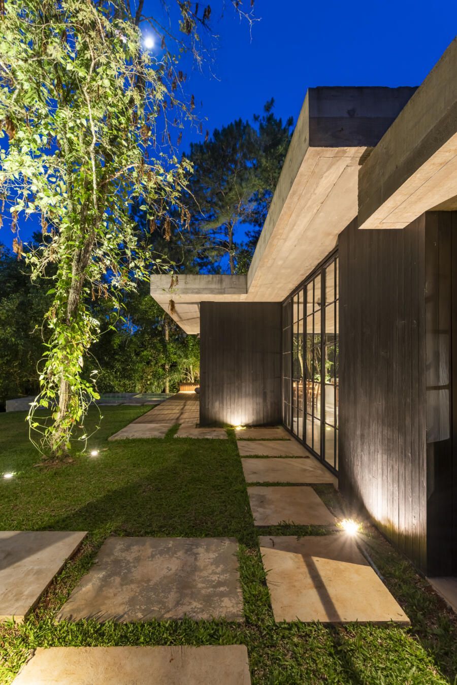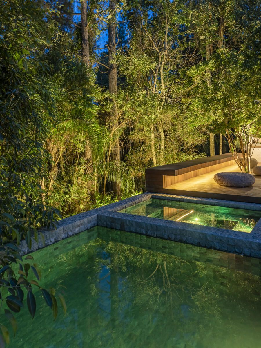 “A ideia foi utilizar o mínimo possível de pontos diretos no teto para valorizar a laje em concreto armado. Usamos pontos de spots no piso para que a laje rebatesse a luminosidade, assim os ambientes tornam-se mais aconchegantes. Além disso, na mata usamos outros pontos para iluminar as árvores e valorizar a natureza, mesmo à noite.”