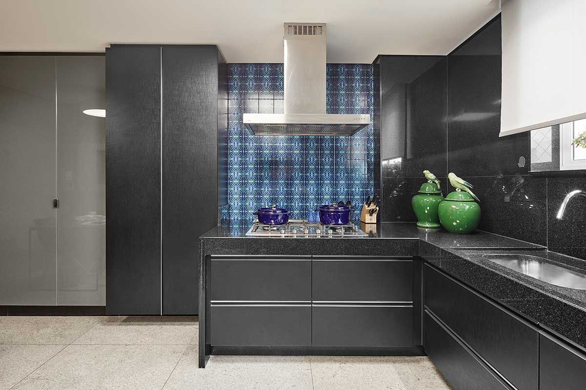 Para manter alguns itens, como o piso em granito moonlight, como os clientes pediram, foi necessário um estudo de cores complementares pelo escritório. Assim foi possível compor o décor de forma harmoniosa.