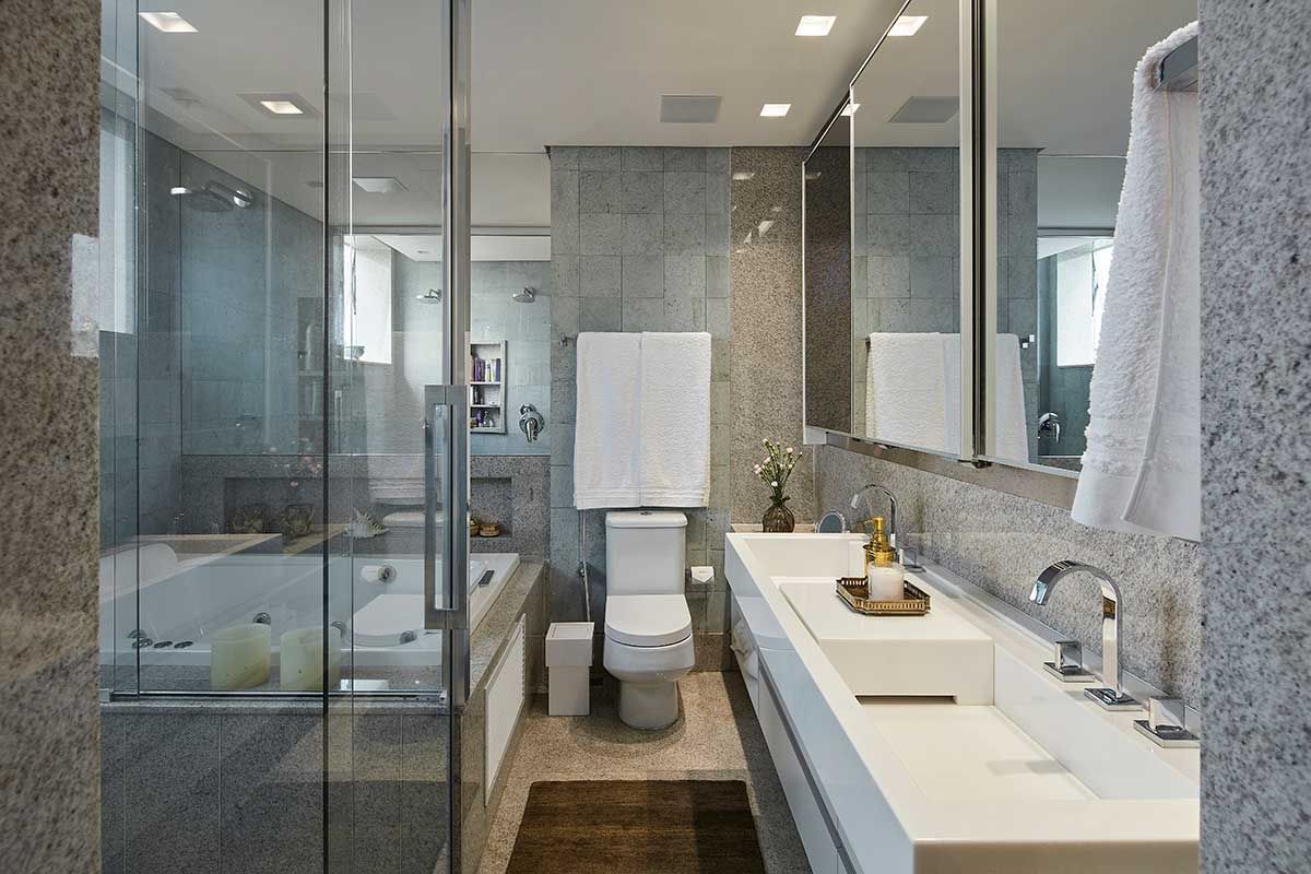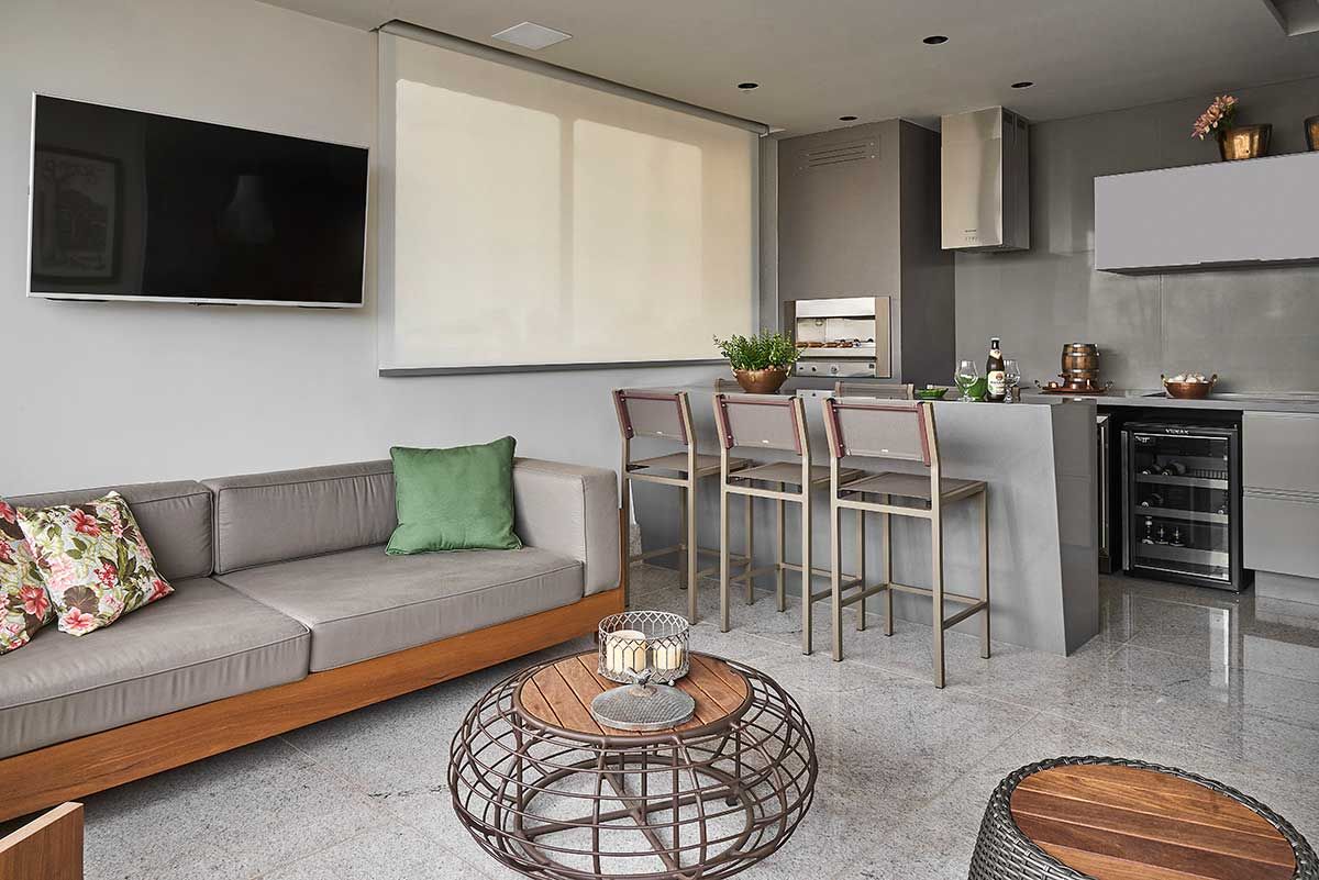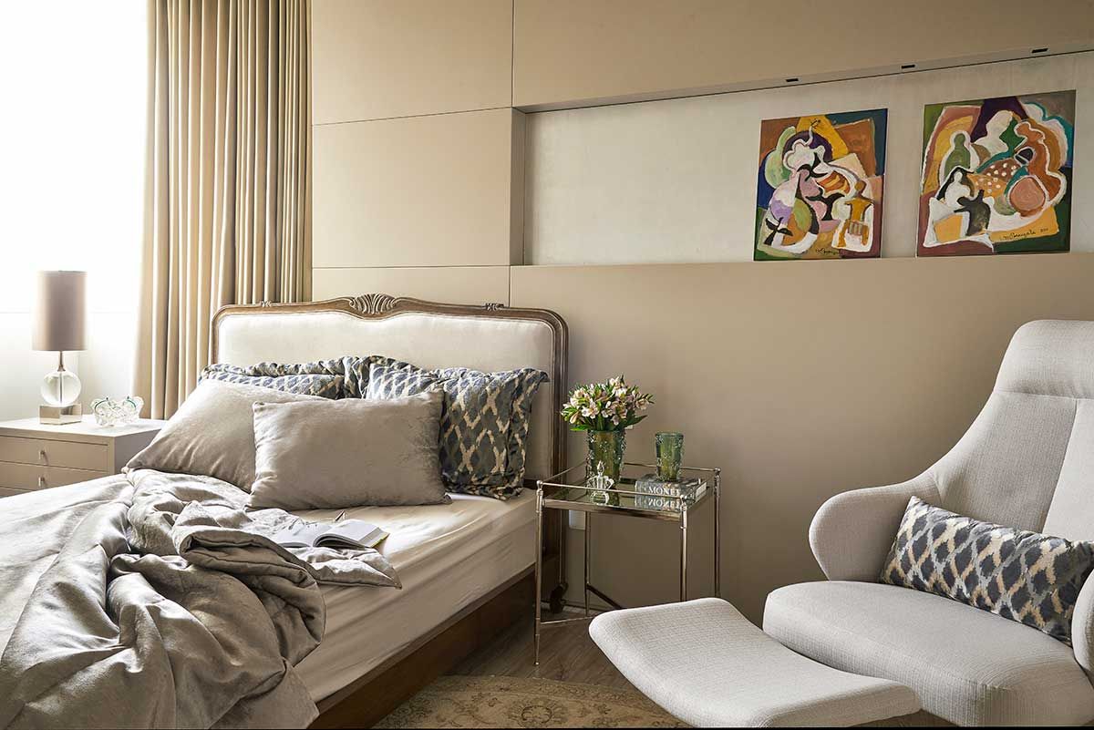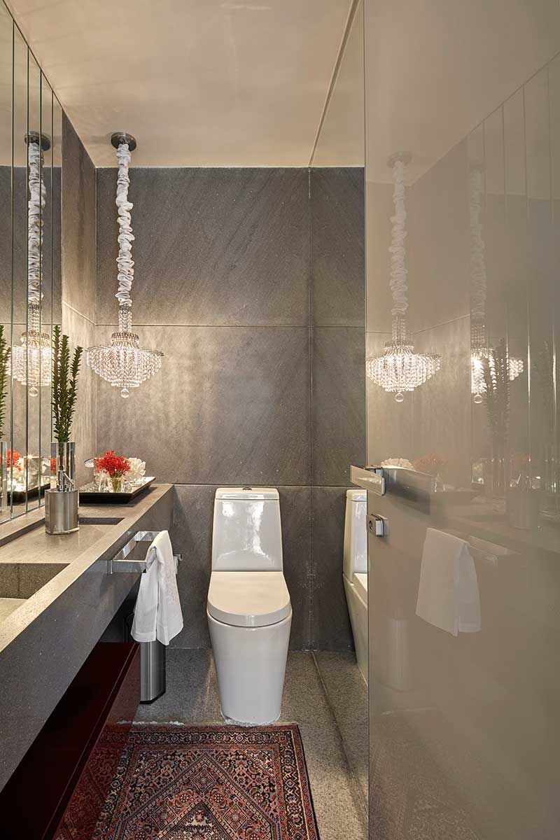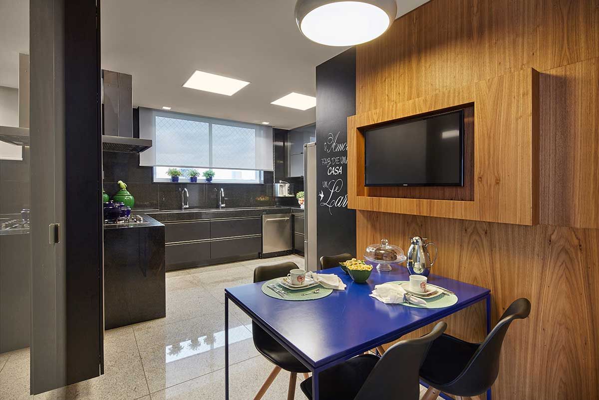 Para manter alguns itens, como o piso em granito moonlight, como os clientes pediram, foi necessário um estudo de cores complementares pelo escritório. Assim foi possível compor o décor de forma harmoniosa.