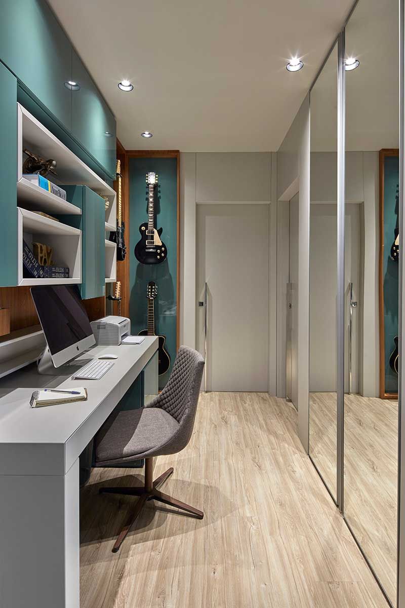 Eles também fizeram um pedido especial, queriam um apartamento charmoso, mas com pitadas de cores em todos os ambientes, apenas o quarto de casal deveria ser neutro.