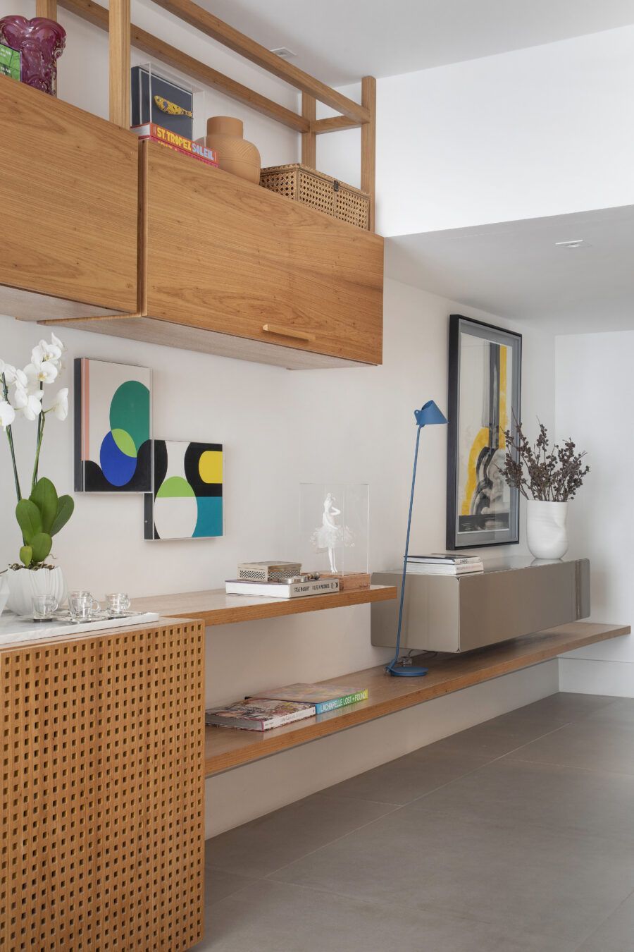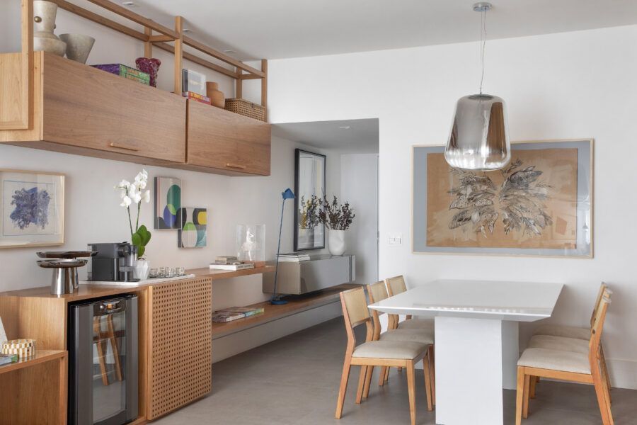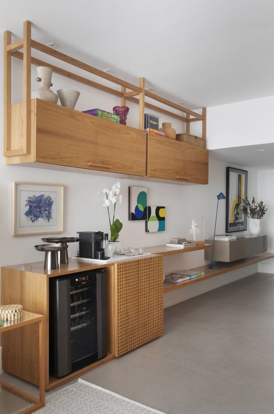 “Aproveitamos a vocação natural da parede de entrada que vai até a janela da sala para criar um móvel que muda de função à medida que entramos no apartamento. Ele funciona como aparador no hall de entrada, vira uma bancada de apoio à sala de jantar em seguida e finaliza como um bar, com uma adega embutida embaixo. Algumas partes são fechadas para guardar os objetos do dia a dia da família.”