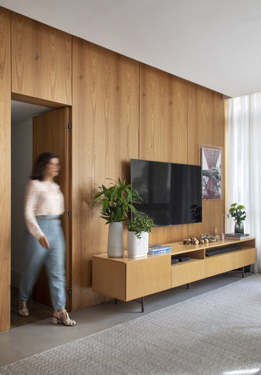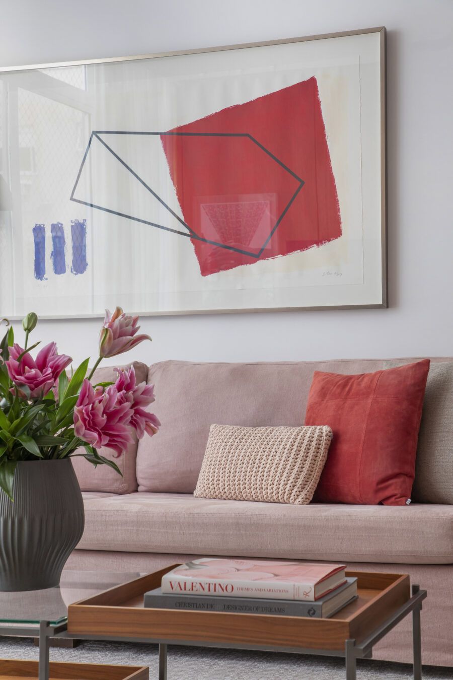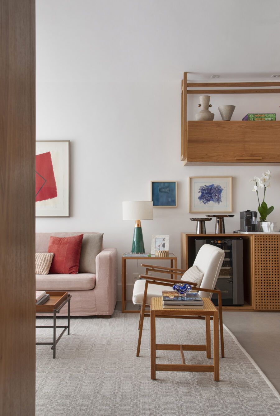 É destaque também o painel de marcenaria em freijó que reveste a parede oposta à estante e camufla as portas de acesso ao lavabo e à área íntima. O sofá com capa de linho em tom rosé, também na sala, tornou-se o xodó da casa.