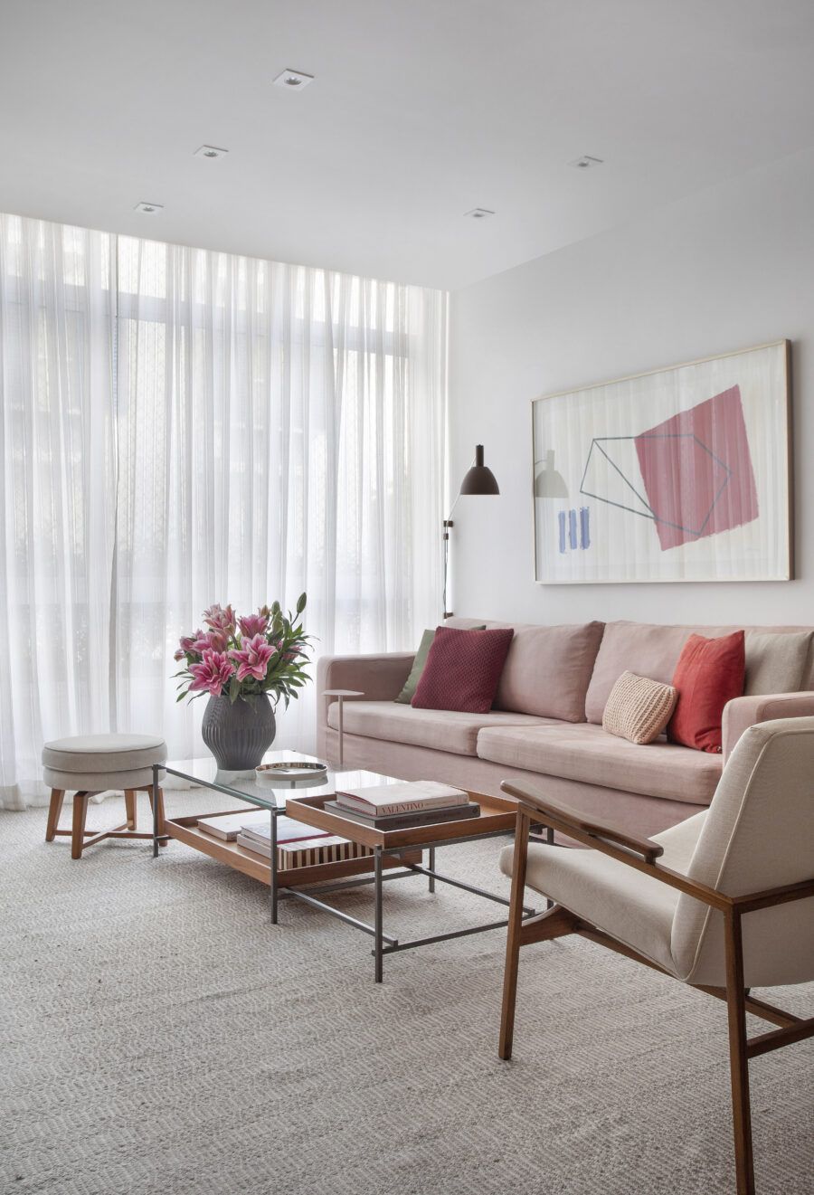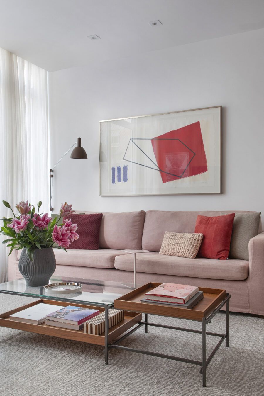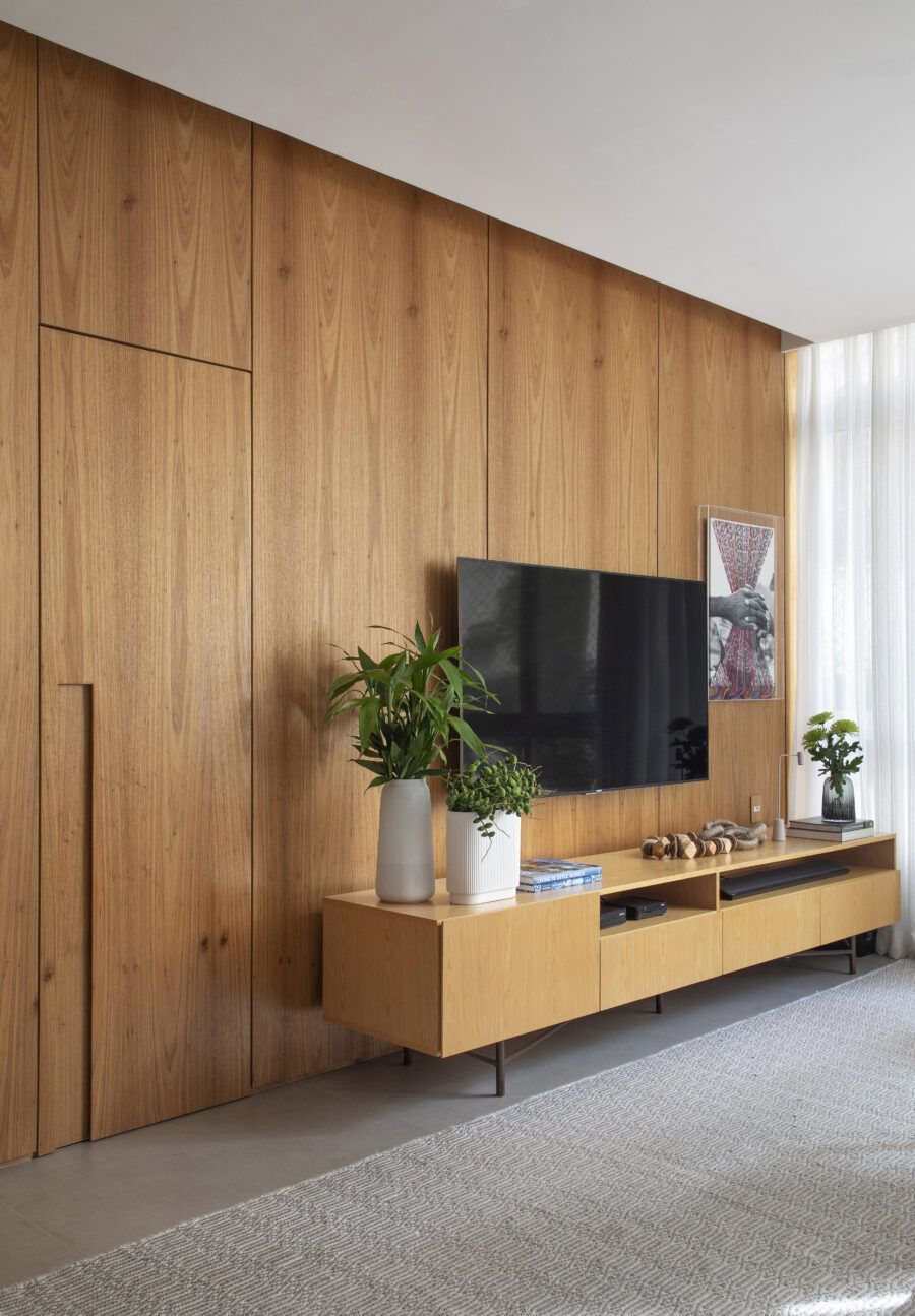 É destaque também o painel de marcenaria em freijó que reveste a parede oposta à estante e camufla as portas de acesso ao lavabo e à área íntima. O sofá com capa de linho em tom rosé, também na sala, tornou-se o xodó da casa.