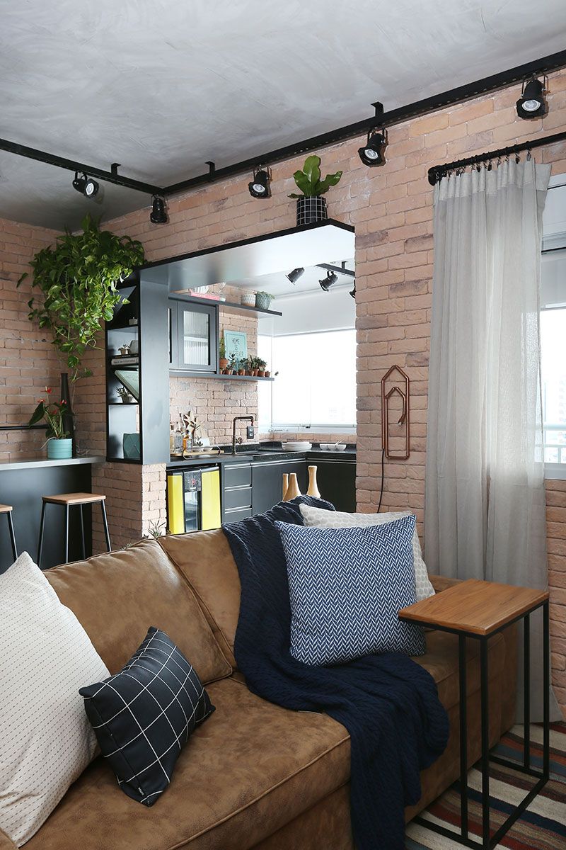 Usamos o estilo industrial, mas para não perder o aconchego optamos por tons de madeira, sofá caramelo e outros acabamentos. Usamos tijolo cor terra em toda área social com cimento queimado em todas as paredes e teto.