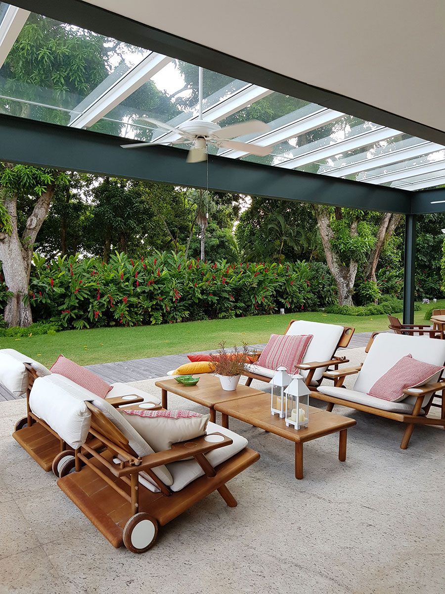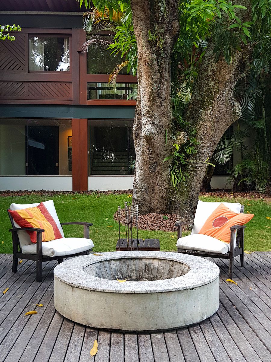 Entre as características arquitetônicas da casa, destaca-se a integração dos interiores ao verde da área externa, através das diversas claraboias e grandes panos de vidro. Essa relação da arquitetura com a natureza foi o que encantou a cliente, que destaca ainda a varanda como ponto central da casa: “amo ficar ali, especialmente em dia de chuva! Quando recebemos amigos, a noite sempre termina na varanda”