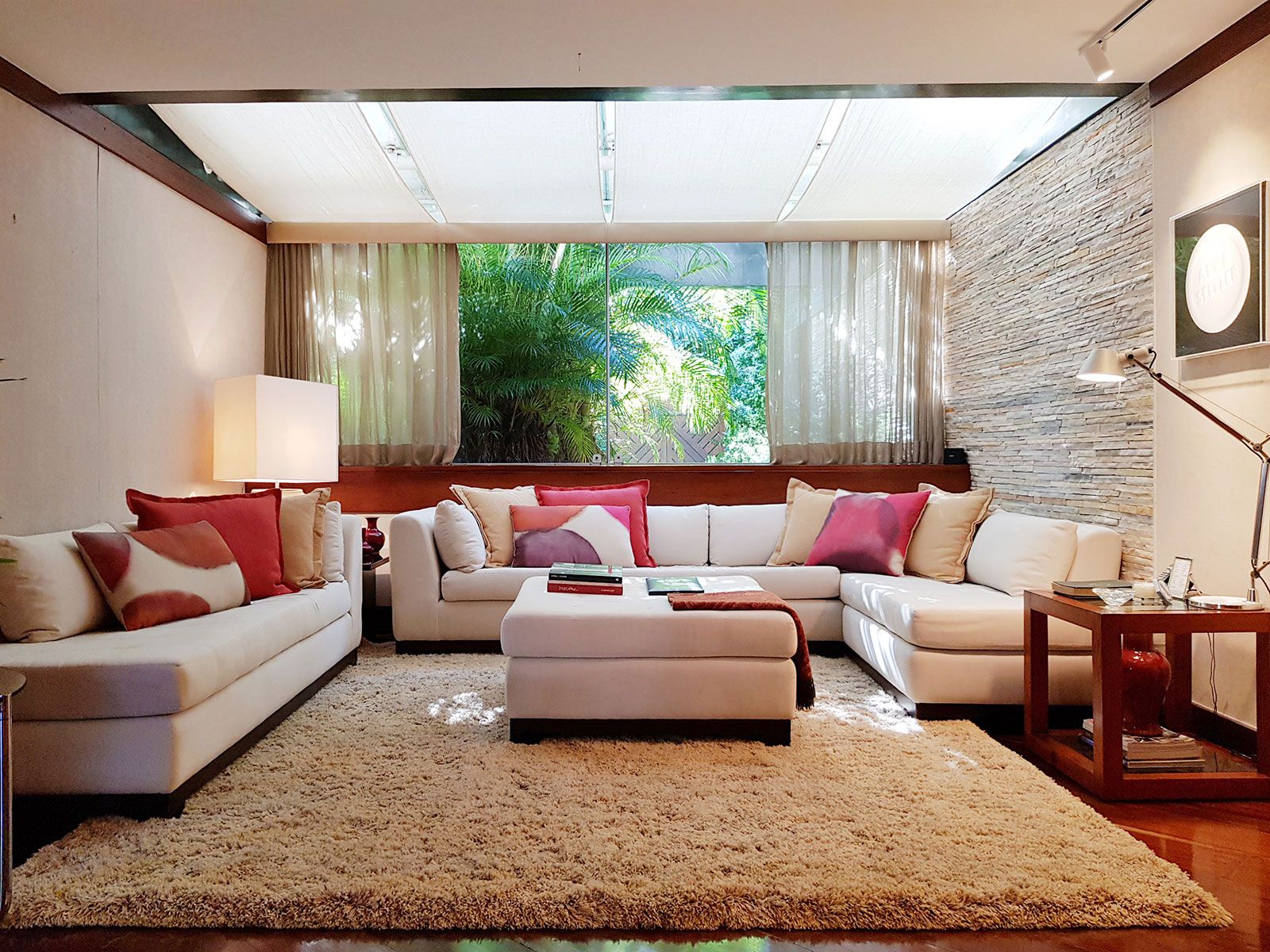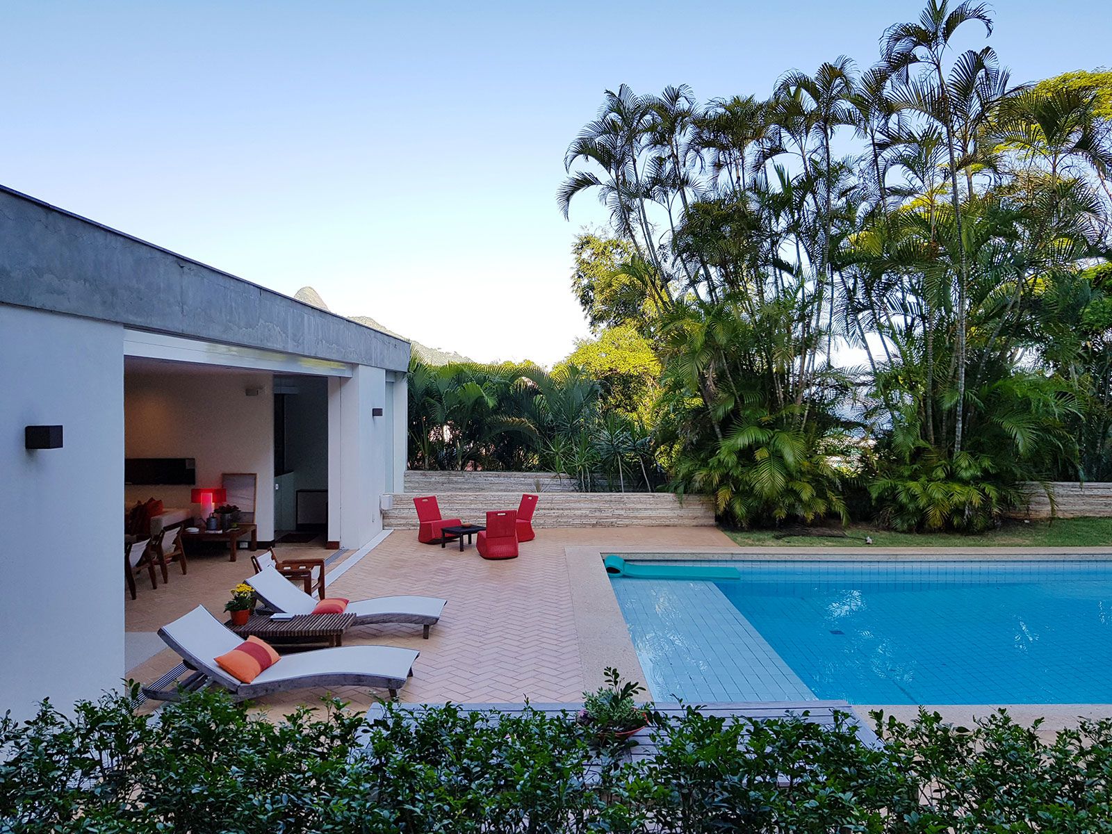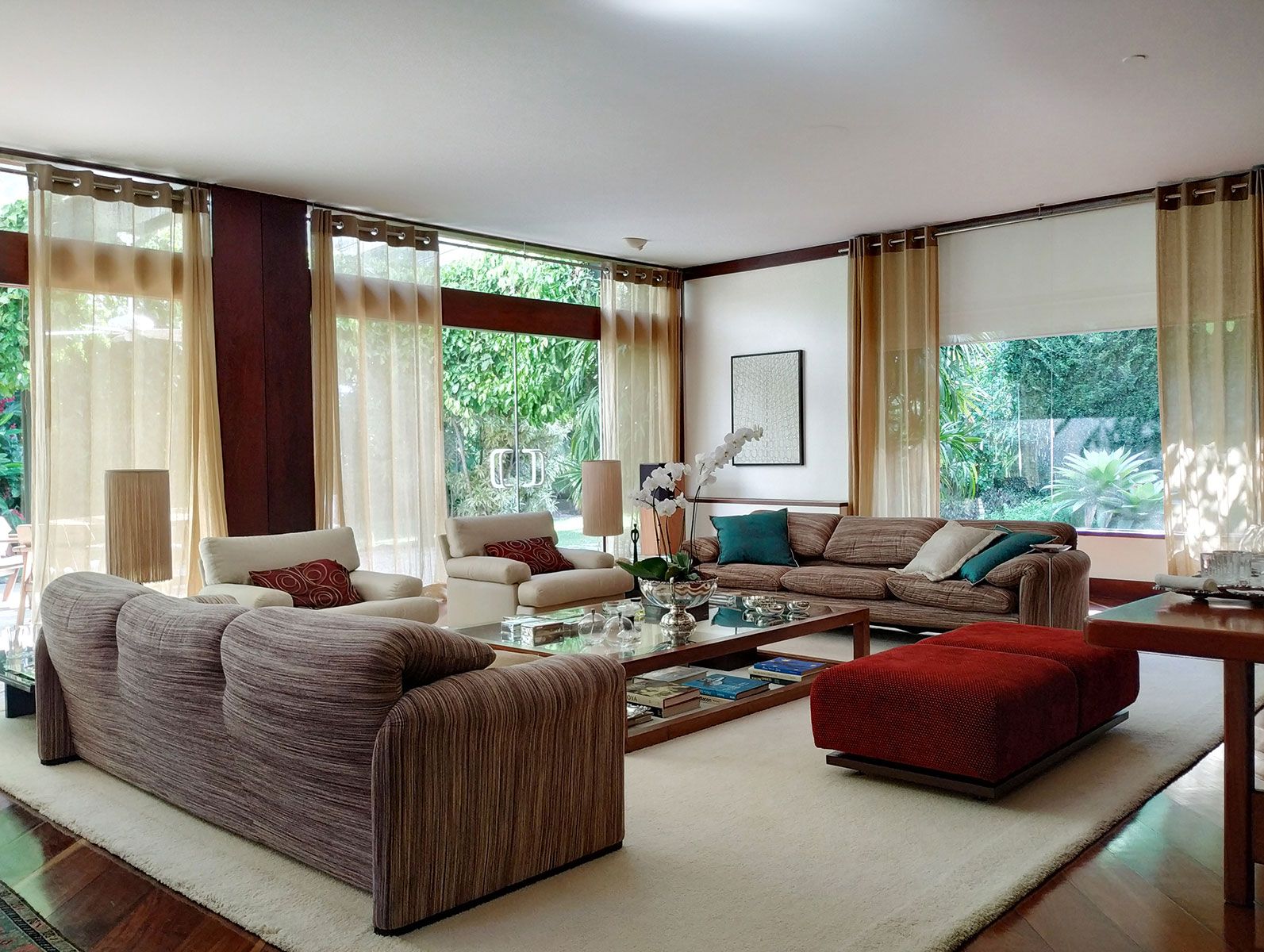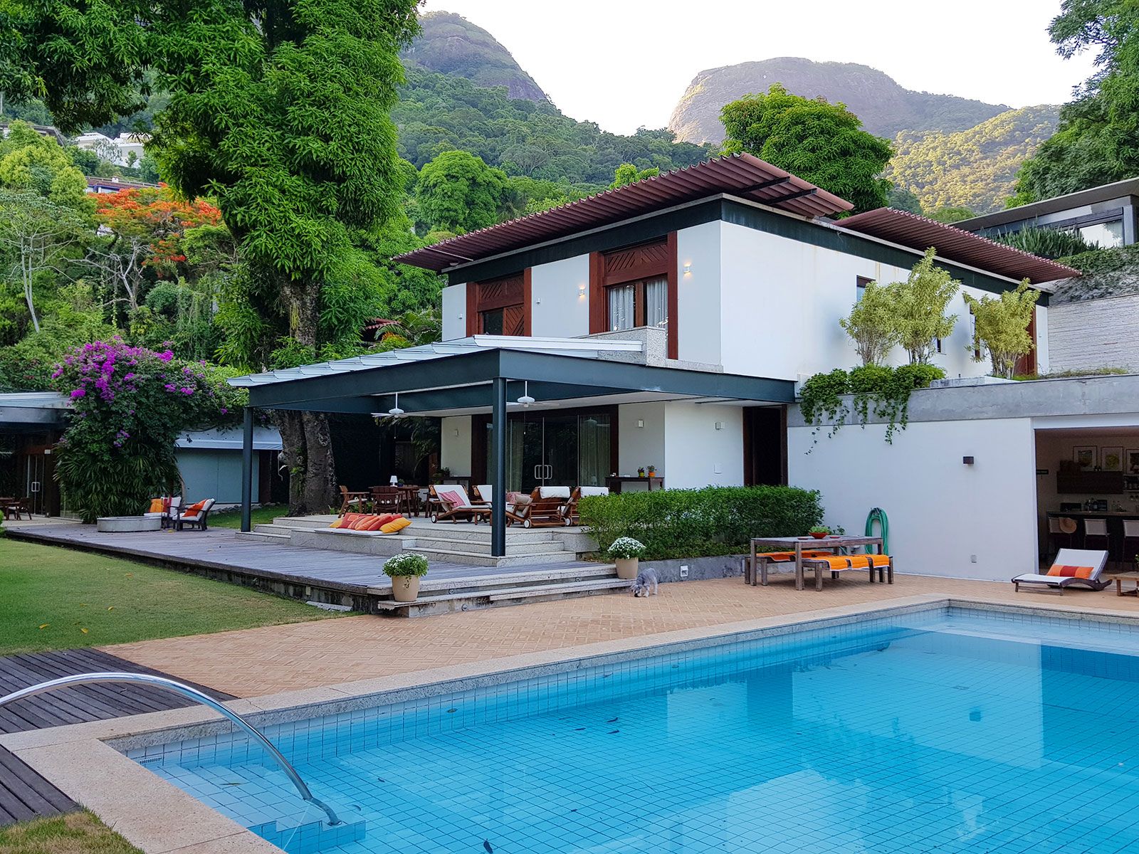 Atualmente, o imóvel se divide em living, biblioteca, sala de jantar, saleta de almoço, copa, cozinha e dependências no térreo, que também conta com uma área coberta para atender à piscina, com bar e vestiários. Já no piso superior, ficam a suíte do casal, quatro quartos organizados em duas alas, cada uma com seu banheiro, e uma sala íntima usada como home theater.