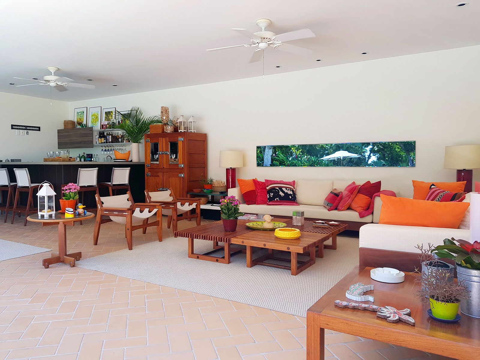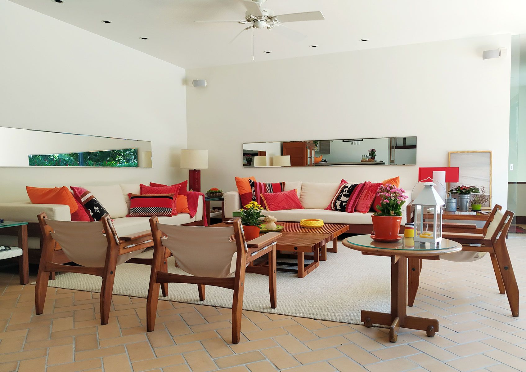 Nos interiores, o piso de ipê roxo contrasta com uma decoração leve, descompromissada e afetiva, que mescla os estilos clássico e contemporâneo. Algumas peças estavam com os clientes há mais de 30 anos, outras são novas, mas os moradores sempre garimpam itens para a casa quando viajam.