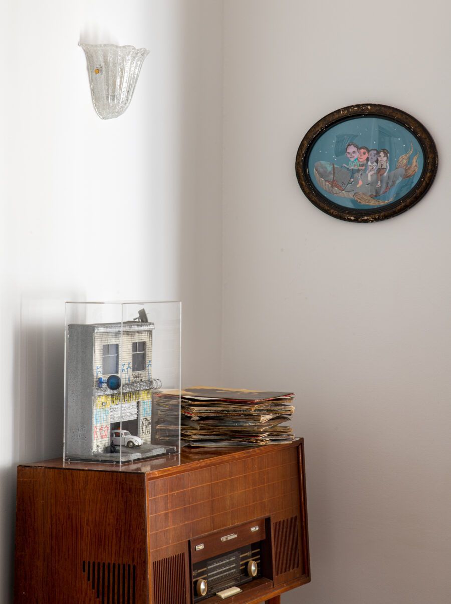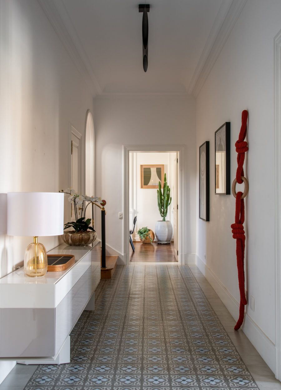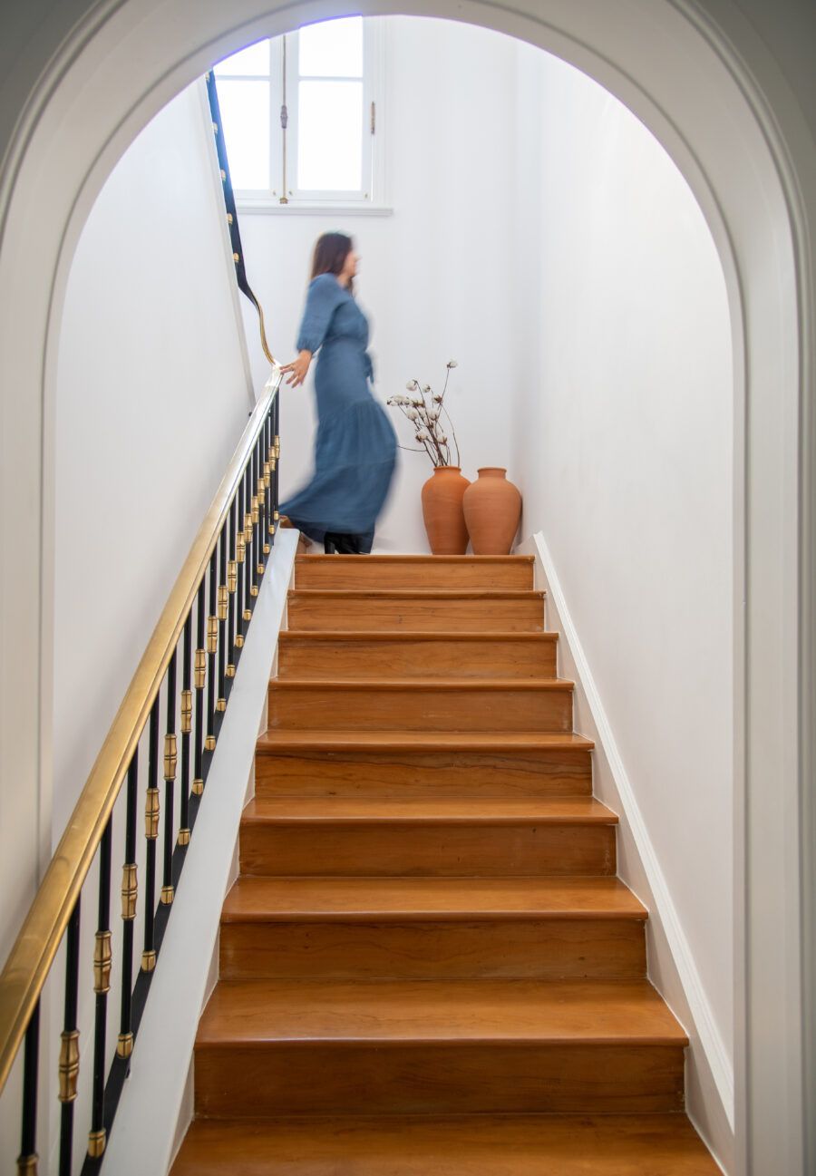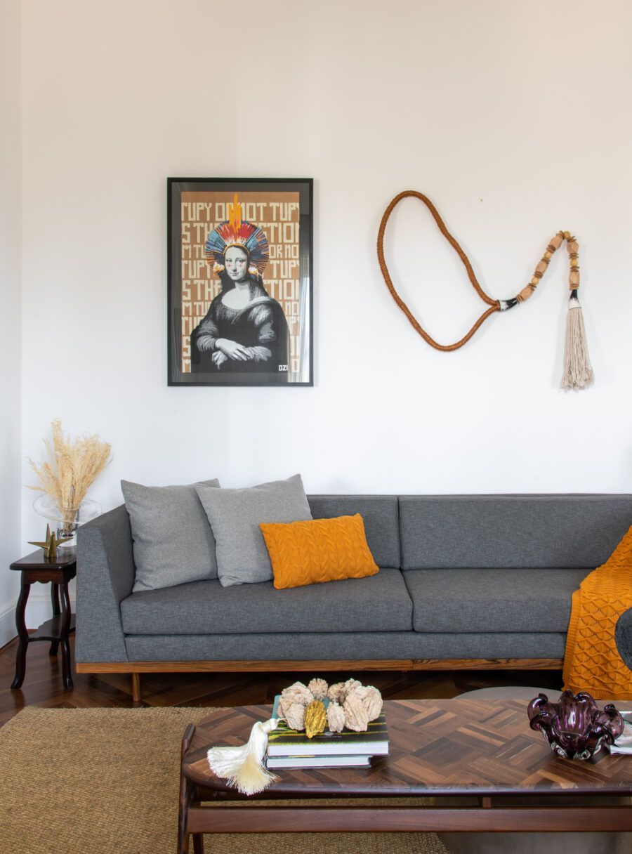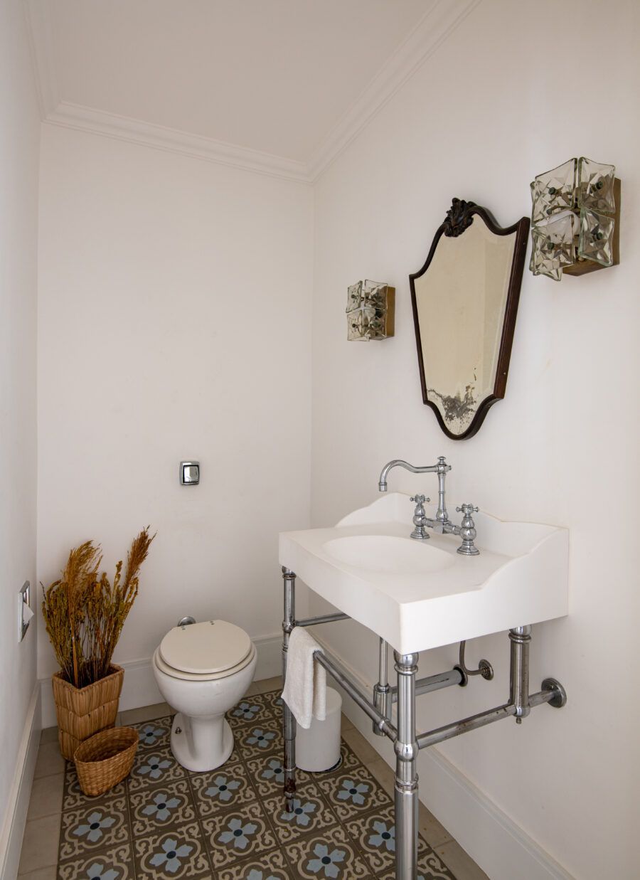 “A família pediu algumas intervenções importantes na planta original, mas que não descaracterizassem o que já era belo. Havia a necessidade de abrir uma passagem que conectasse a cozinha com a sala de jantar, onde construímos uma generosa bancada gourmet toda equipada com geladeira, pia e armários embutidos para as confraternizações entre amigos. Abaixo da escada havia um espaço vazio que descobrimos com a planta original. Esse espaço possibilitou a passagem e conexão dos dos ambientes e lá fizemos uma adega mantendo os tijolos rústicos e originais da construção, bem descascados mesmo e deixando que o prédio seguisse contando sua história em cada detalhe. Até nos novos espaços descobertos.”