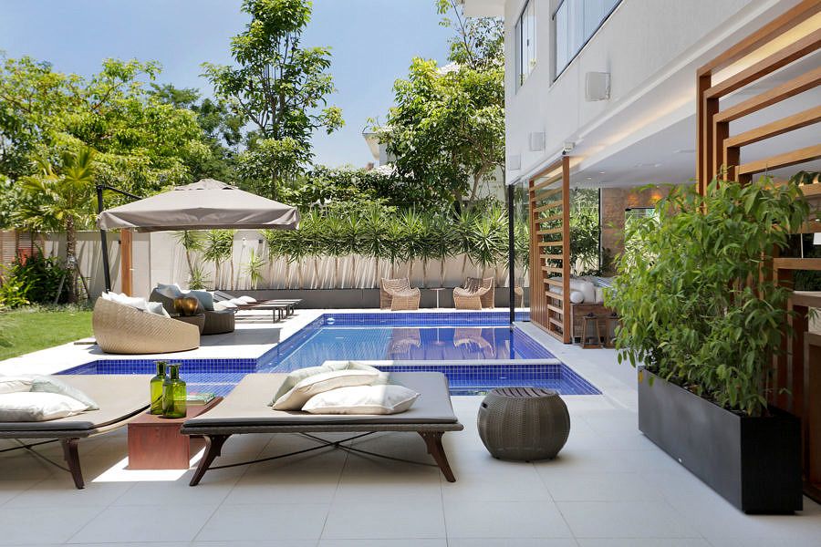 A passagem lateral da casa também recebeu uma atenção especial, ganhando um novo layout, atribuindo ares de varanda mediterrânea ao espaço sob o pergolado, já existente, em madeira e palha. O lavabo social, por sua vez, foi reformulado ganhando um efeito cênico, com papel de parede preto texturizado e novo projeto de iluminação.