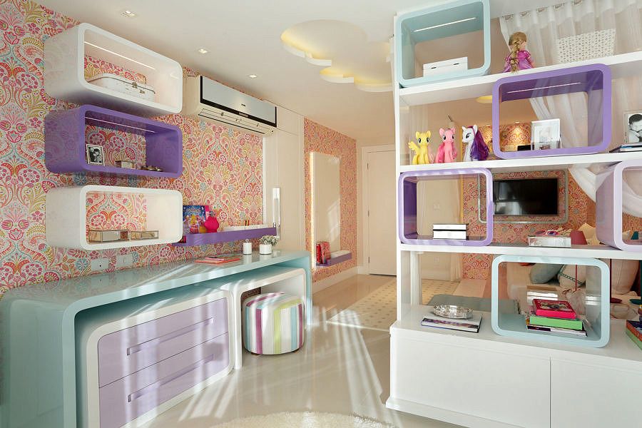 No quarto da filha, uma menina de 7 anos, o papel de parede com estampa de arabescos é um dos destaques, em composição com a marcenaria neutra, em laca branca com elementos coloridos em roxo, azul e rosa, planejada para se adequar ao crescimento da criança. Uma estante com nichos coloridos separa a área de dormir do espaço para estudos e da penteadeira.