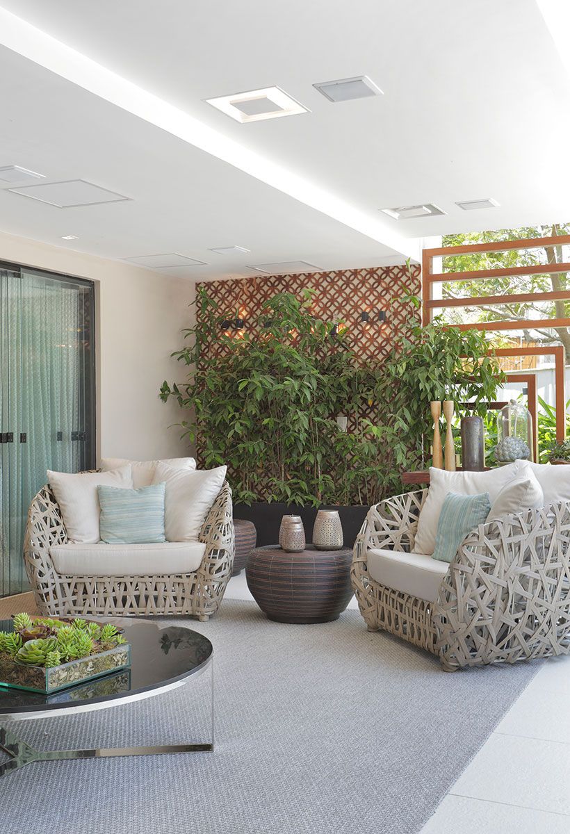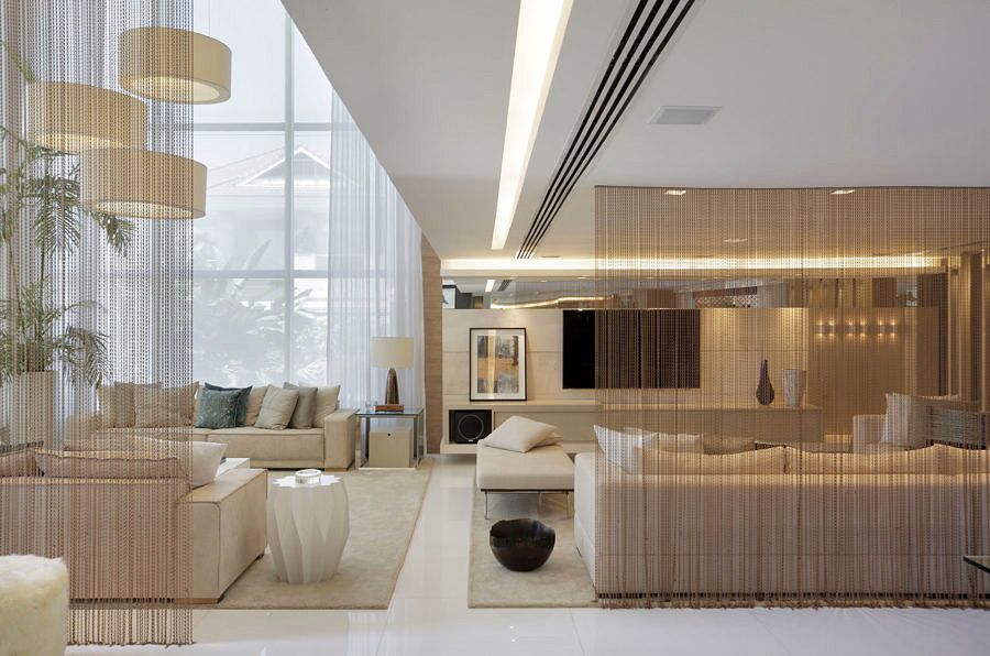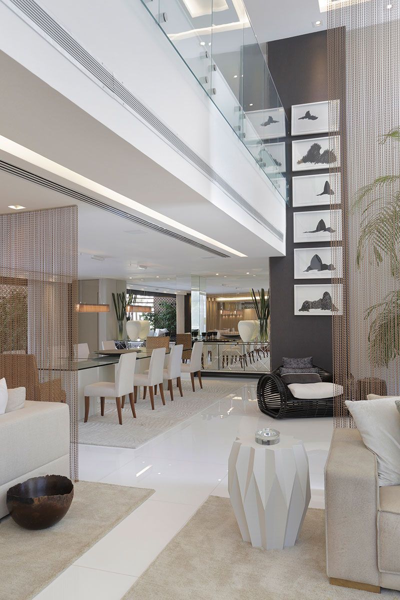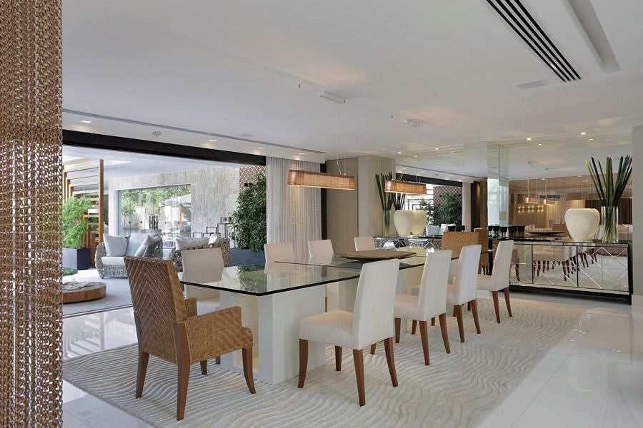 Para setorizar os espaços, apostamos em cortinas de correntes, que delimitam os ambientes do living sem isolá-los. A sala de jantar, aberta para a varanda da piscina, ganhou um novo projeto de iluminação, espelhos e bufês espelhados, para aumentar a sensação de profundidade do ambiente.