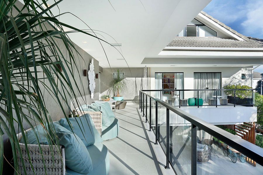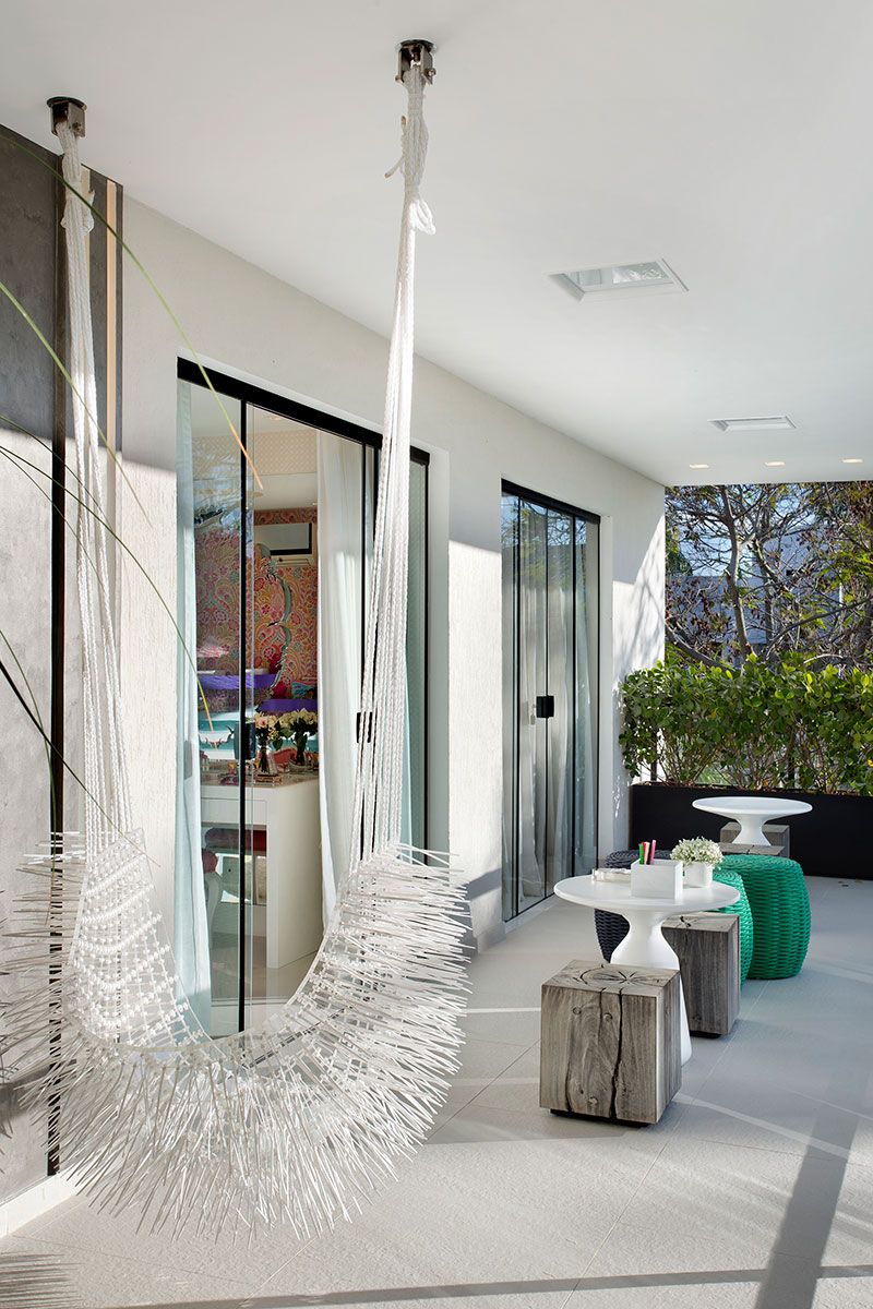 O segundo andar, que abriga a área íntima, é interligado por fora através da varanda de 36m², decorada com obras de arte de grandes dimensões além de sofás, banquetas e poltronas. Incluindo o icônico balanço Cocar, do coletivo paulistano Pax.Arq.