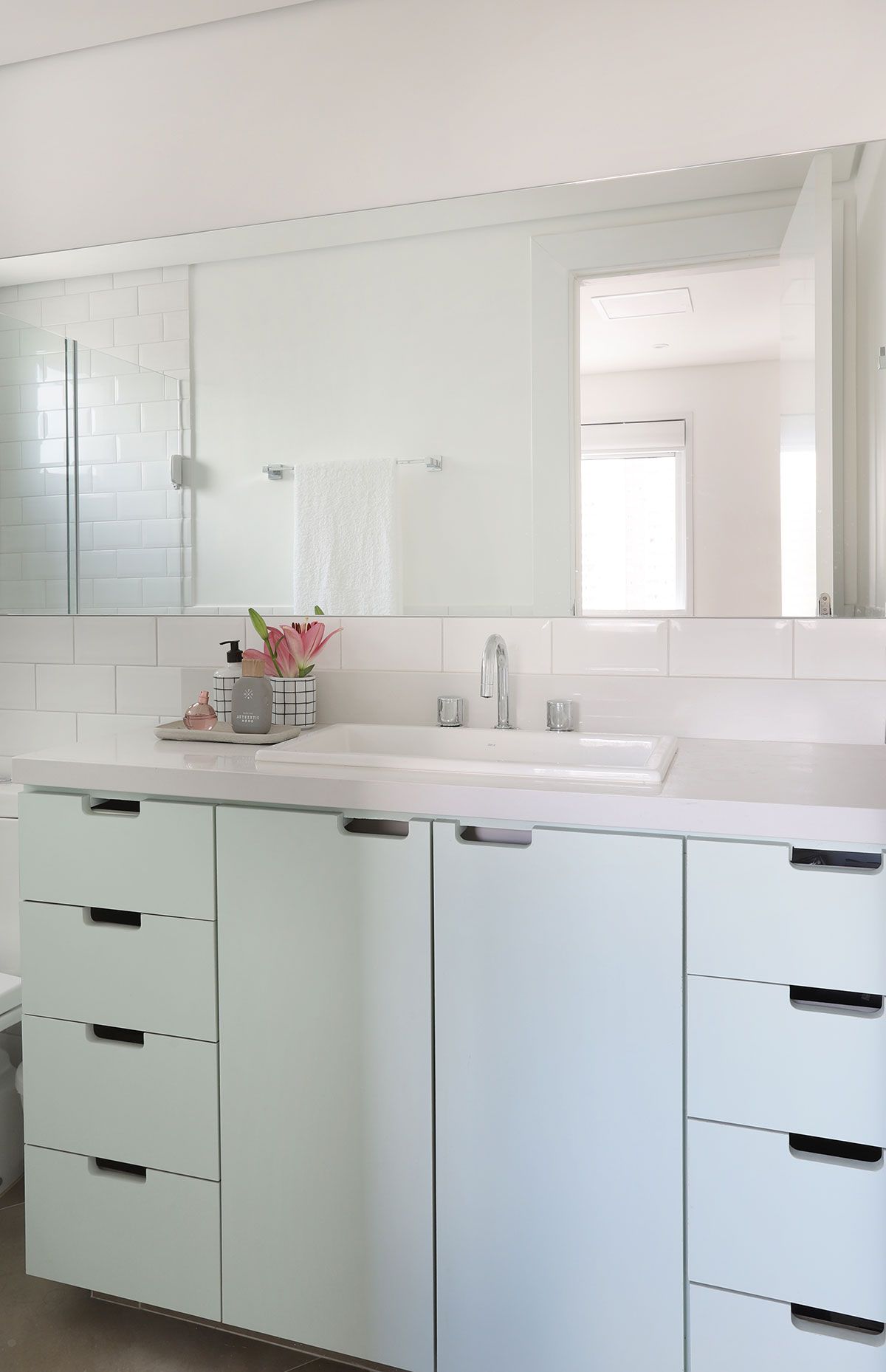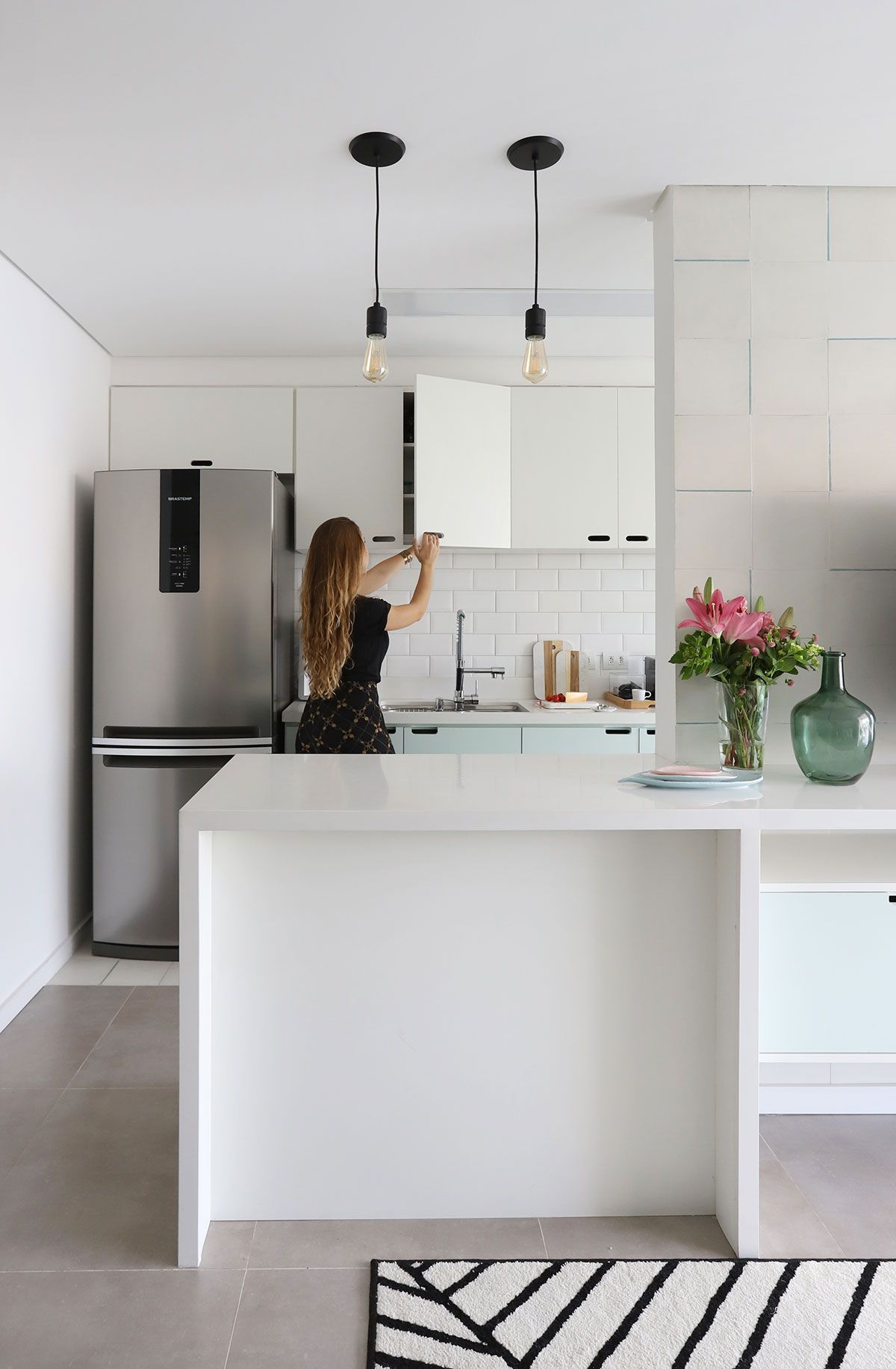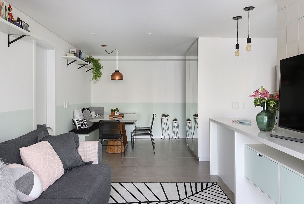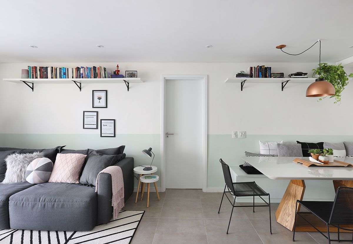 Agora vamos ver como ele ficou! A Leticia escolheu um toque escandinavo para o apartamento, com a base clara e um tom de verde pastel, que protagoniza a marcenaria como um todo, invadindo também a meia parede da sala.