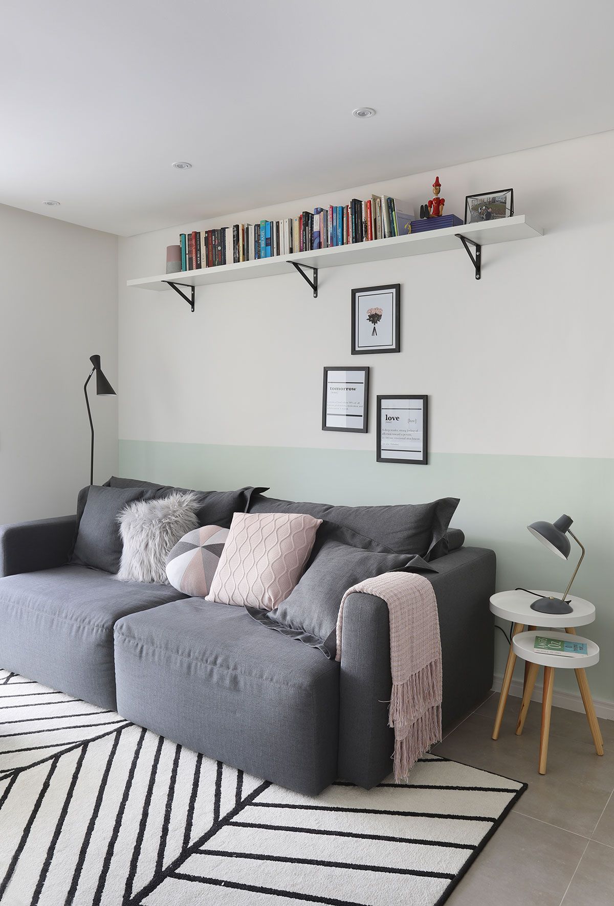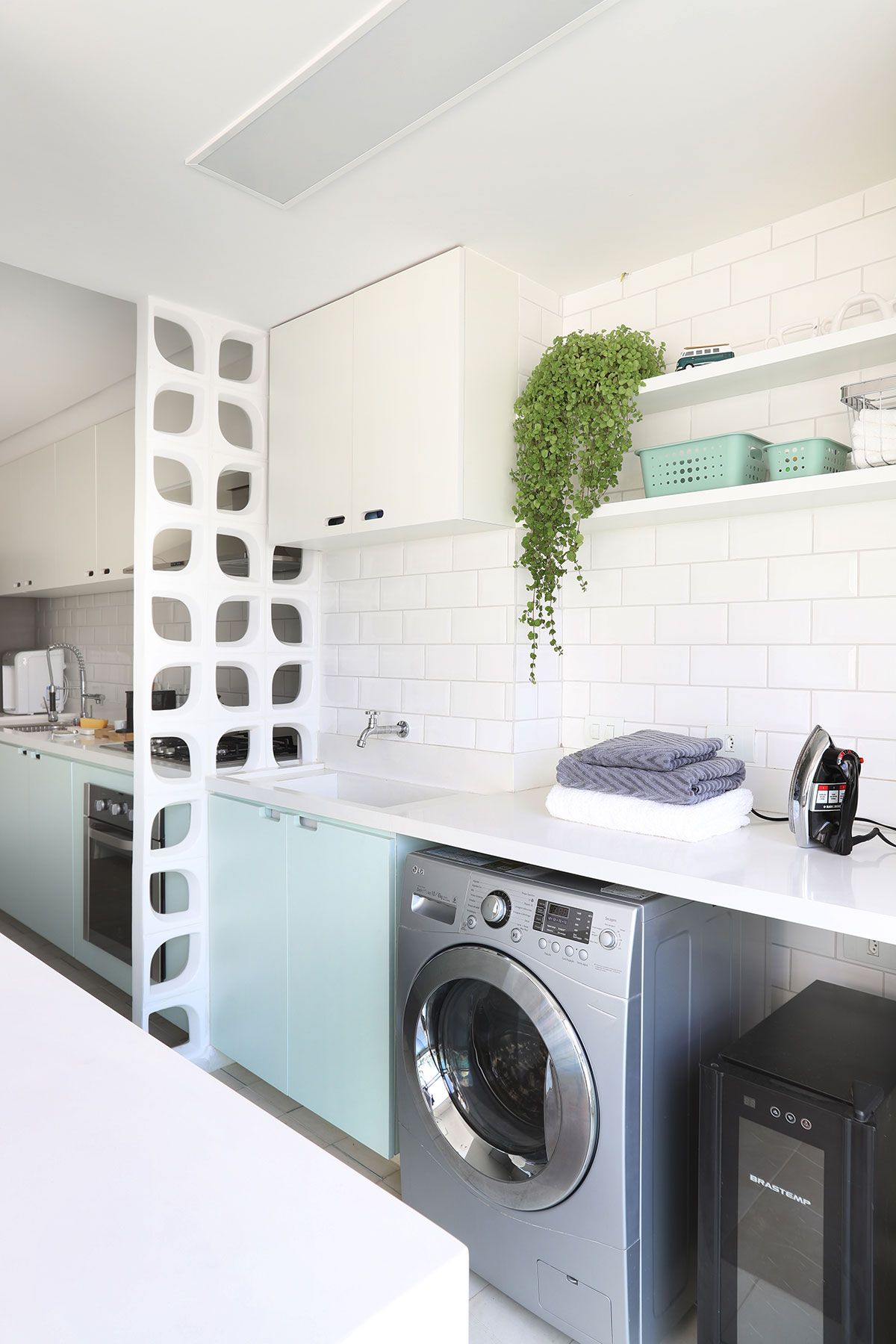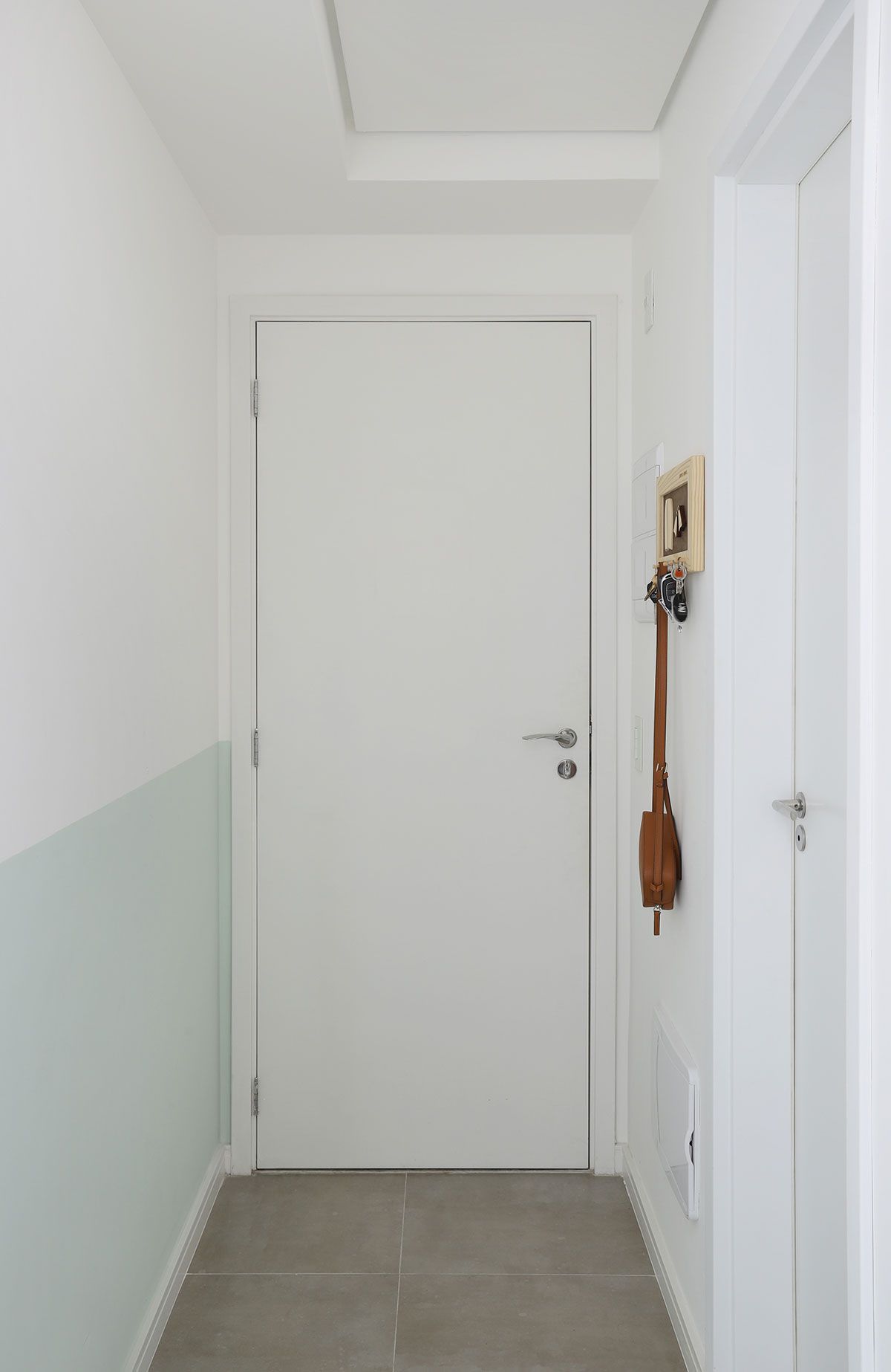Agora vamos ver como ele ficou! A Leticia escolheu um toque escandinavo para o apartamento, com a base clara e um tom de verde pastel, que protagoniza a marcenaria como um todo, invadindo também a meia parede da sala.