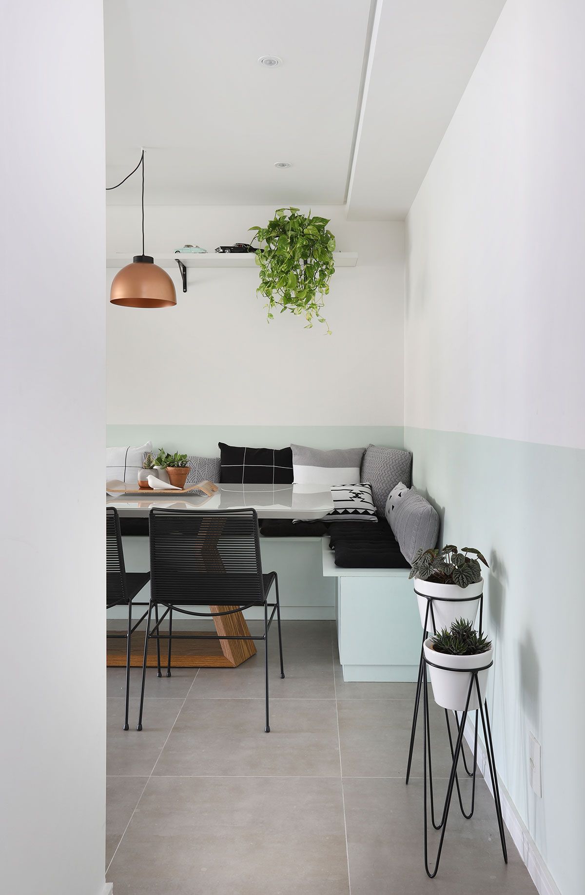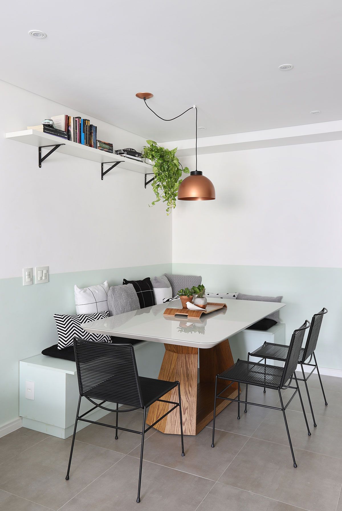 O ladrilho hidráulico minimalista entra no lugar de um tradicional painel de madeira atrás da TV e também em uma faixa no piso da cozinha, combinado com o porcelanato cimentado. Na decoração, alguns itens em preto e cobre se destacam.