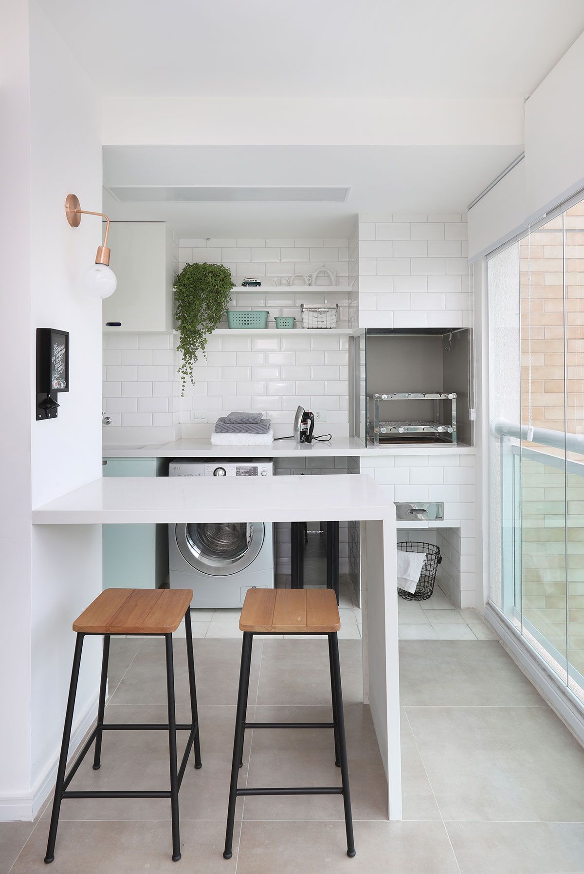 Para a planta, a ideia da profissional foi adotar o layout o mais livre e integrado possível, ela criou uma bancada central multiuso que vai da sala até o terraço, com circulação em todo o seu entorno. Assim, os moradores podem receber visitas em casa priorizando a convivência de todos os ambientes, que se tornaram um só.