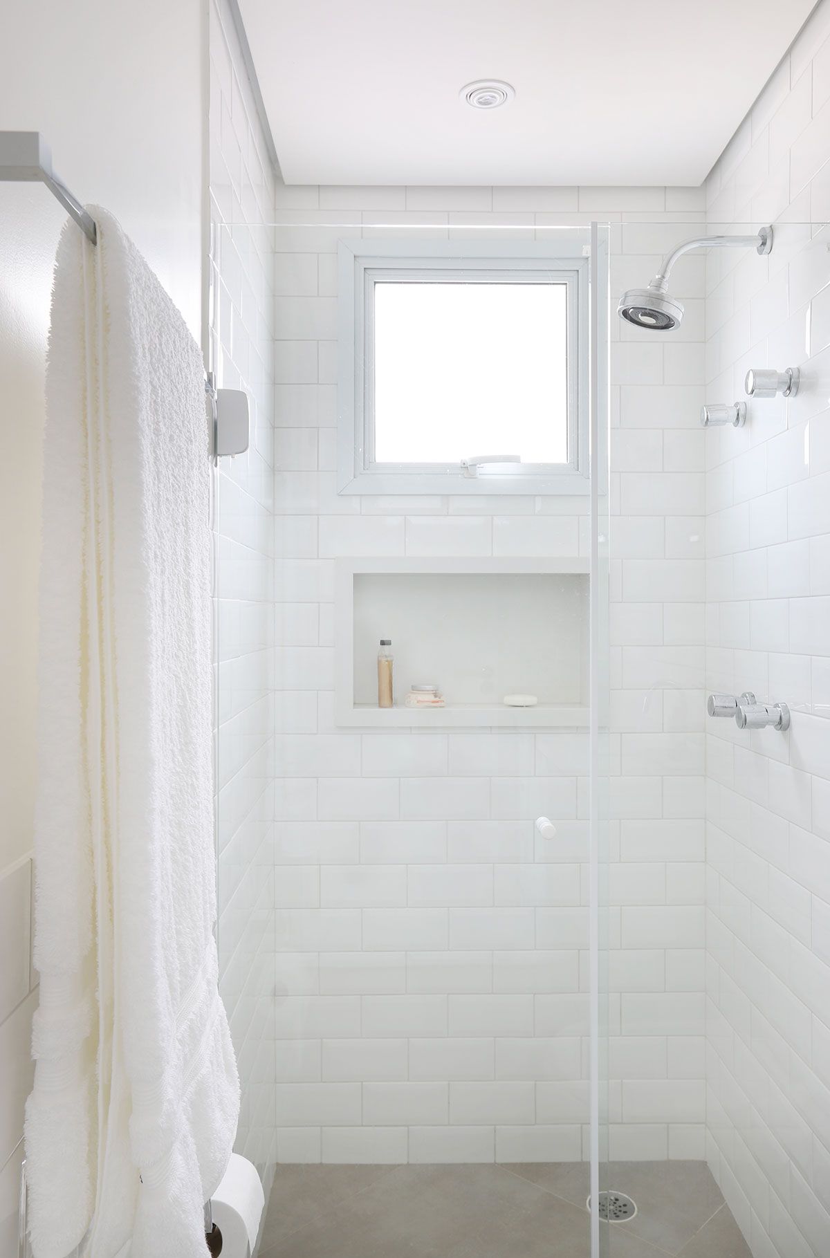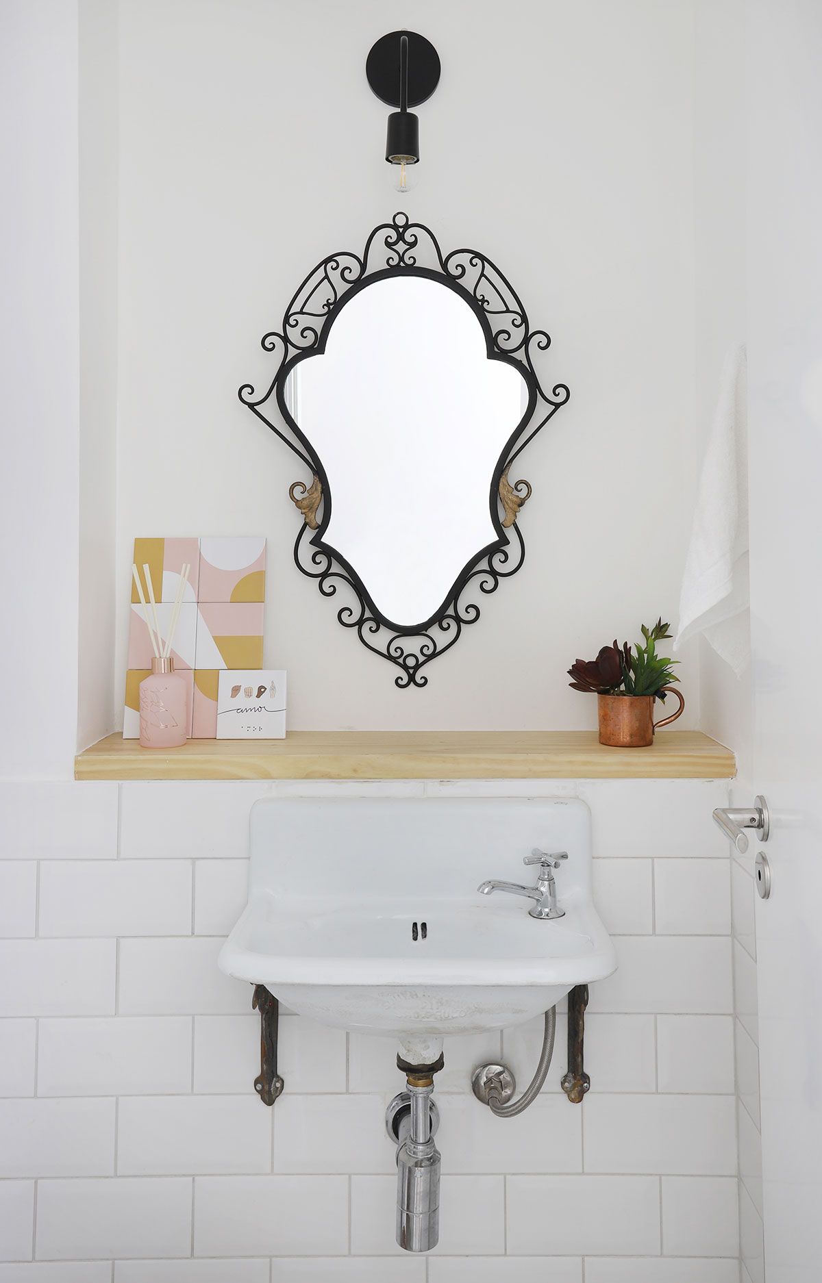 Como eles também curtem uma pegada retrô, escolhemos o Metro White como revestimento das áreas molhadas e para o lavabo, xodó da cliente, garimpamos um espelho e cuba antiga para compor a atmosfera.