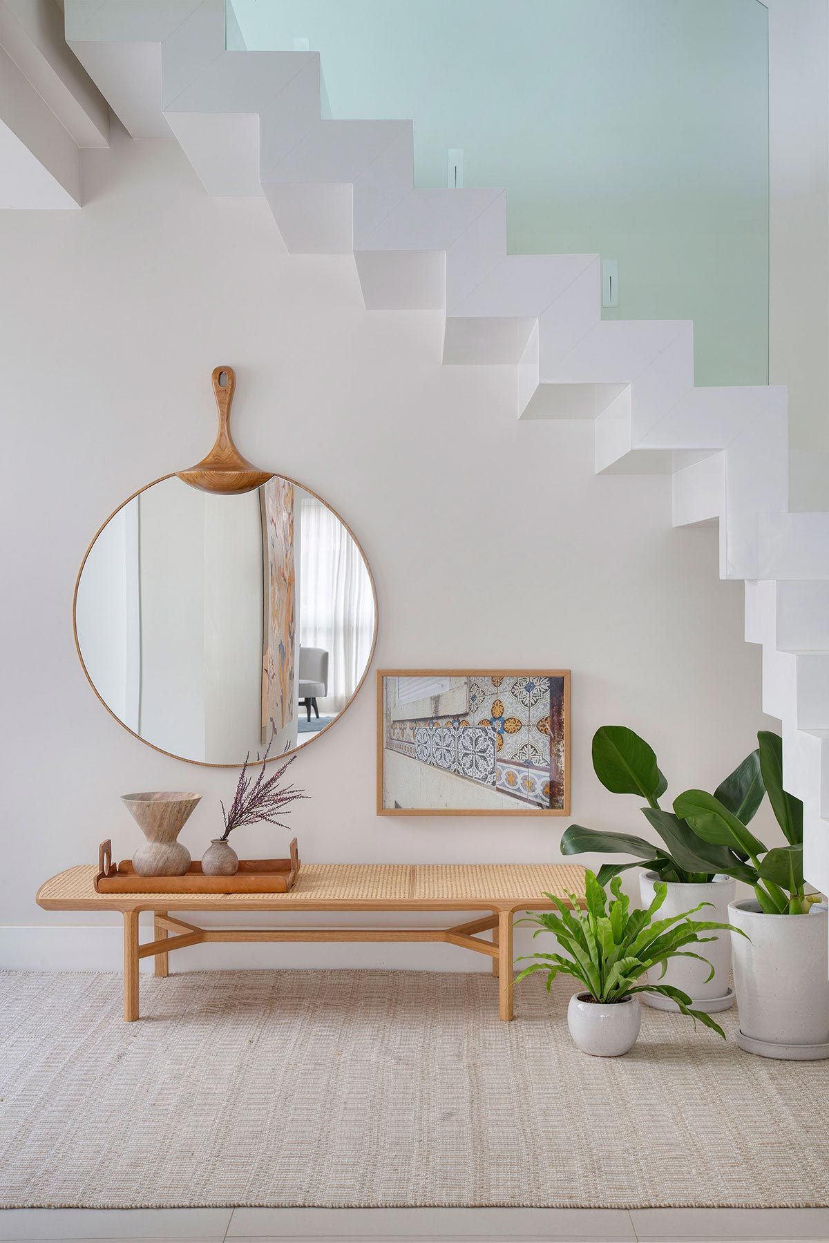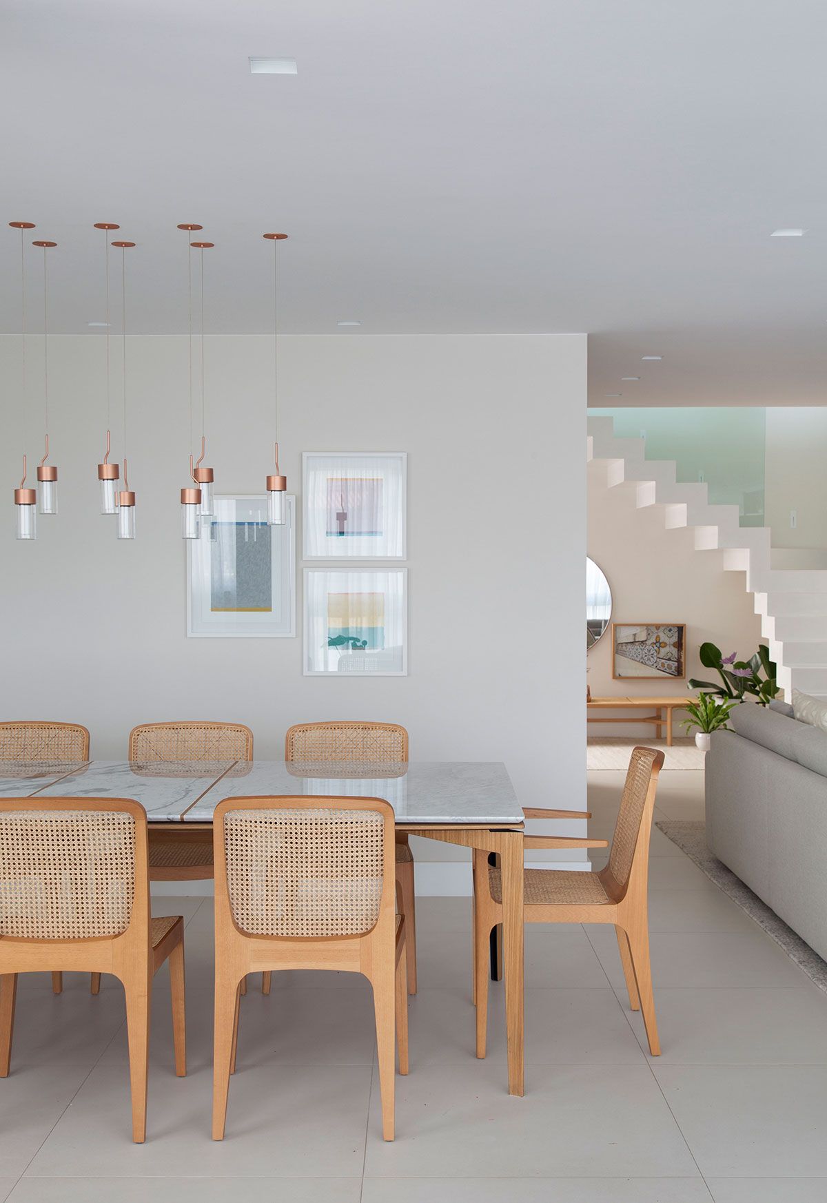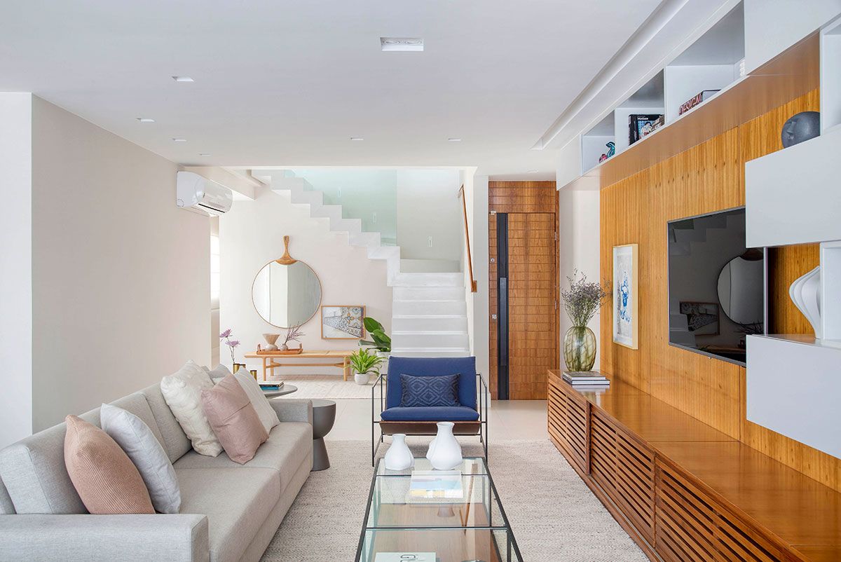 Este projeto é muito especial, pensado para uma família que confiou plenamente em mim para transformar o sonho deles em realidade. Um destaque que adoro é a escada, com design contemporâneo em linhas retas, revestida em quartzo branco, corrimão embutido em freijó e guarda-corpo de vidro.
