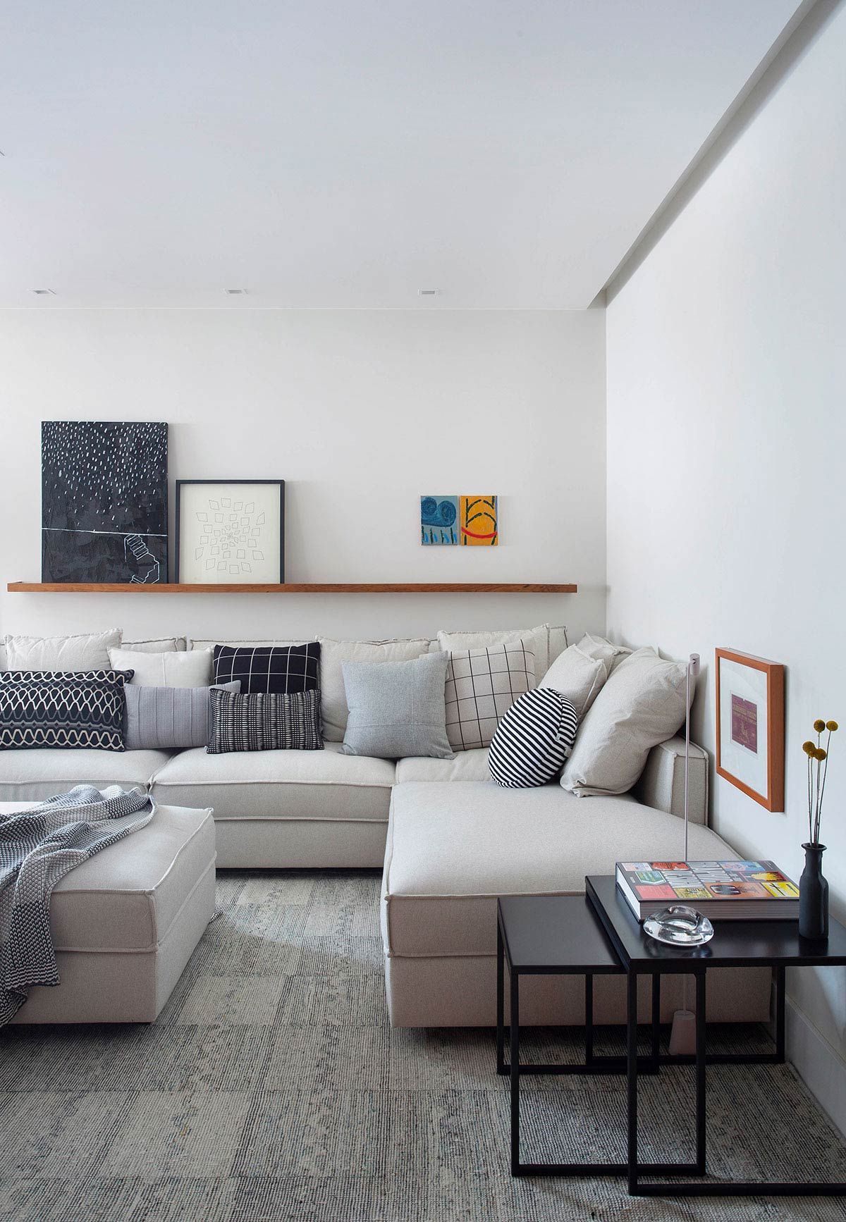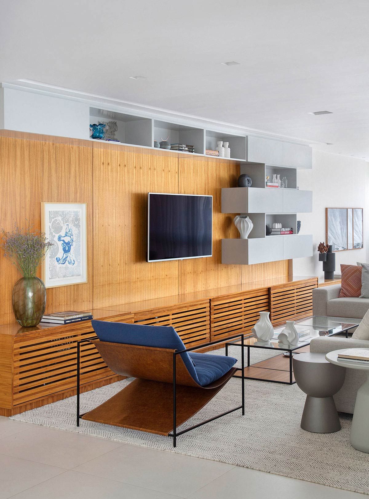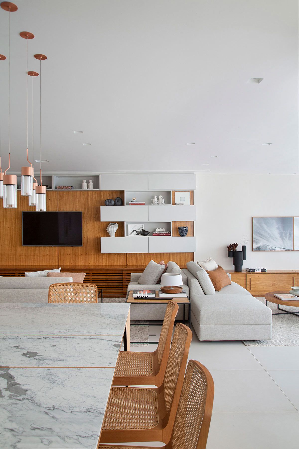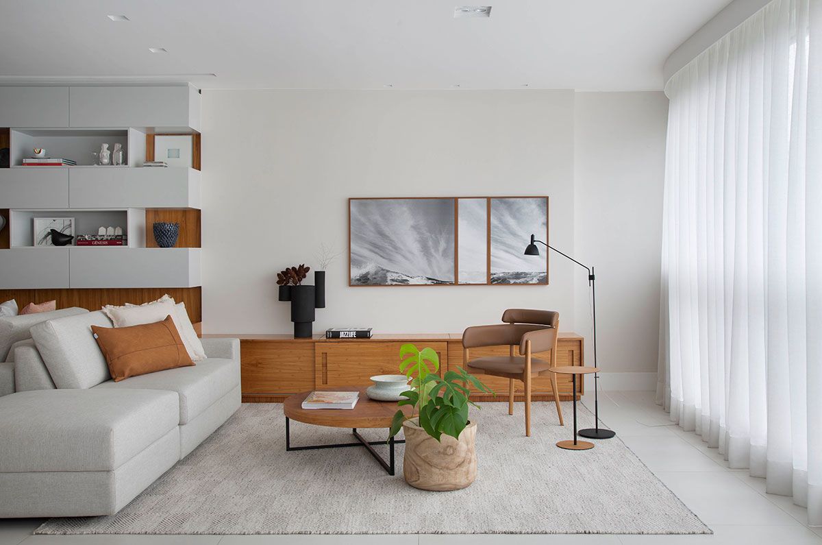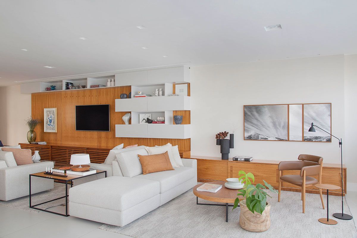 Foi um casamento de três anos no total, desde o projeto inicial desenvolvido pela planta da construtora, passando pelo acompanhamento da obra e escolha de todos os materiais, até a marcenaria e a produção final com os objetos e obras de arte; que resultou em um apê com decoração contemporânea e que atende todos os desejos dos proprietários.