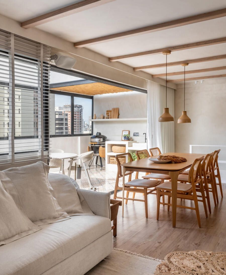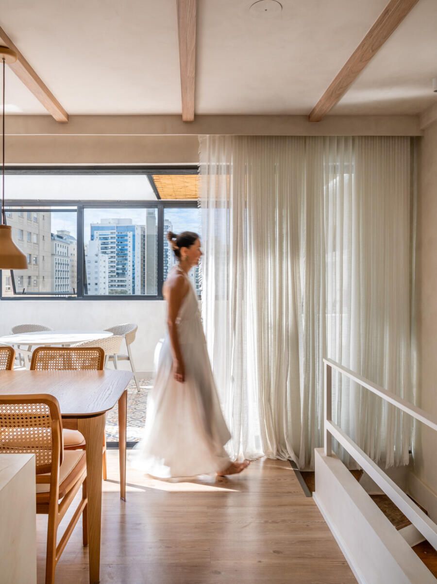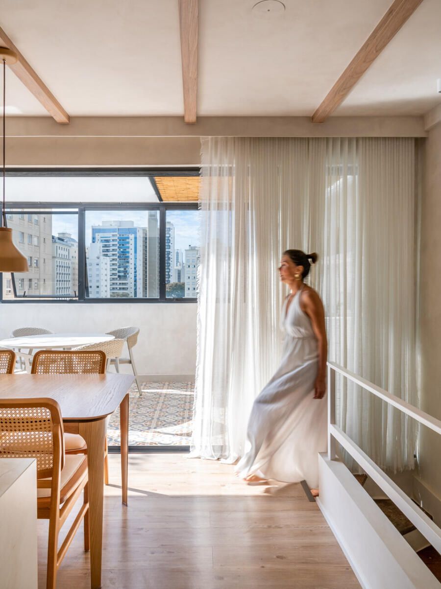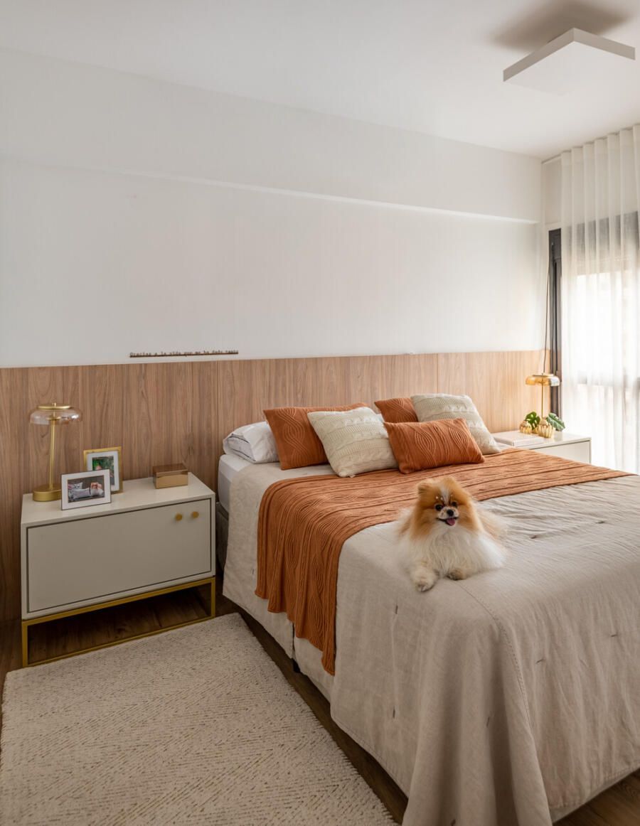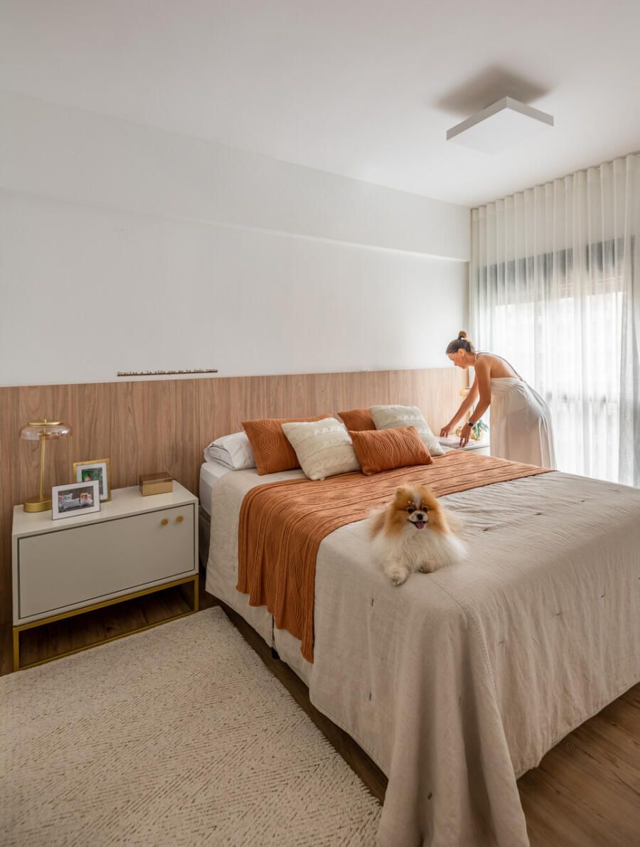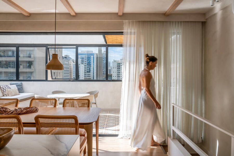 Localizada em Campinas, interior de São Paulo, esta cobertura de 135m² revela um projeto profundamente pessoal: ela foi idealizada e assinada pela arquiteta e moradora Veridiana Peres. O espaço nasceu do desejo de transformar um imóvel com planta tradicional, originalmente dividido em vários ambientes, em um lar fluido, acolhedor e com atmosfera de casa. Na época da mudança, o casal vivia com a Spitz Mel; hoje, quem ocupa esse lugar ao lado deles é o Blue, um pastor americano que também desfruta da rotina tranquila do apartamento.