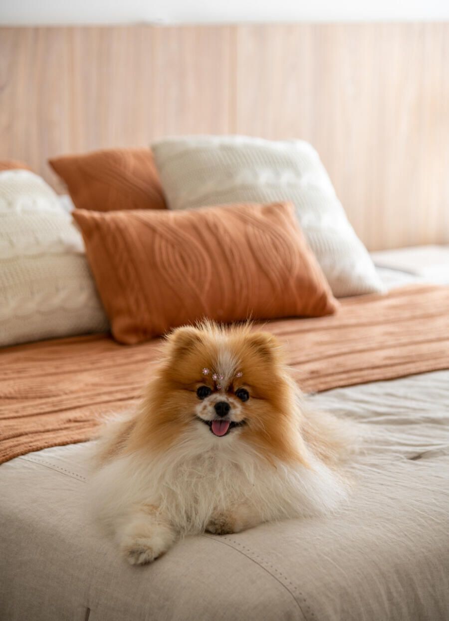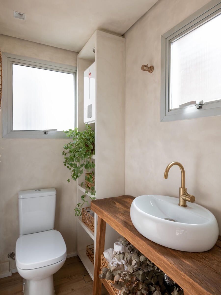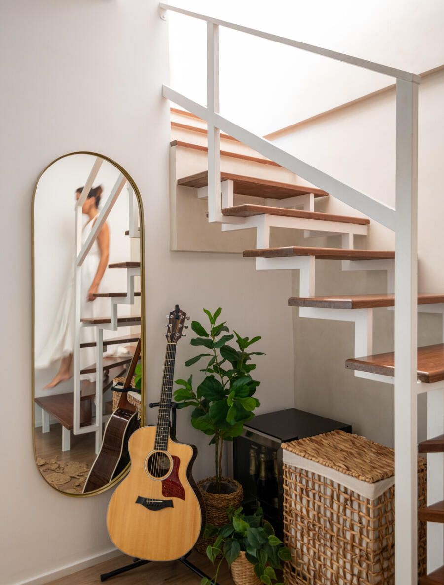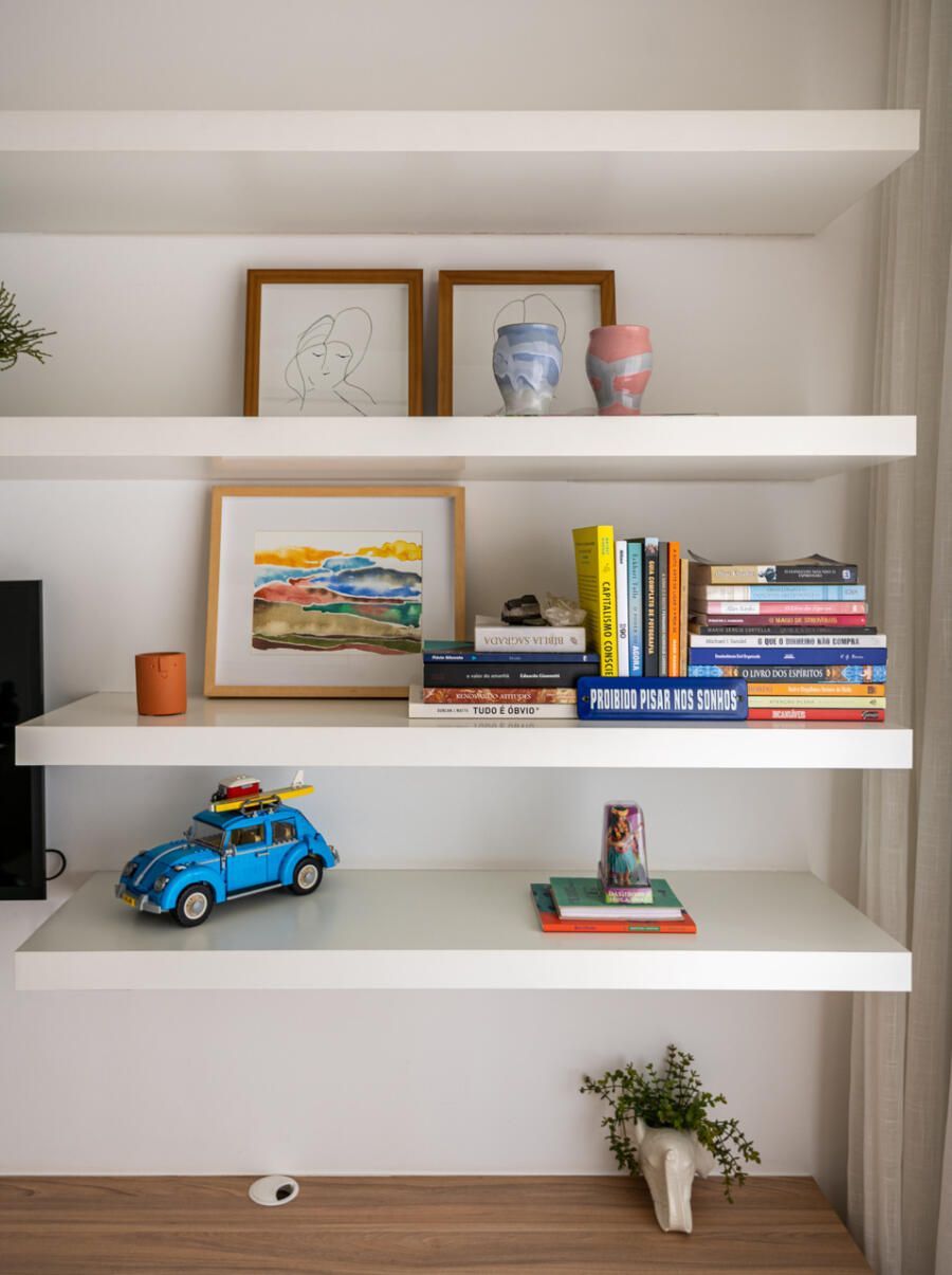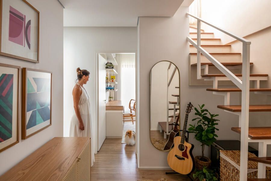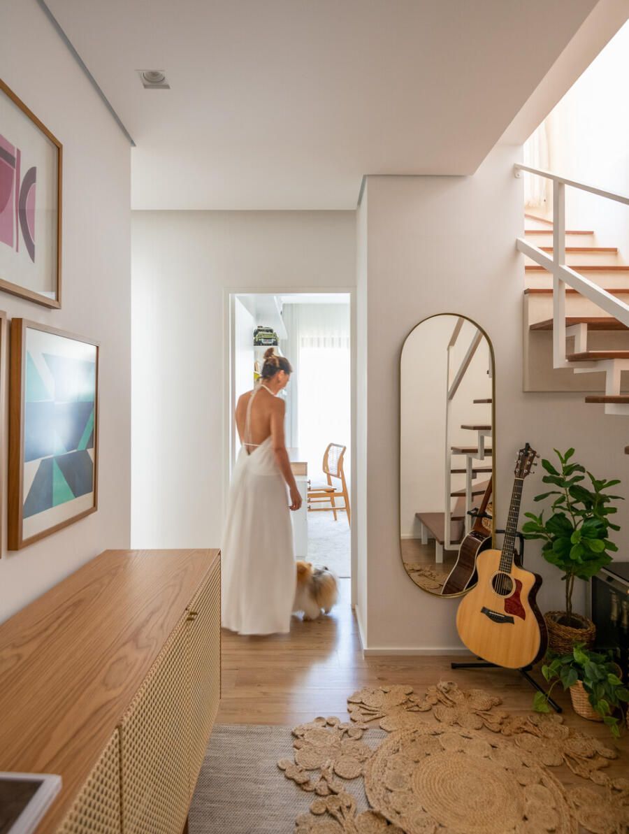 Localizada em Campinas, interior de São Paulo, esta cobertura de 135m² revela um projeto profundamente pessoal: ela foi idealizada e assinada pela arquiteta e moradora Veridiana Peres. O espaço nasceu do desejo de transformar um imóvel com planta tradicional, originalmente dividido em vários ambientes, em um lar fluido, acolhedor e com atmosfera de casa. Na época da mudança, o casal vivia com a Spitz Mel; hoje, quem ocupa esse lugar ao lado deles é o Blue, um pastor americano que também desfruta da rotina tranquila do apartamento.