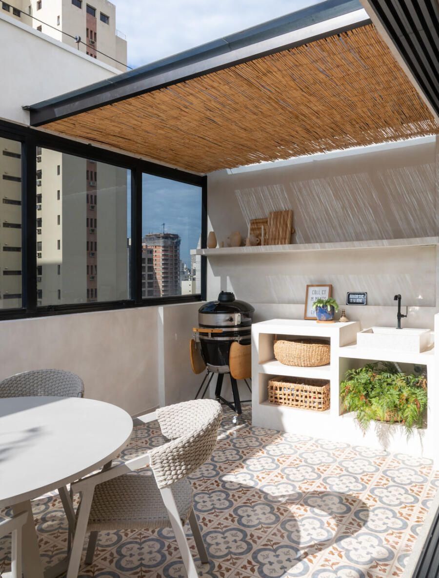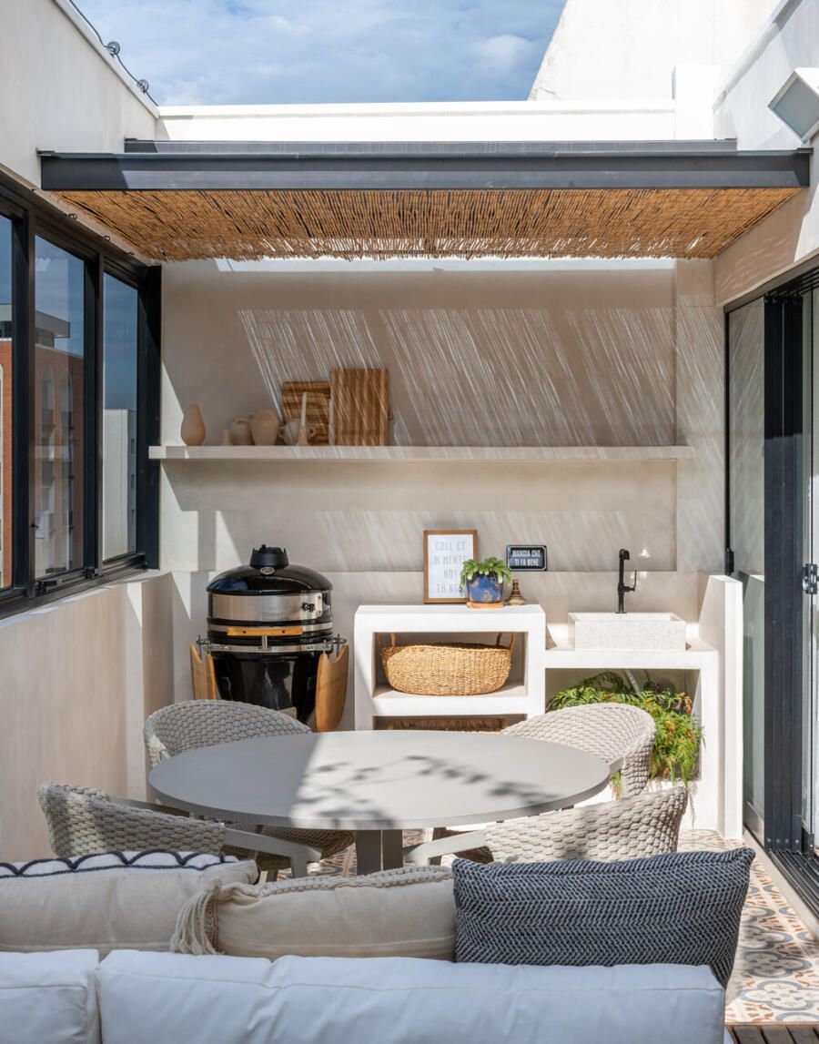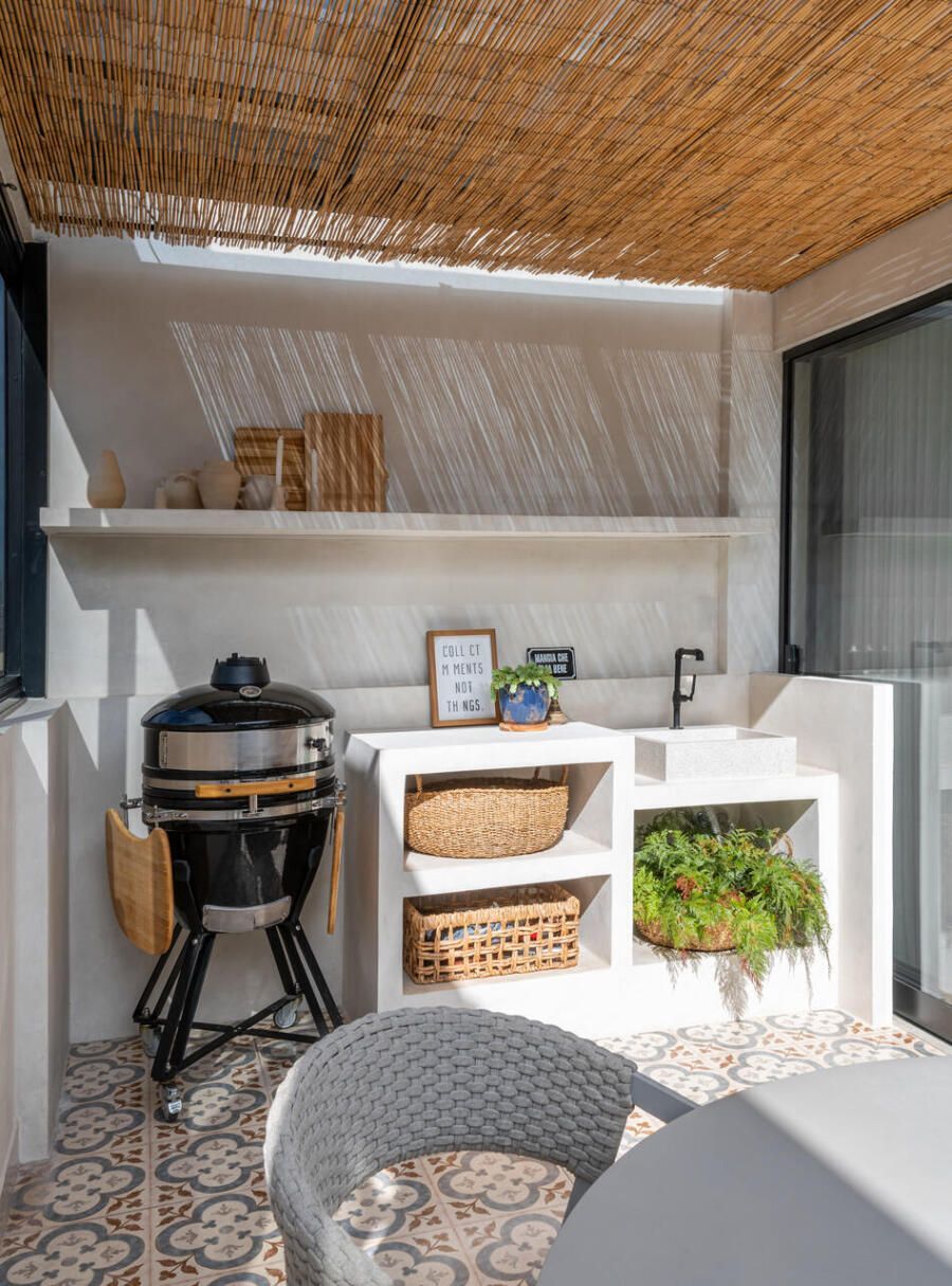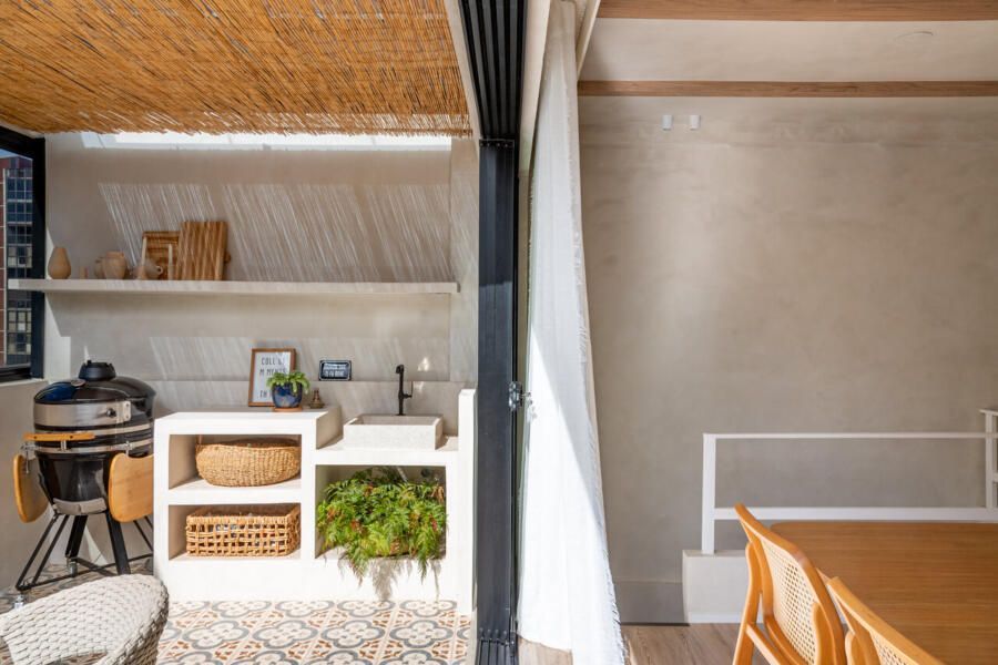 A área externa se tornou uma extensão natural da sala. A pintura das paredes foi mantida exatamente igual tanto no interior quanto no exterior, uma estratégia simples que reforça a sensação de continuidade entre os ambientes. A luz natural percorre todo o espaço, enquanto plantas, tramas e materiais naturais ajudam a construir uma atmosfera descontraída e acolhedora.