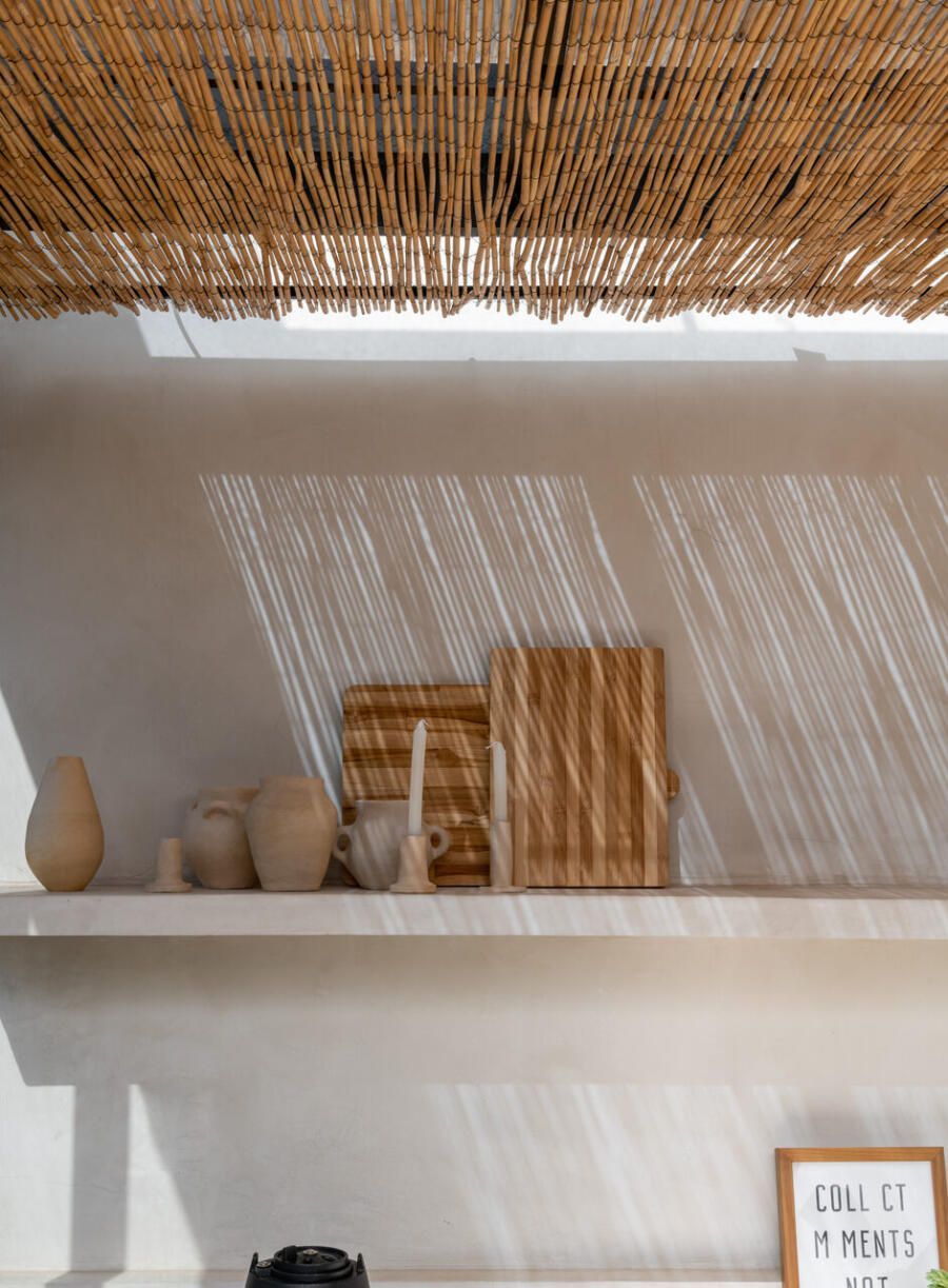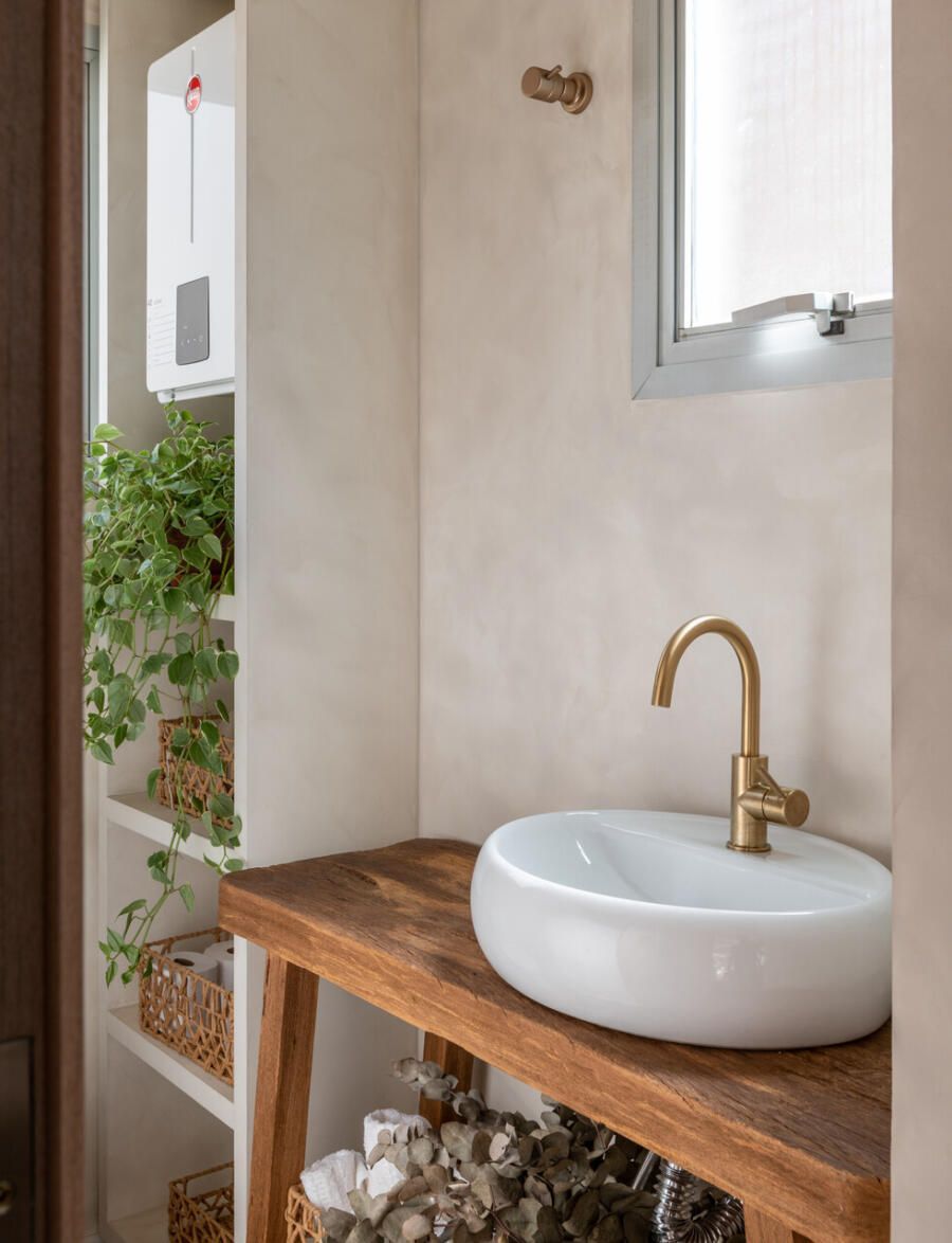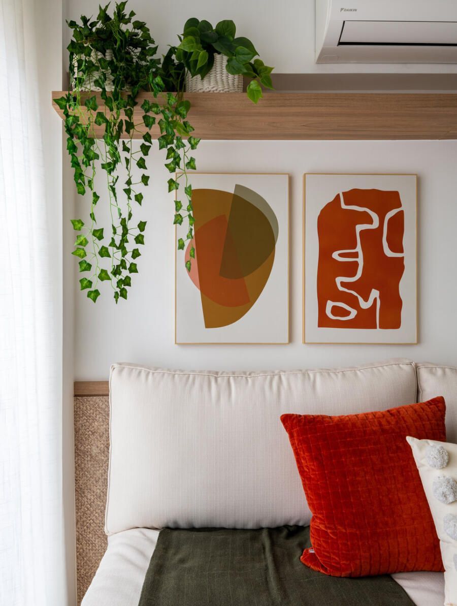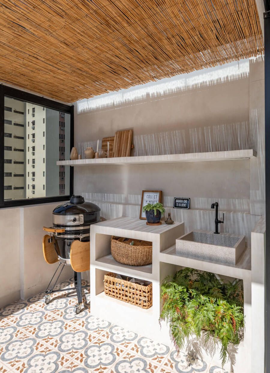 A área externa se tornou uma extensão natural da sala. A pintura das paredes foi mantida exatamente igual tanto no interior quanto no exterior, uma estratégia simples que reforça a sensação de continuidade entre os ambientes. A luz natural percorre todo o espaço, enquanto plantas, tramas e materiais naturais ajudam a construir uma atmosfera descontraída e acolhedora.