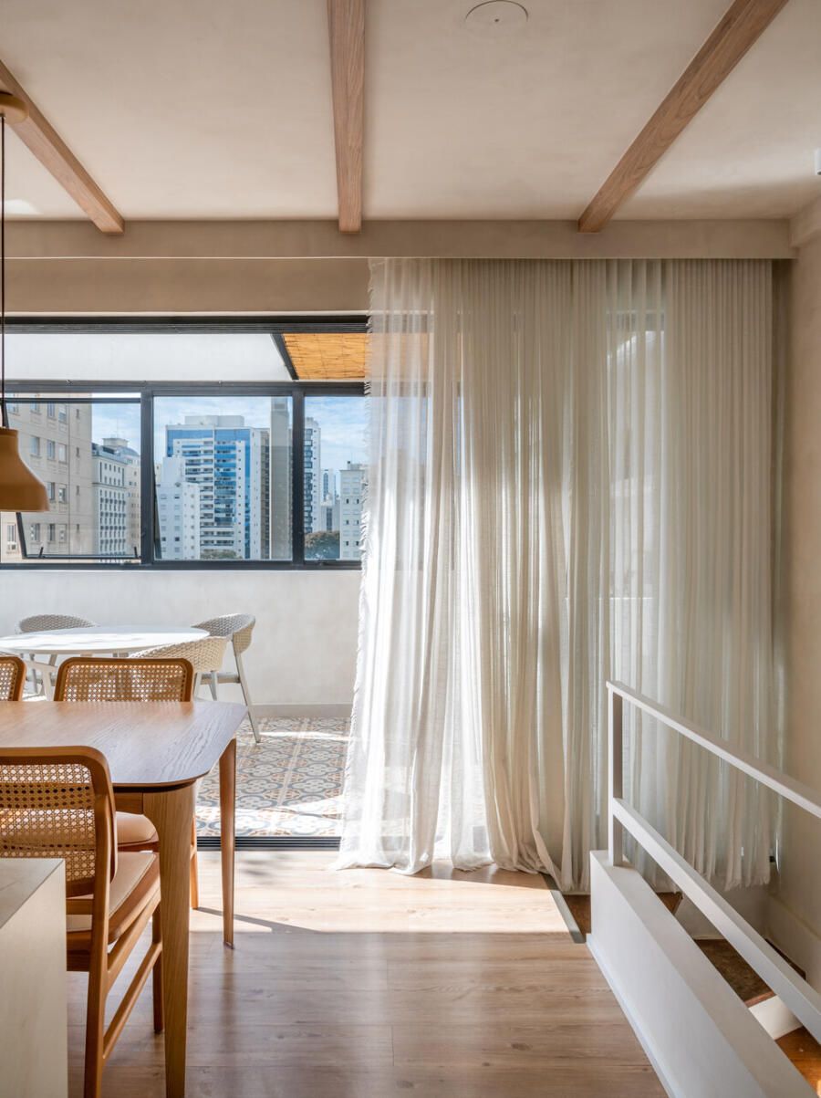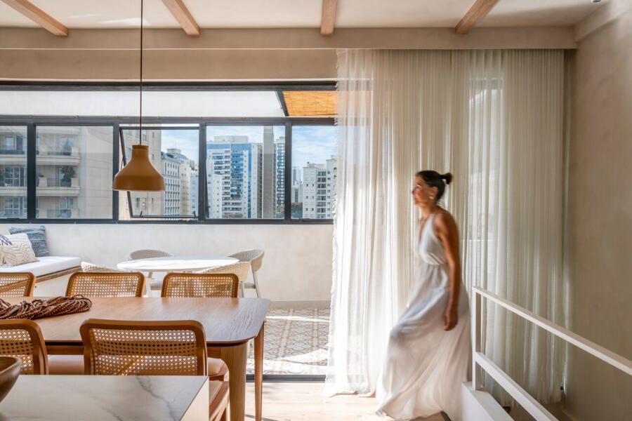 A busca pelo imóvel começou justamente pelo desejo de encontrar um apartamento que oferecesse algum respiro ao ar livre. Quando este apareceu, chamou atenção imediatamente pela disposição incomum: toda a área íntima ocupa o pavimento inferior, enquanto o andar superior concentra a vida social da casa, com acesso de elevador em ambos os níveis. A configuração revelou um enorme potencial de transformação e abriu caminho para que o casal moldasse o espaço exatamente como imaginava.