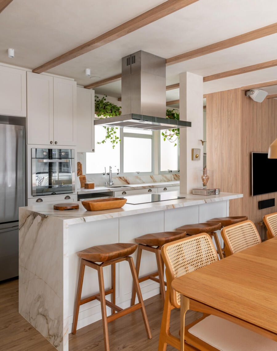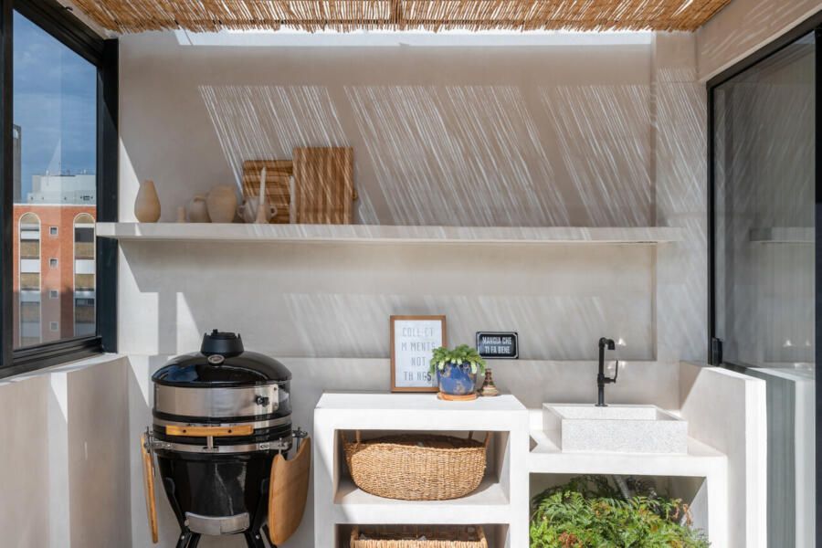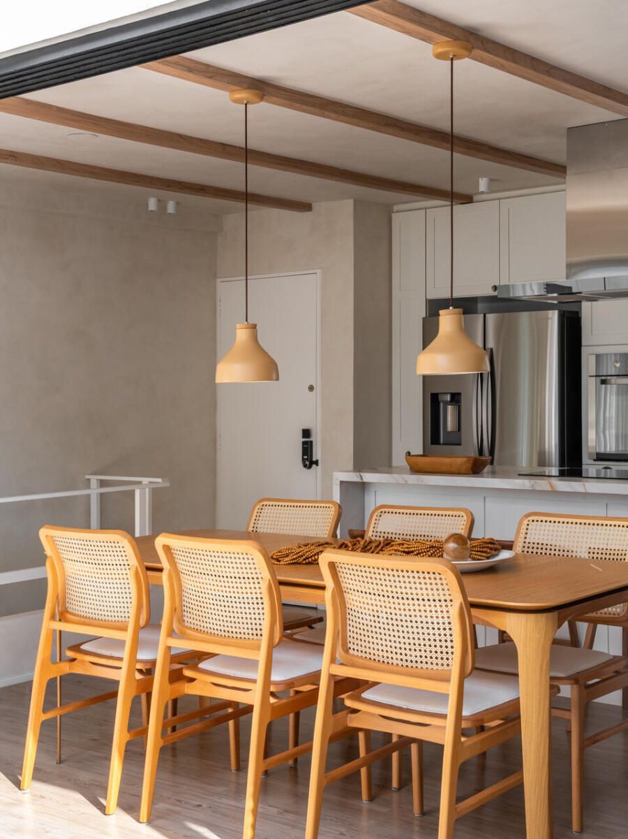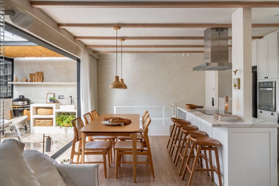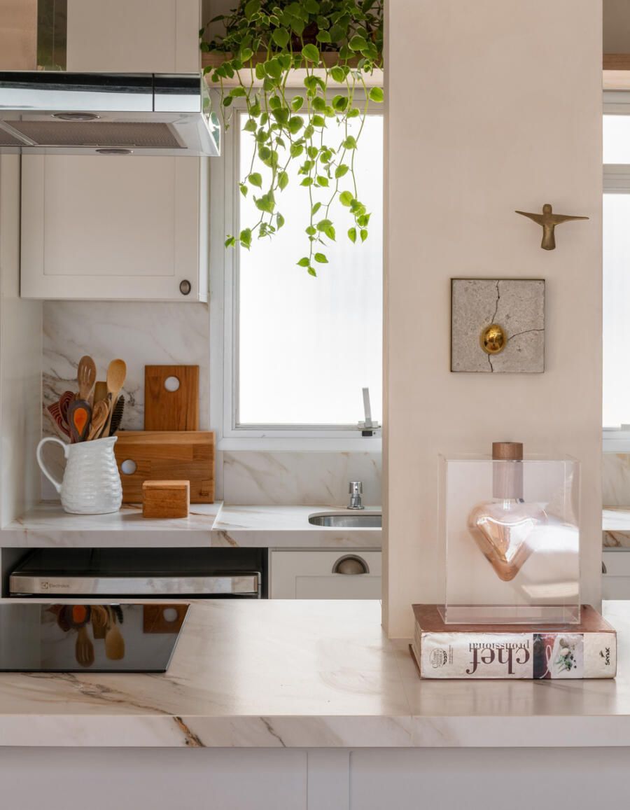 Outro ponto central do projeto é a cozinha, completamente aberta para a área social. A escolha reflete o estilo de vida dos moradores, que gostam de cozinhar e receber ao mesmo tempo. Hoje, o apartamento funciona como cenário para encontros com amigos e família, mas também como refúgio para os momentos mais silenciosos do casal.