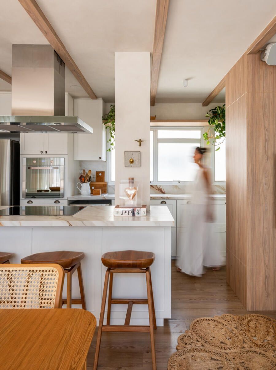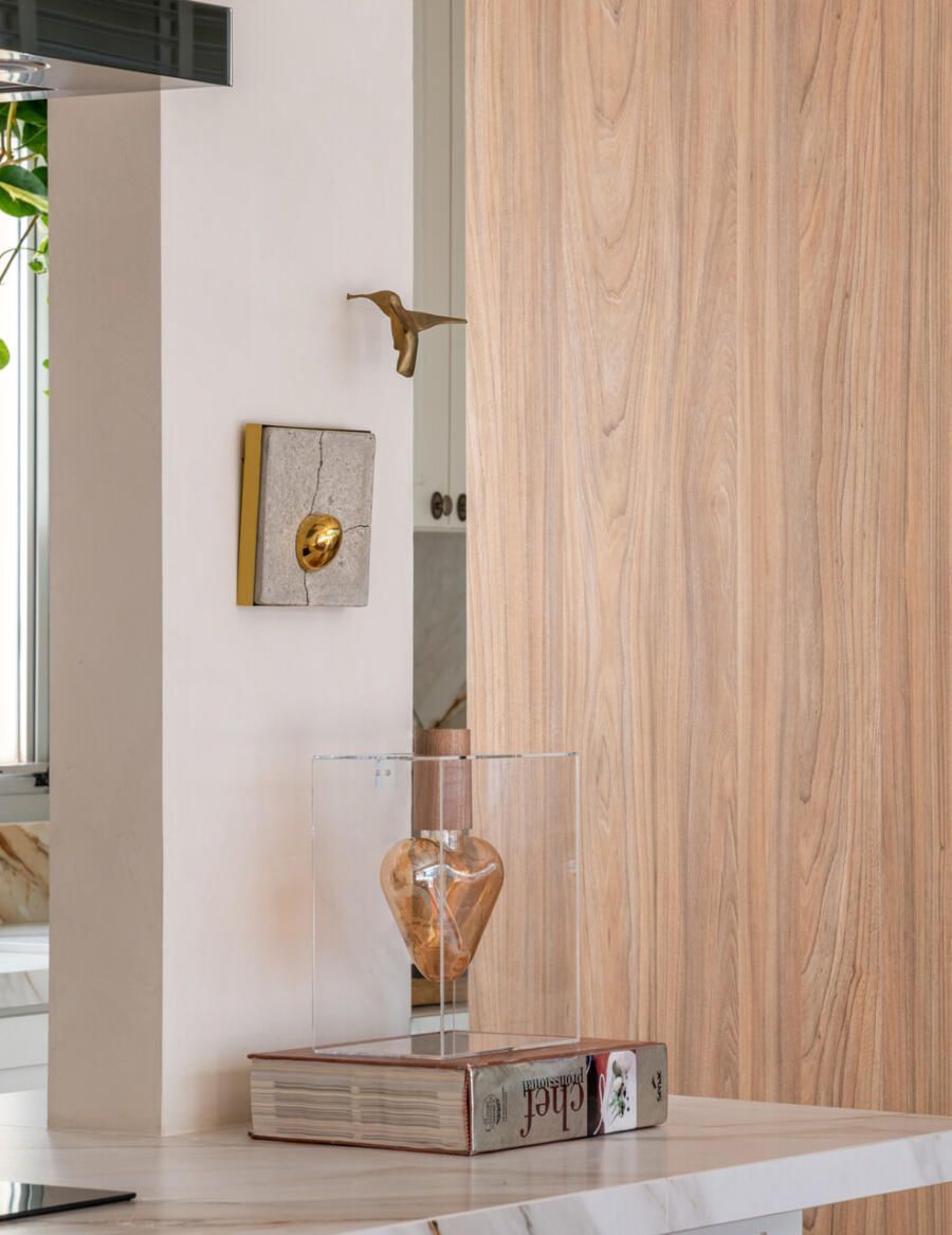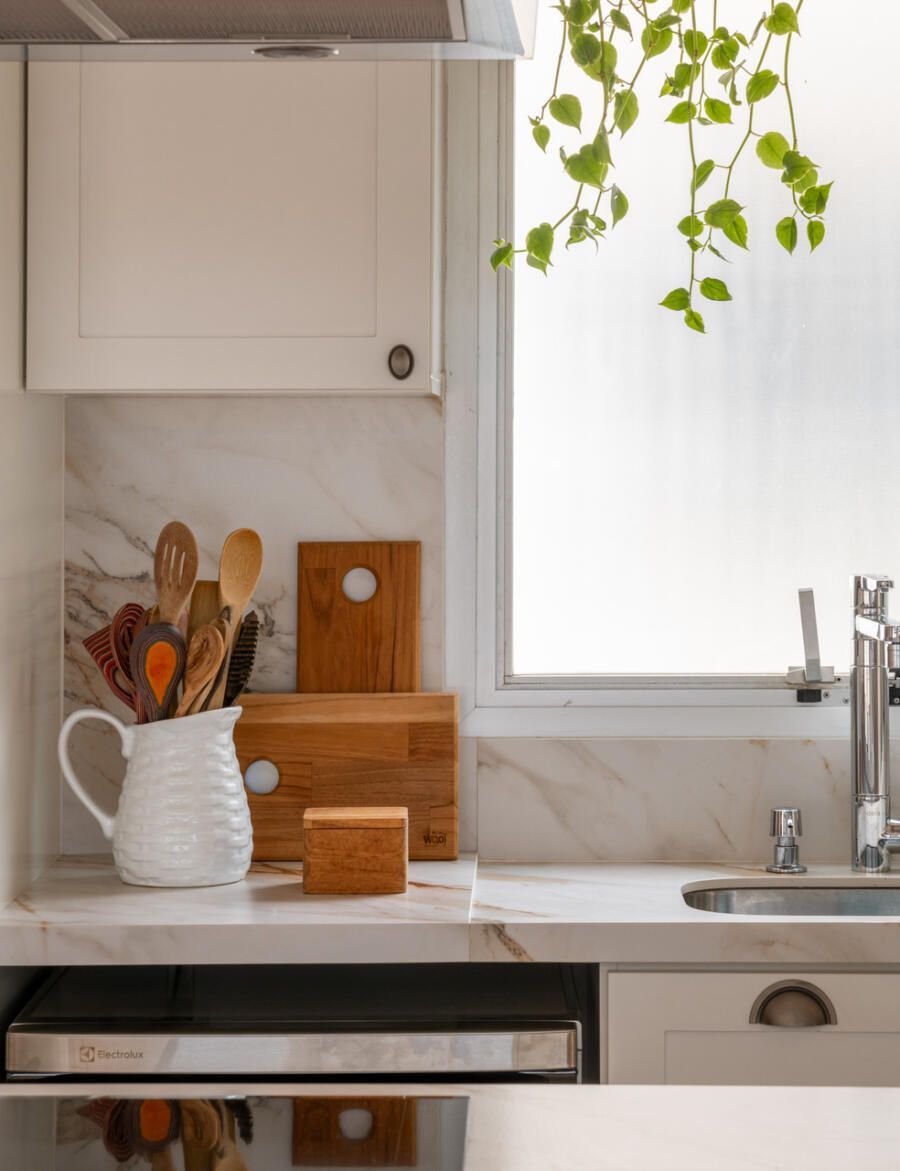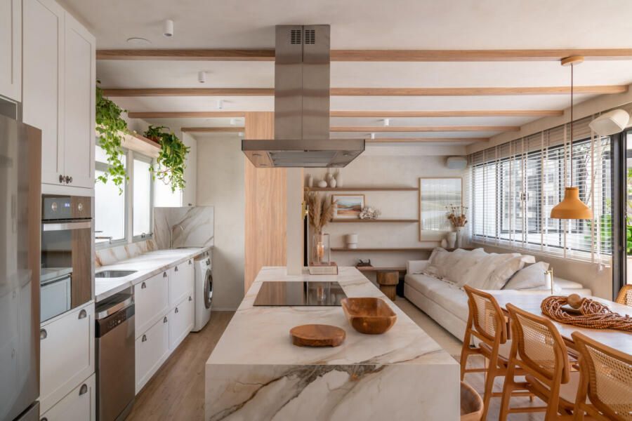 Outro ponto central do projeto é a cozinha, completamente aberta para a área social. A escolha reflete o estilo de vida dos moradores, que gostam de cozinhar e receber ao mesmo tempo. Hoje, o apartamento funciona como cenário para encontros com amigos e família, mas também como refúgio para os momentos mais silenciosos do casal.