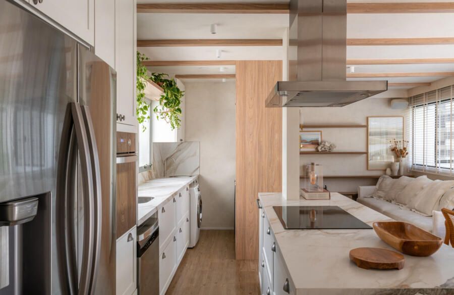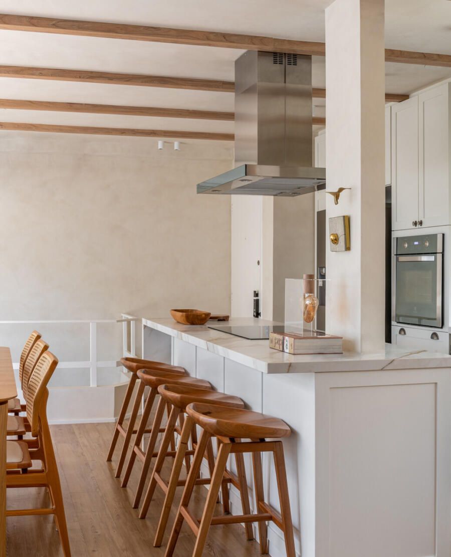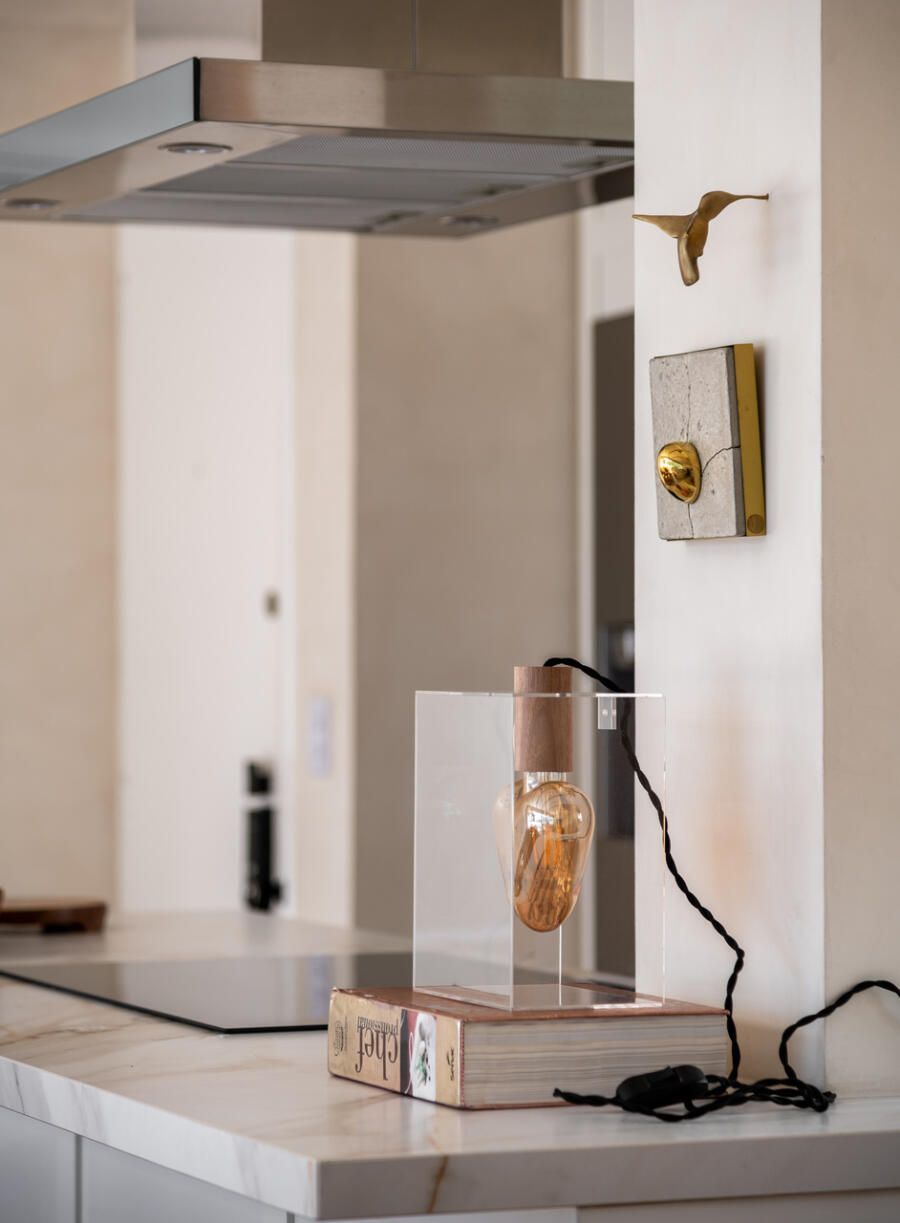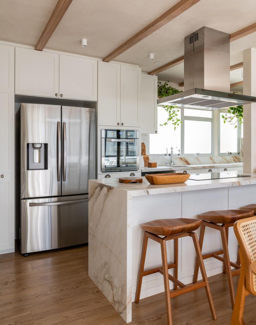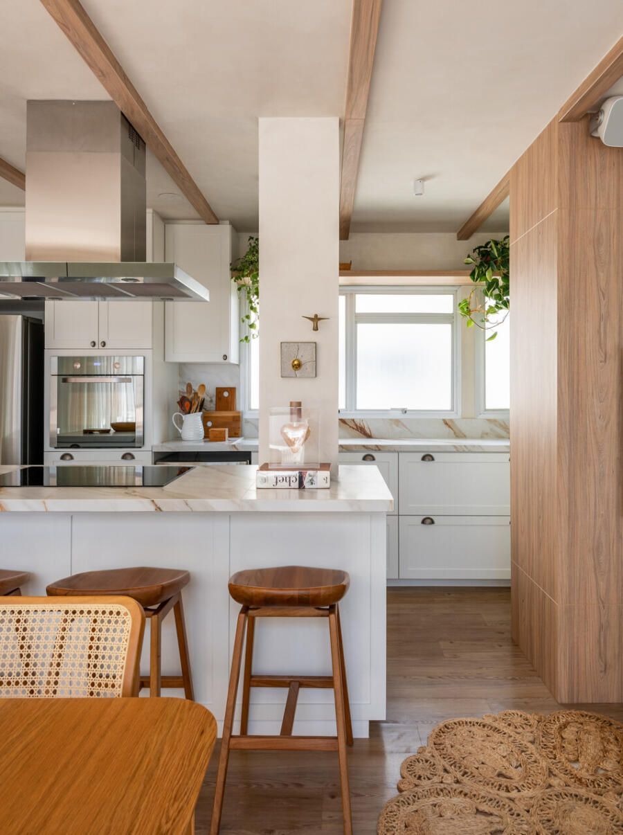 Outro ponto central do projeto é a cozinha, completamente aberta para a área social. A escolha reflete o estilo de vida dos moradores, que gostam de cozinhar e receber ao mesmo tempo. Hoje, o apartamento funciona como cenário para encontros com amigos e família, mas também como refúgio para os momentos mais silenciosos do casal.