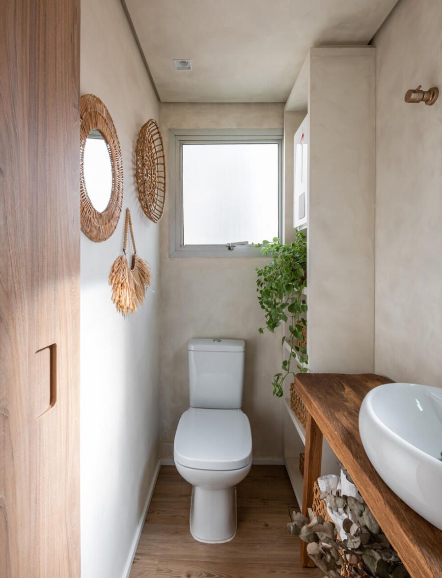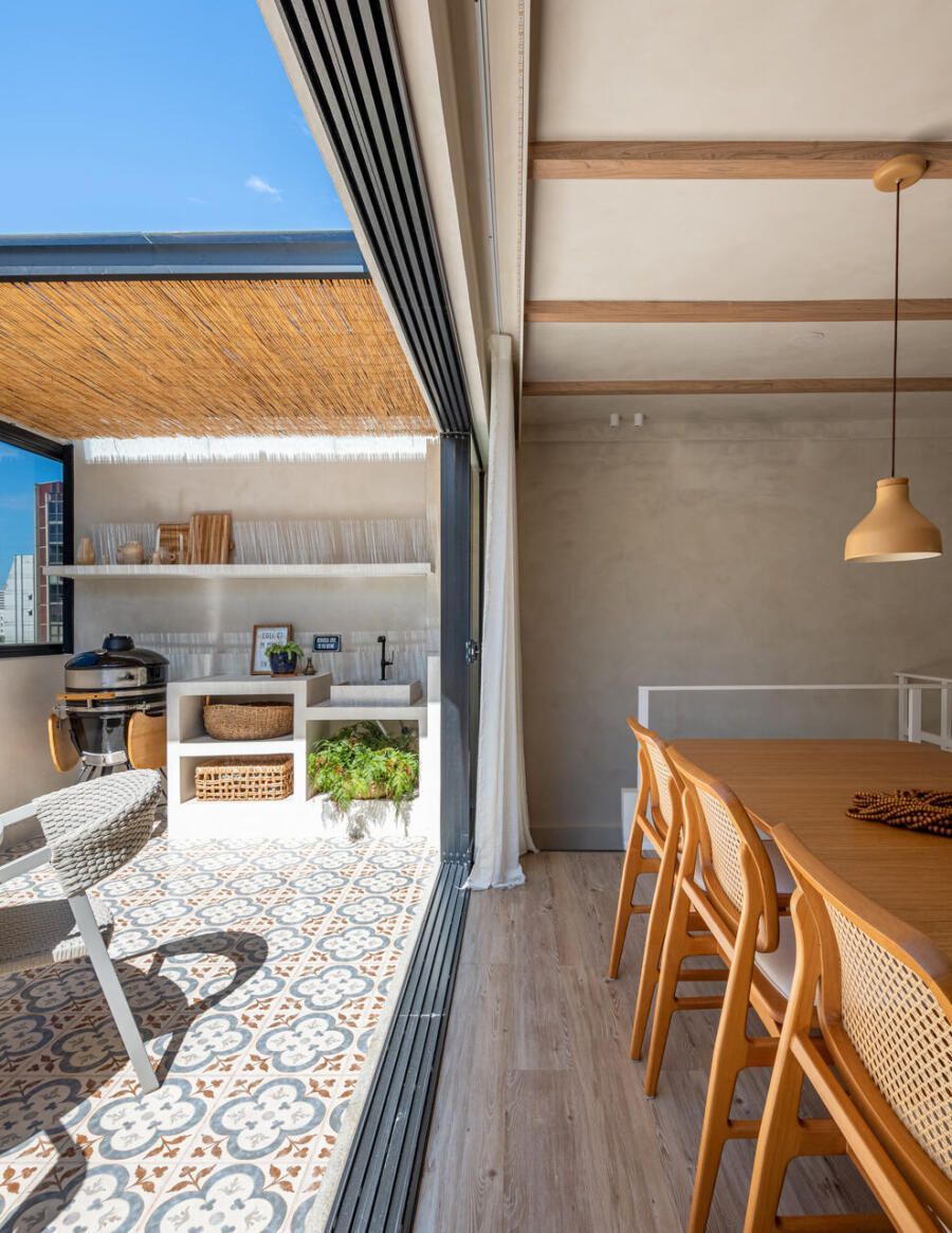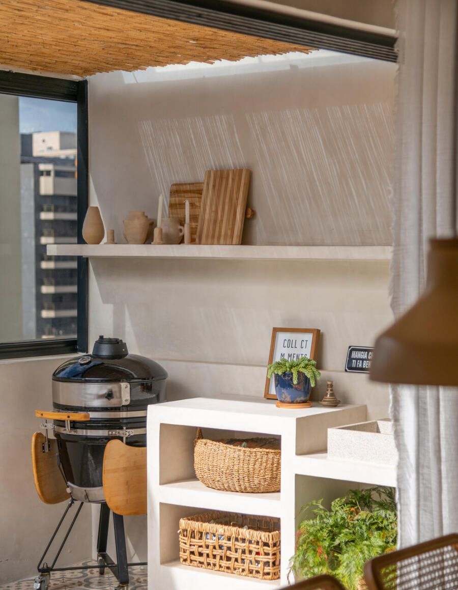 “Nosso apartamento ficou exatamente como sonhávamos: com a área social aberta e integrada a área externa, muita iluminação natural, área descoberta com plantas, materiais e tramas naturais, a pintura das paredes foi a mesma tanto na área interna como na externa para reforçar essa integração. A cozinha totalmente aberta para a área social para podermos cozinhar e receber estando sempre junto com nossos amigos. “