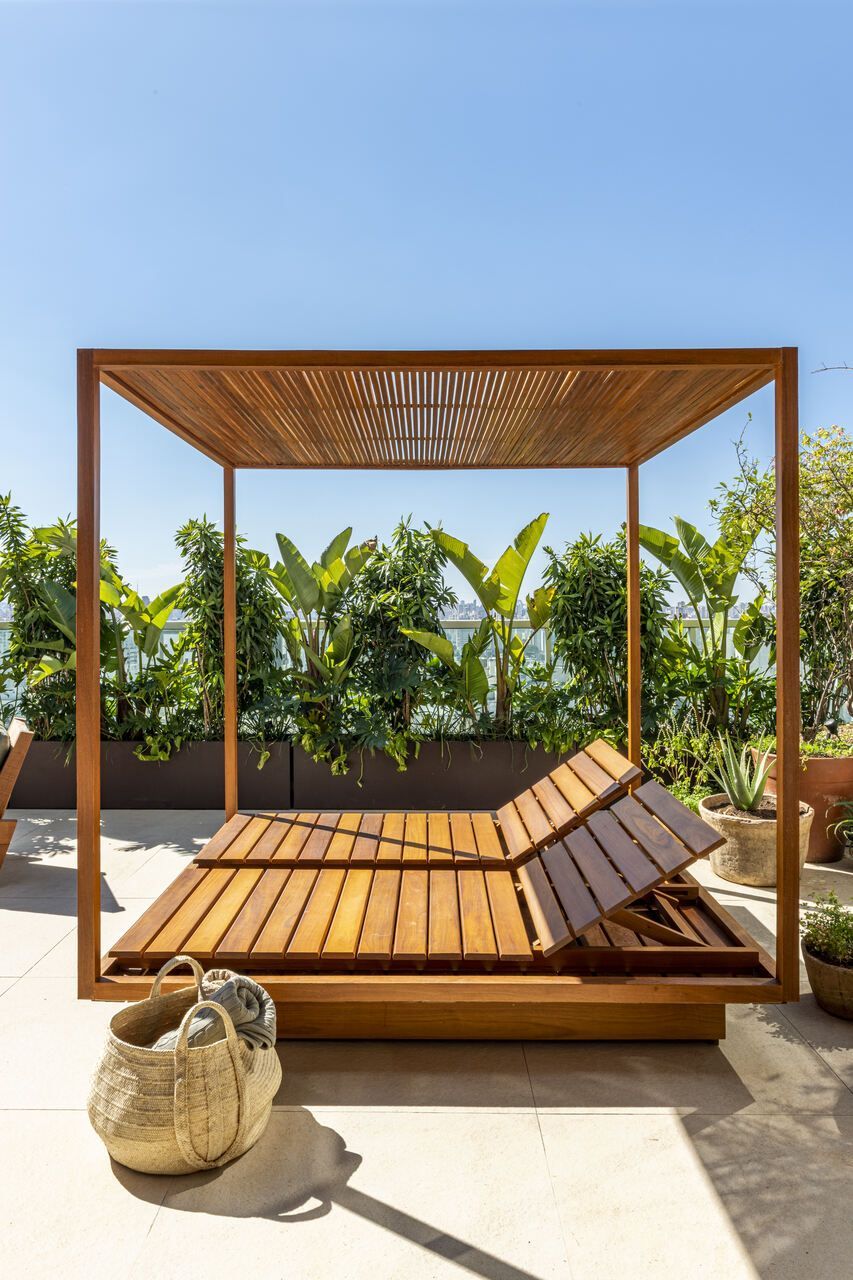 A lareira em aço corten proporciona conforto térmico e um convite a conversas na cobertura durante as épocas mais frias do ano, enquanto um gazebo feito sob medida oferece sombra e descanso no verão. Sobre os principais desafios, os arquitetos ainda comentam: