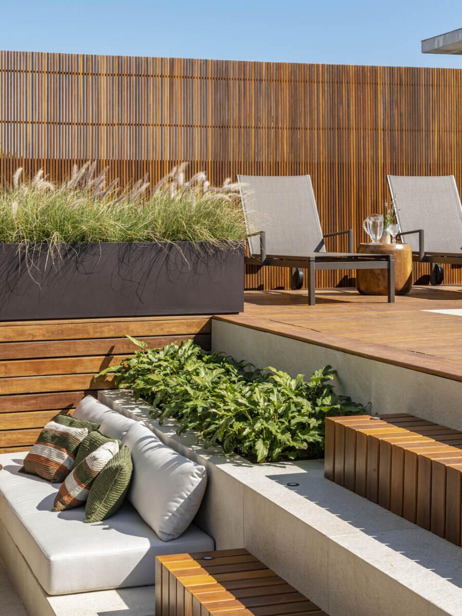 Os degraus da arquibancada são intercalados por concreto e madeira, criando uma atmosfera despojada na cobertura. O mobiliário segue essa mesma tendência, com cores neutras e verdes e materiais práticos por se tratar de uma área externa descoberta.